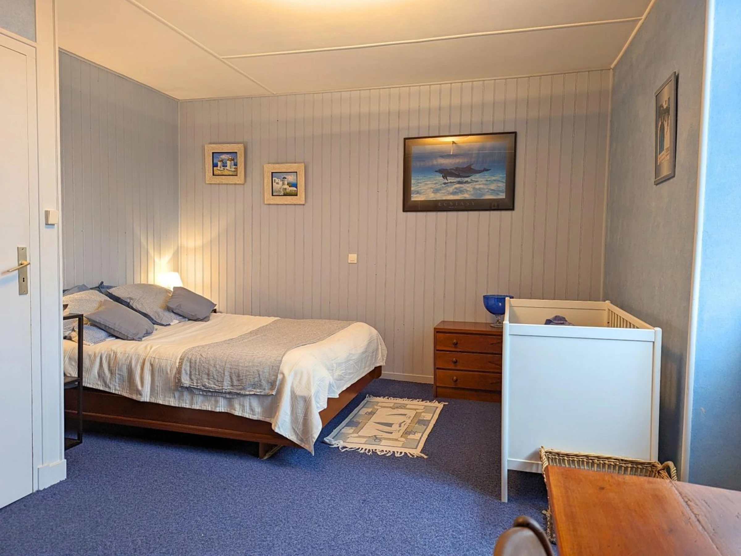 Équipements bébé : 2 lits, baignoire, matelas à langer, chaise haute.