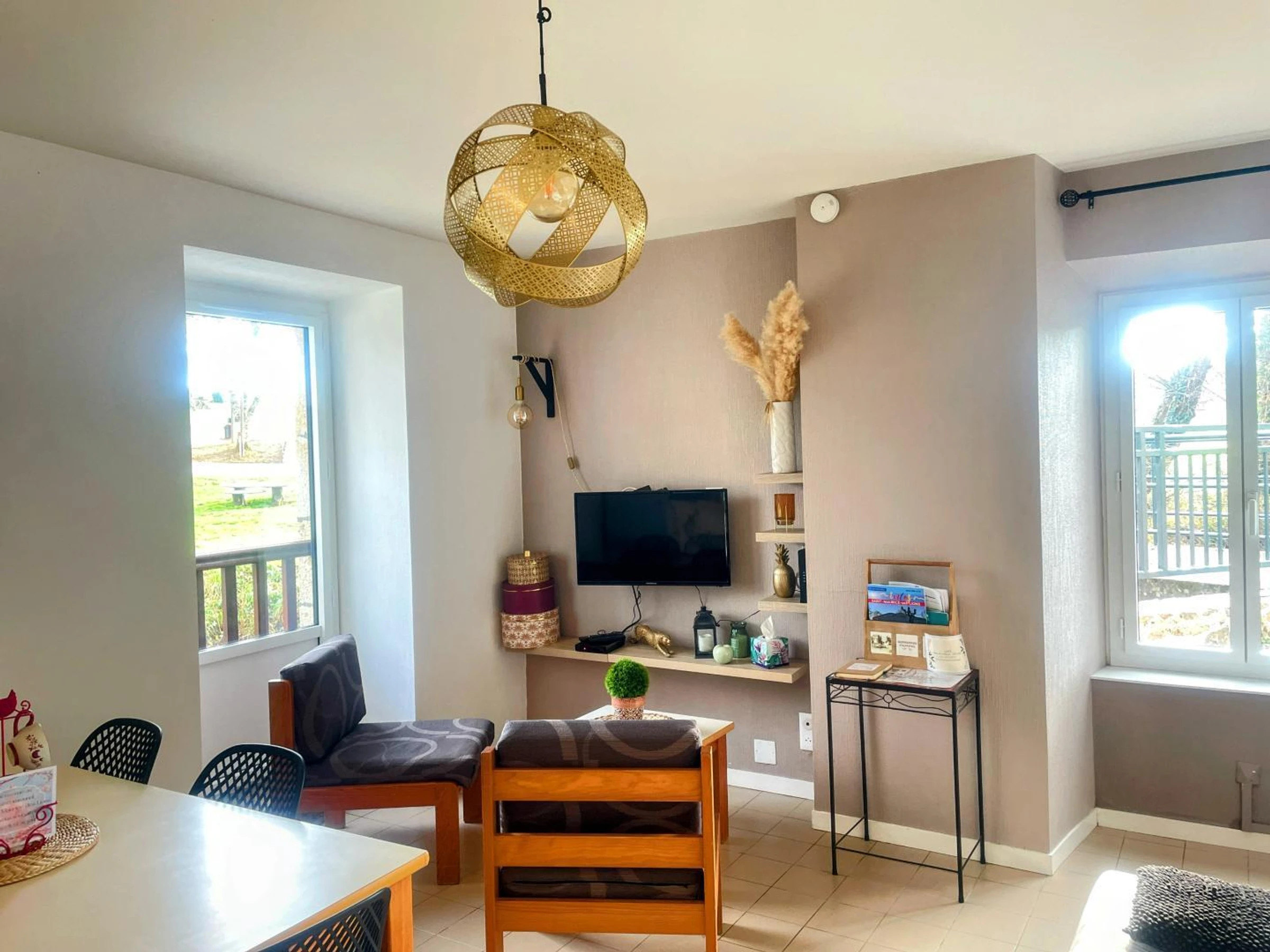 Terrasse privative surplombant la rivière de 8 m², 2ème terrasse devant le gîte de 16 m², terrain communal non clos. Aire de jeux à 100 mètres. Possibilité de pêcher dans le Goire (truites, gardons).