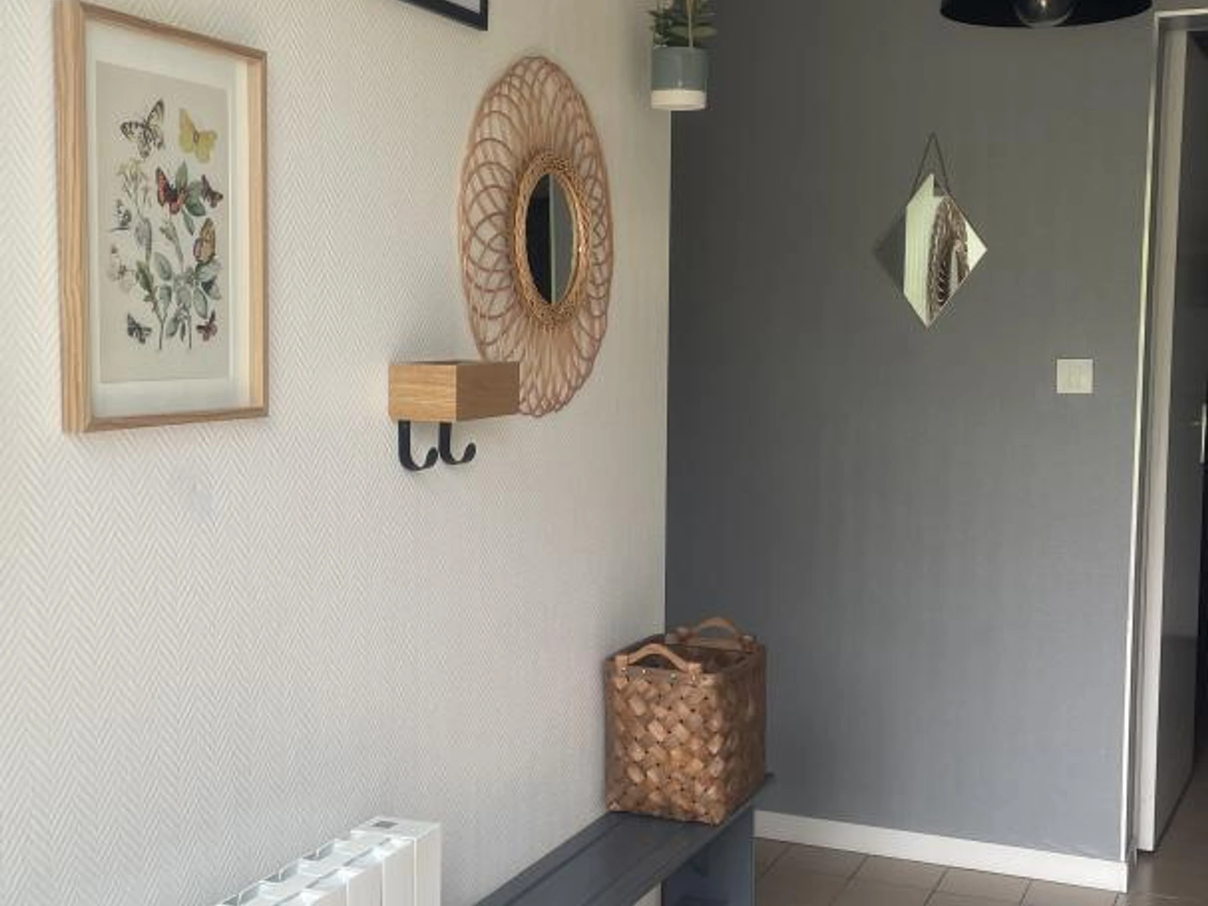 Entrée, 2 grands placards, séjour avec clic-clac 2 personnes et cuisine (plaques à induction), lave-vaisselle, lave-linge, une chambre avec lit 140, grand placard, une chambre avec 2 lits 90 et une banquette-lit 1 personne, grand placard, salle d'eau, wc.