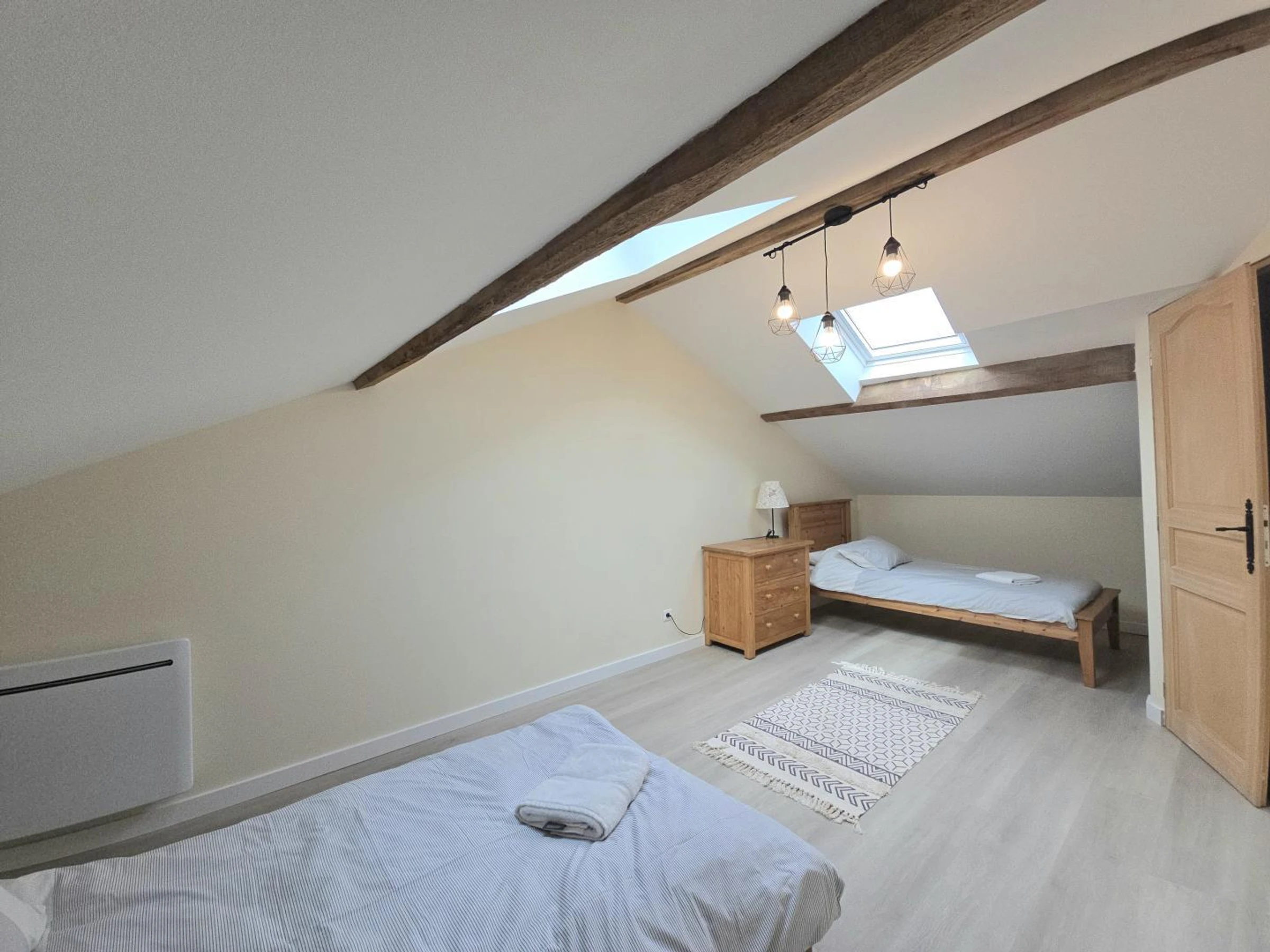 Au rez de chaussée, vous disposerez d'une grande pièce de vie avec cuisine équipée ( 4 feux gaz, four, lave vaisselle, réfrigérateur-congélateur...), un espace salle à manger, et un espace salon avec un canapé d'angle 5 places et un canapé 2 places, pas de TV. Au 1er étage, vous disposerez d'une première chambre avec un lit en 140x190, une salle d'eau attenante avec cabine de douche, une vasque, un WC. Une deuxième chambre avec un lit en 140x190. Puis une salle de bain avec une baignoire, une vasque, et un WC. Au 2ème étage, une chambre mansardée avec 2 lits de 90x190.