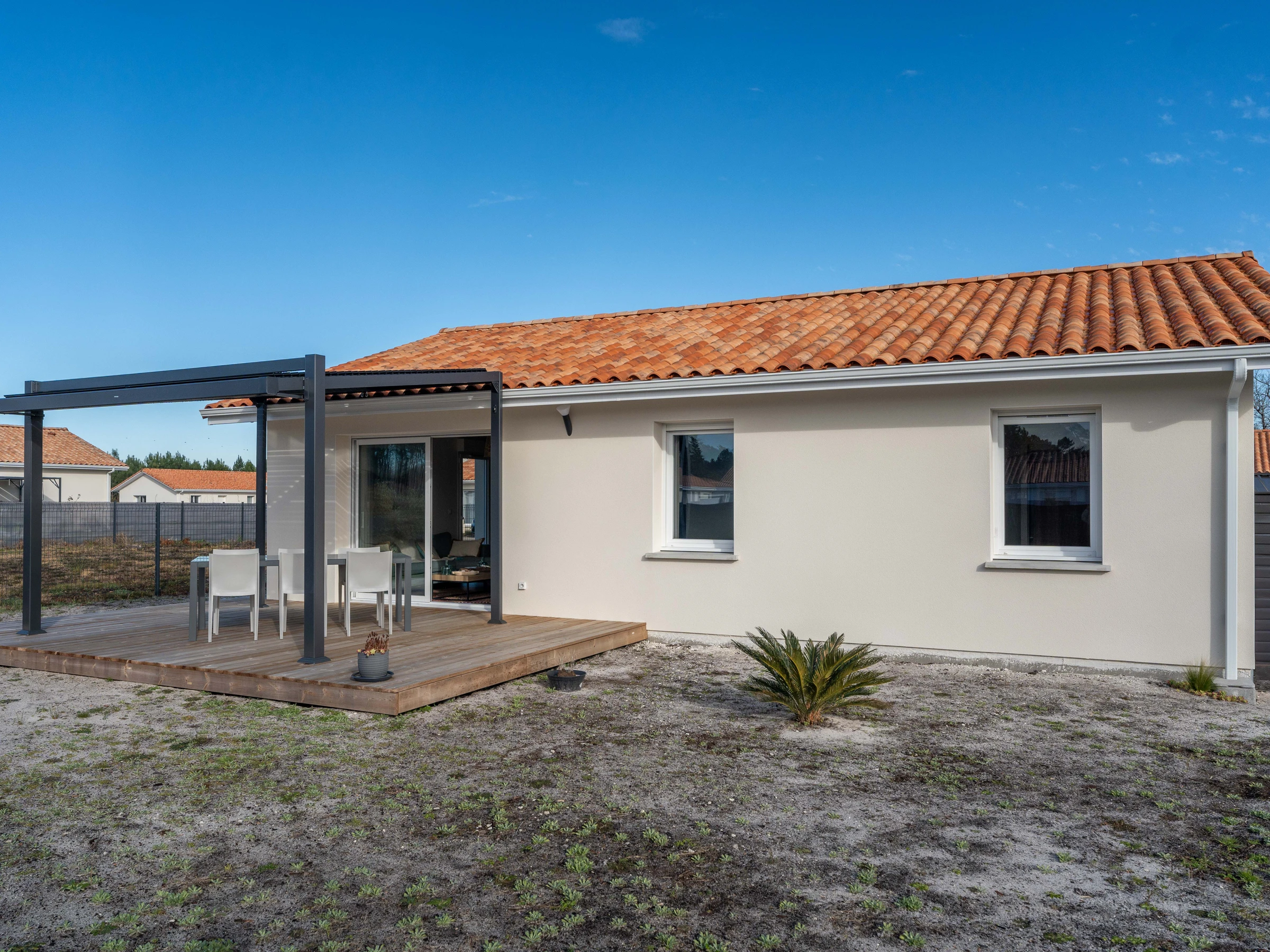 À l’extérieur, une belle terrasse avec pergola, salon de jardin, barbecue et transats vous attend pour des moments de détente en plein air. Le jardin est clos, parfait pour les enfants.