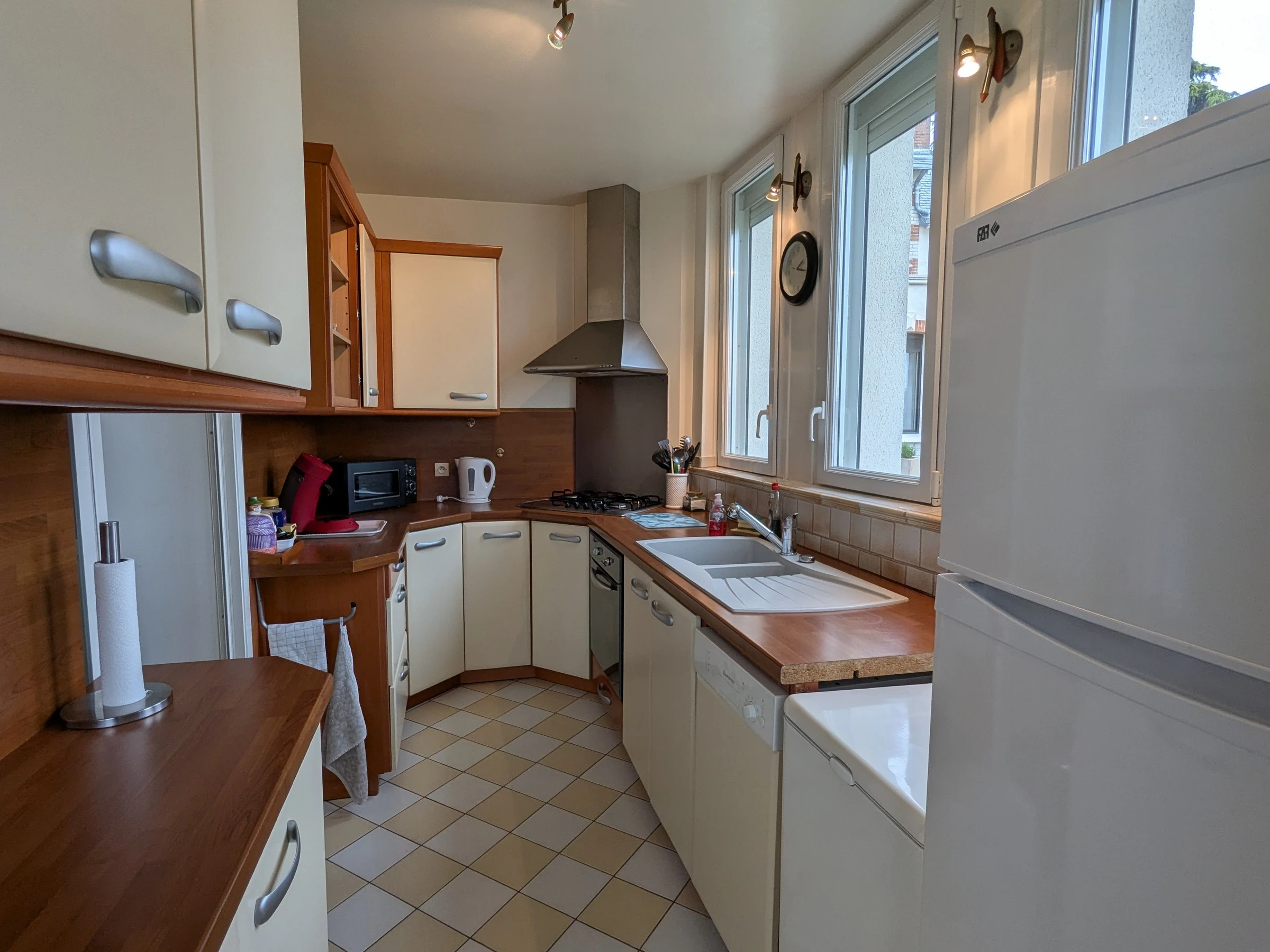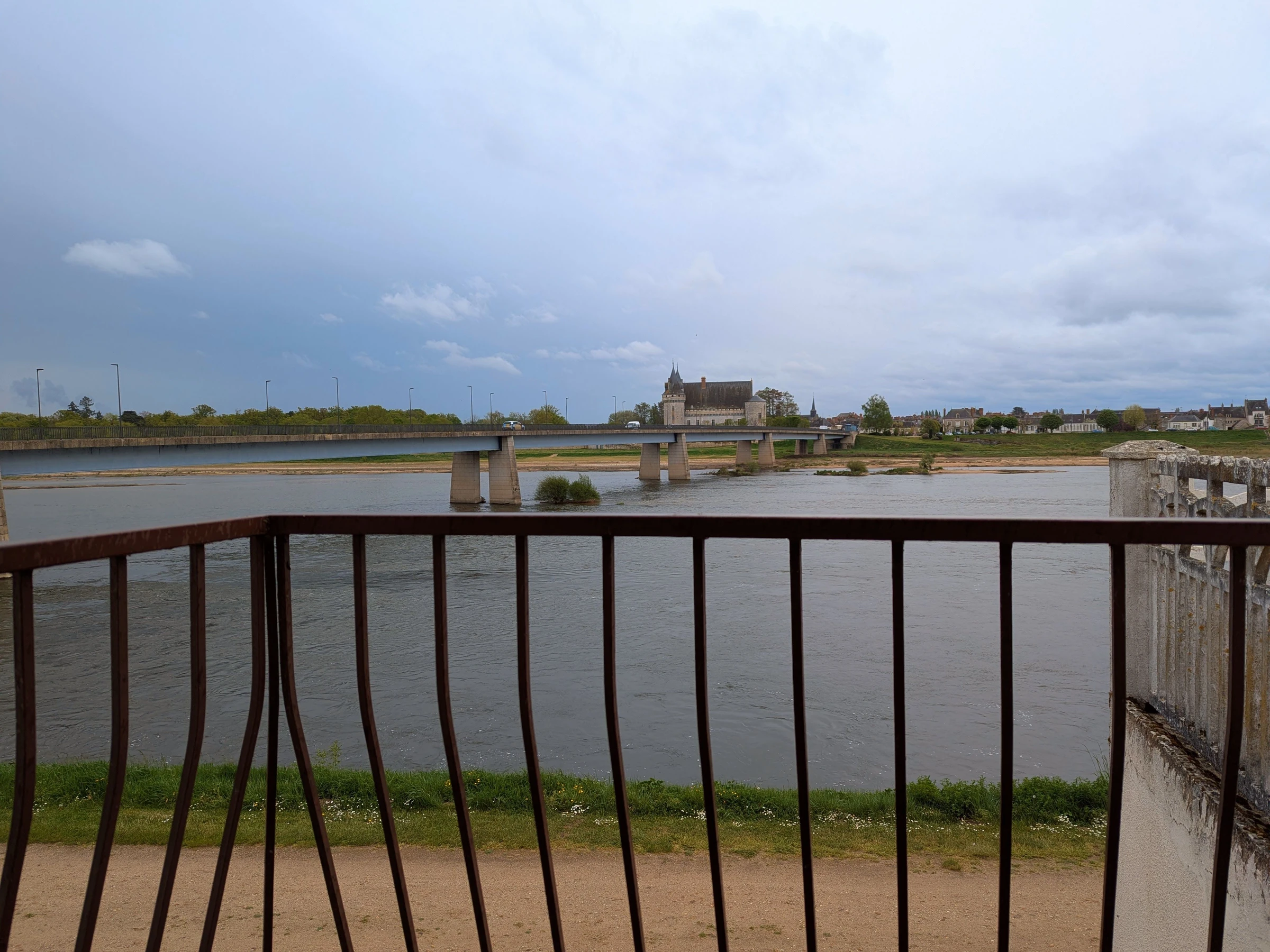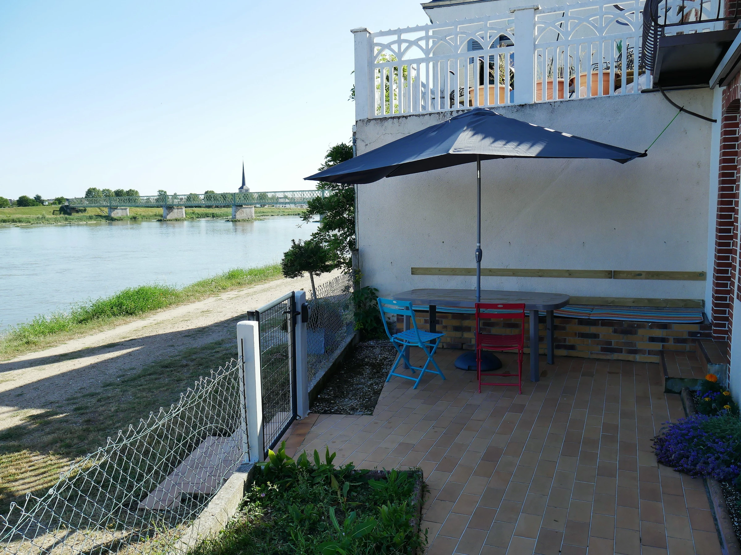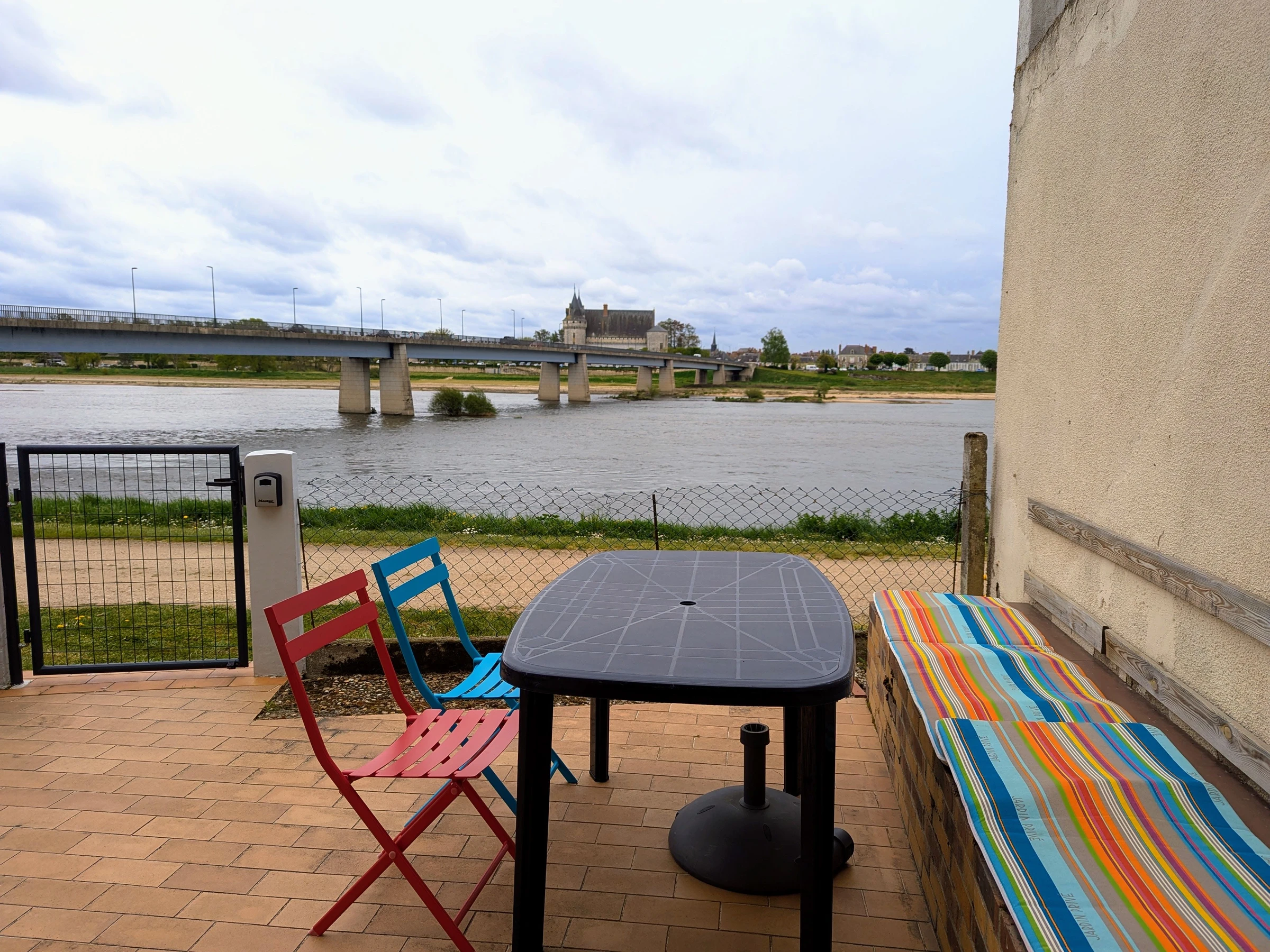 Terrasse avec vue sur Loire et petit coin de pelouse (80m²). AU REZ-DE-CHAUSSÉE, vous trouverez un grand salon / salle à manger et une cuisine séparée équipée, wc séparé.