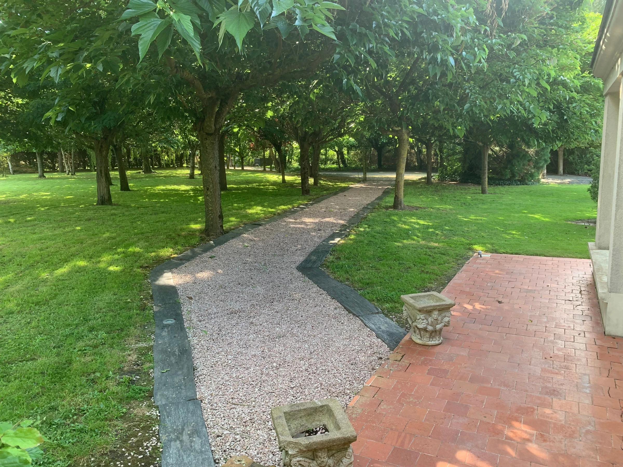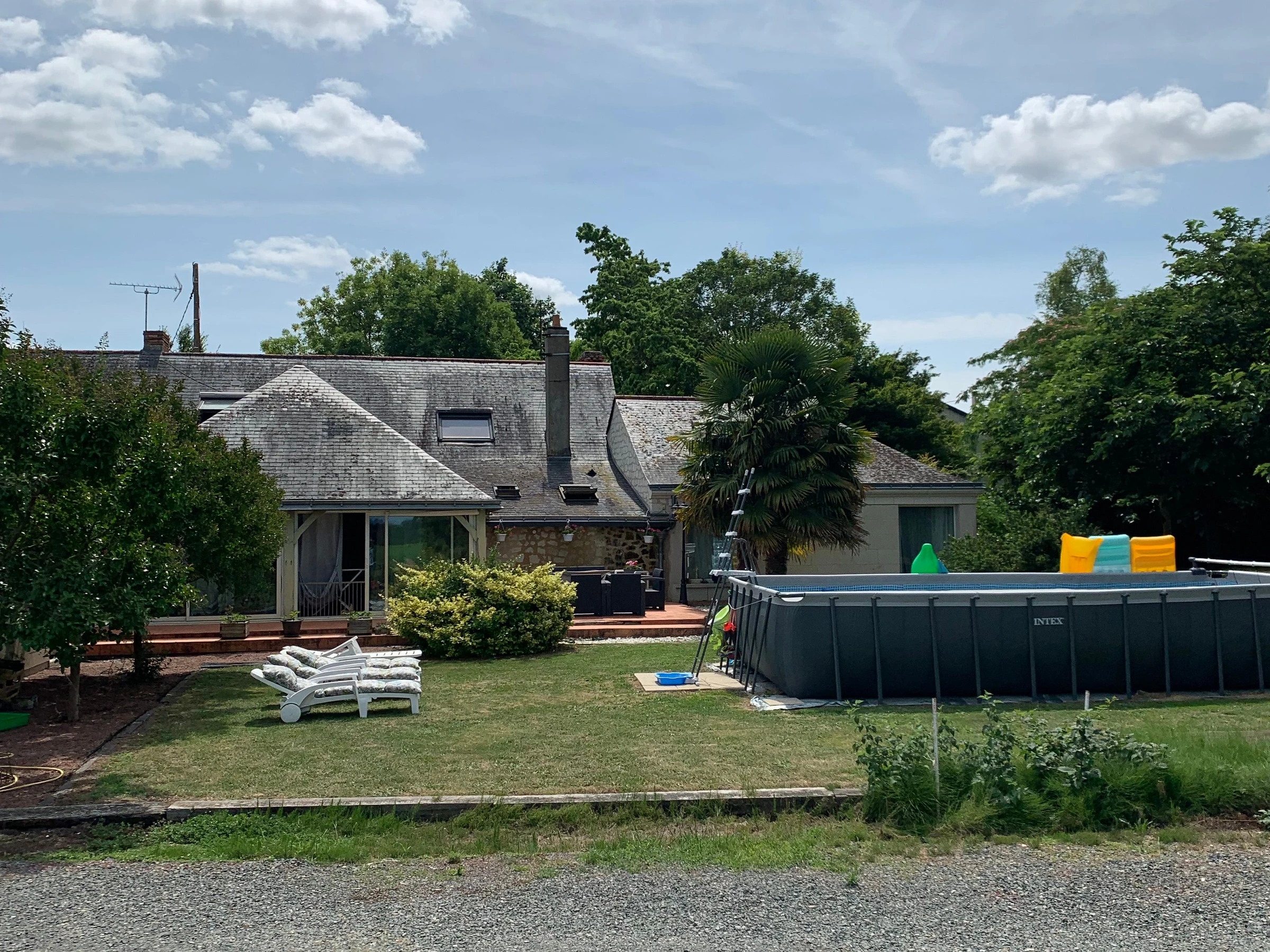 De beaux extérieurs pour profiter pleinement de votre pause à la campagne : terrasse sud-est avec salon de jardin et parasols, terrasse avec salon de détente et bains de soleil à l'ouest proche de la piscine. Toutes les pièces de vie ont un accès aux terrasses. Grande plancha gaz. Piscine hors-sol non chauffée (730x366x130cm). Jeux enfants, balançoires, toboggan, panier de basket...