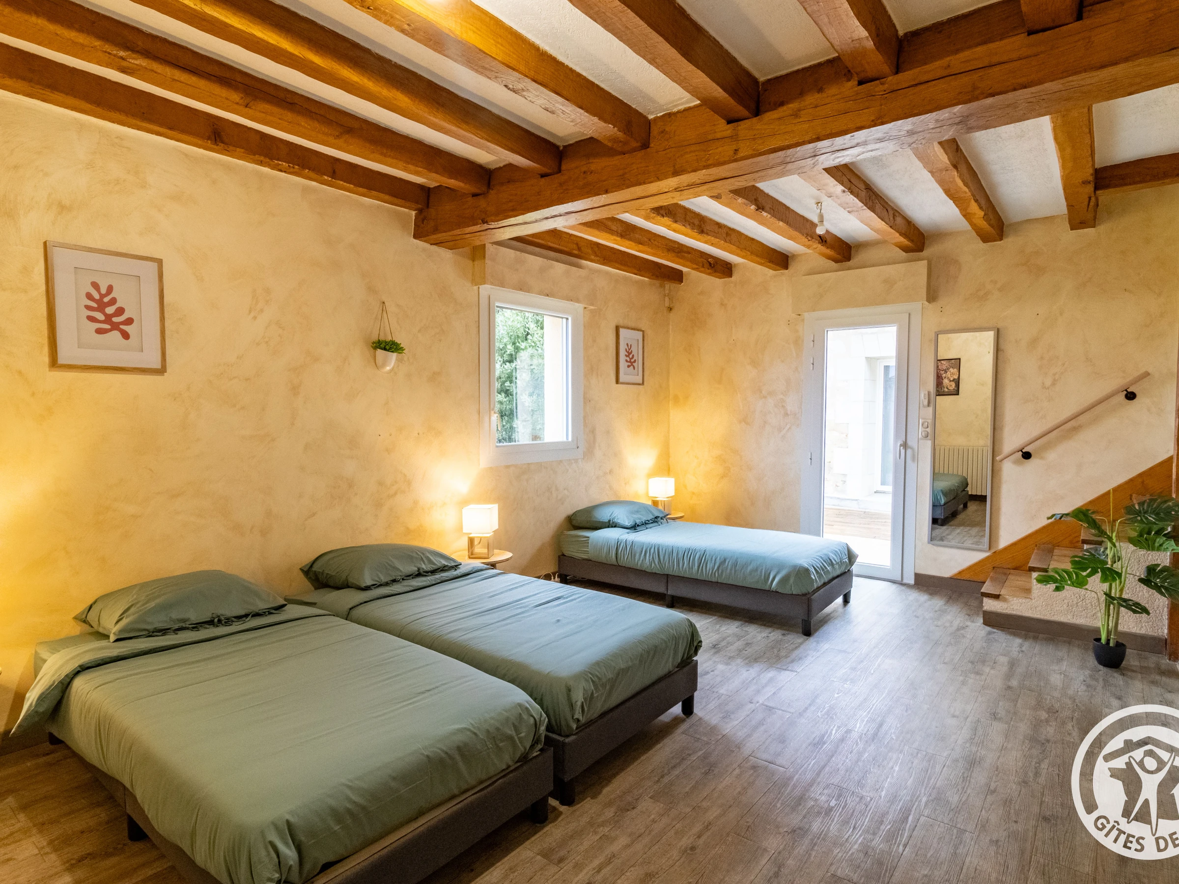 Au rez-de-chaussée toujours, une suite familiale composée de 2 chambres en enfilade (voir plan) l'une avec 3 lits, l'autre 2 lits, une salle de jeux pour les petits, une chambre avec 3 lits et une grande salle d'eau / buanderie avec vasque et douche à l'italienne. Wc indépendants.