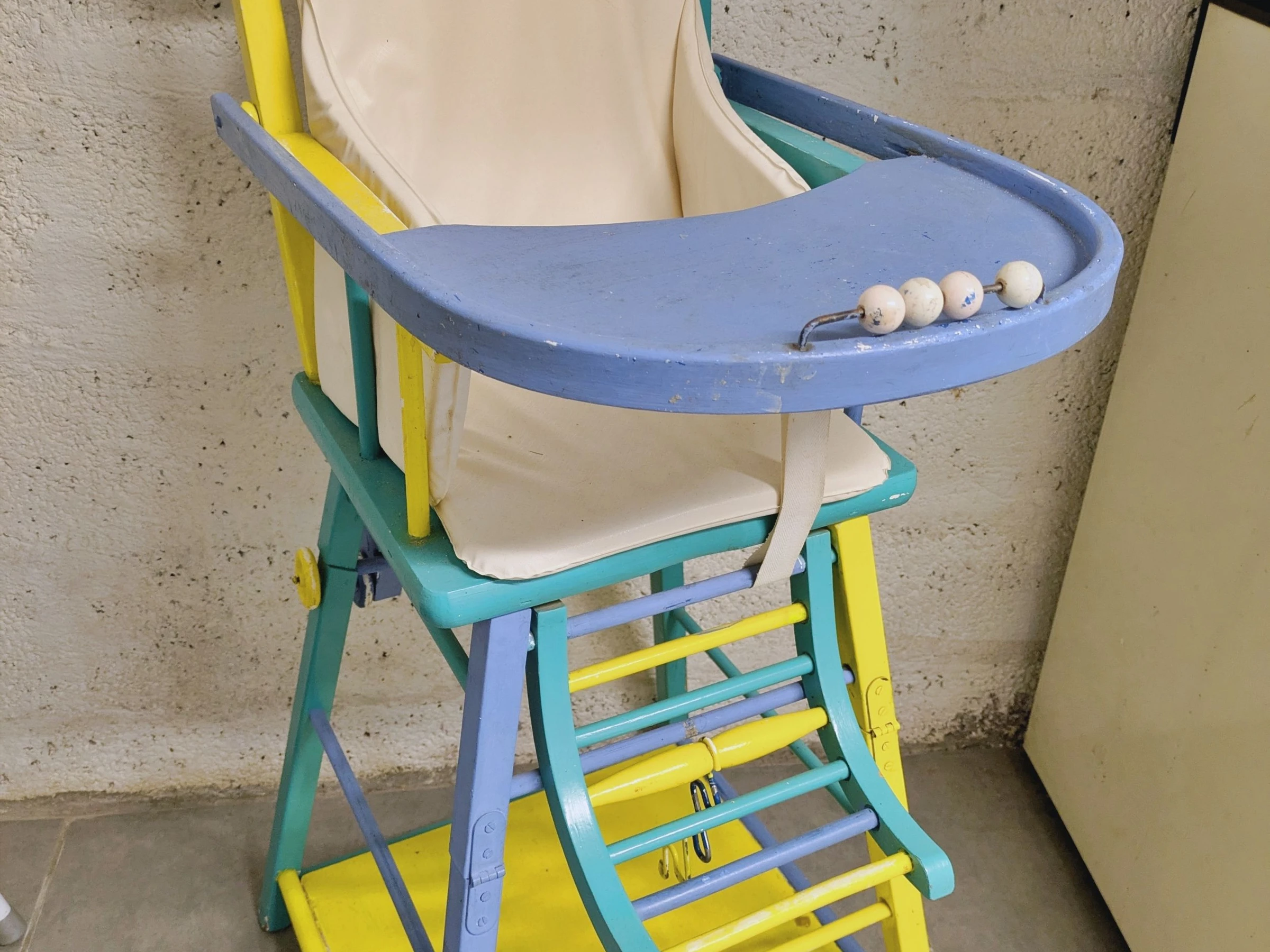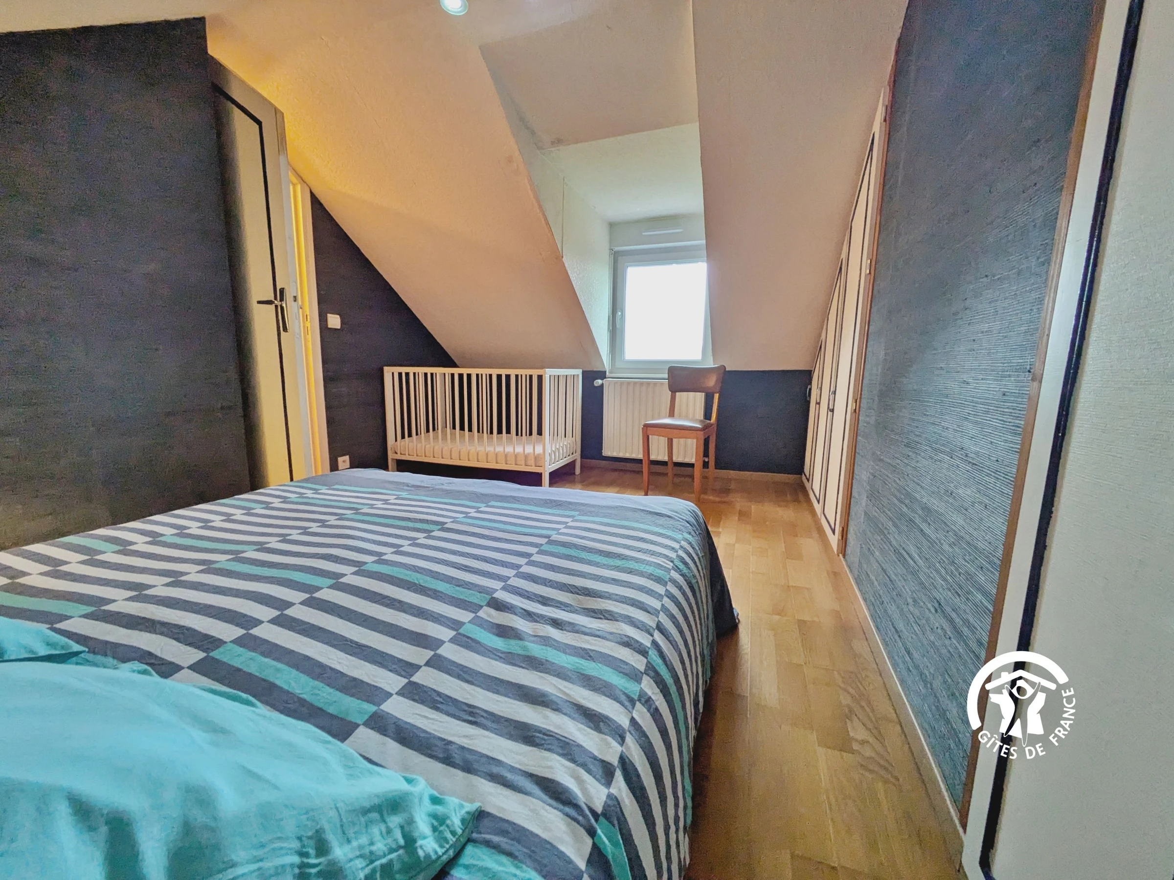 Équipement bébé : lit bébé et chaise haute.