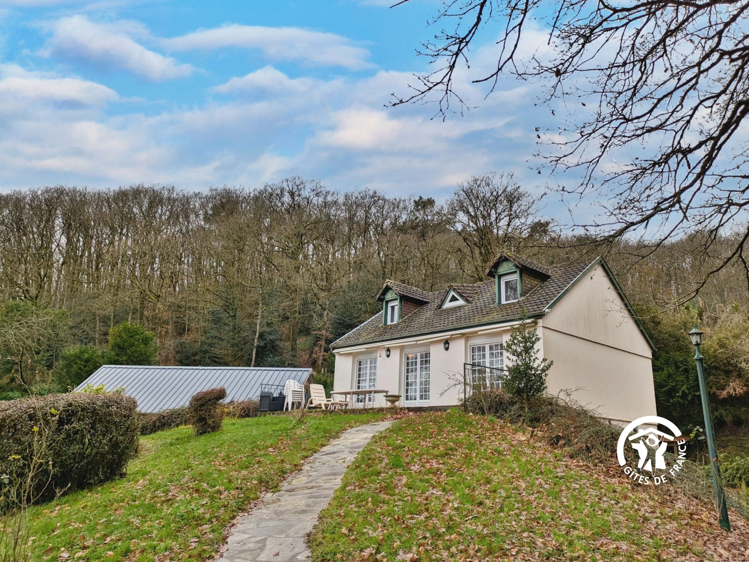 La terrasse de la maison est exposée plein sud, offrant une vue magique sur le parc et l'étang de pêche.
