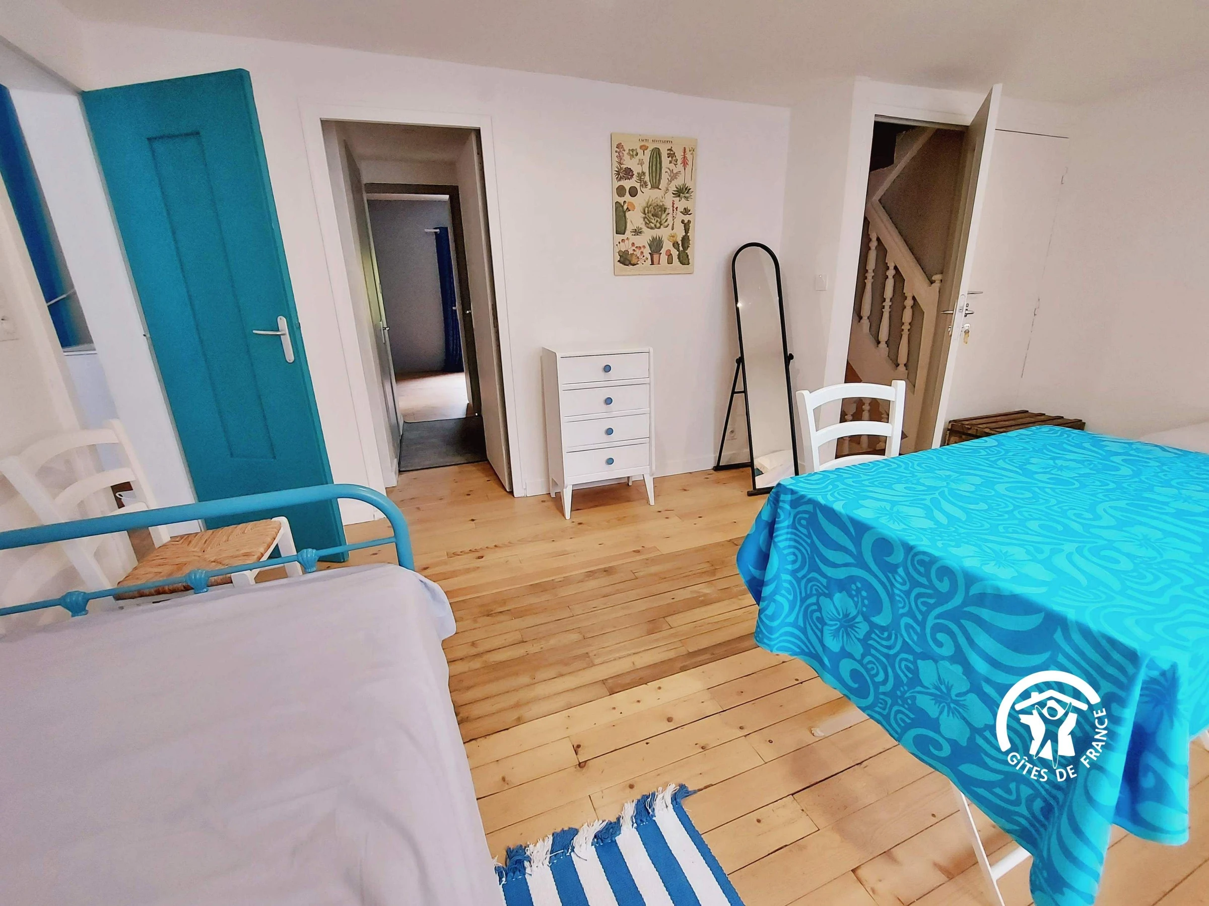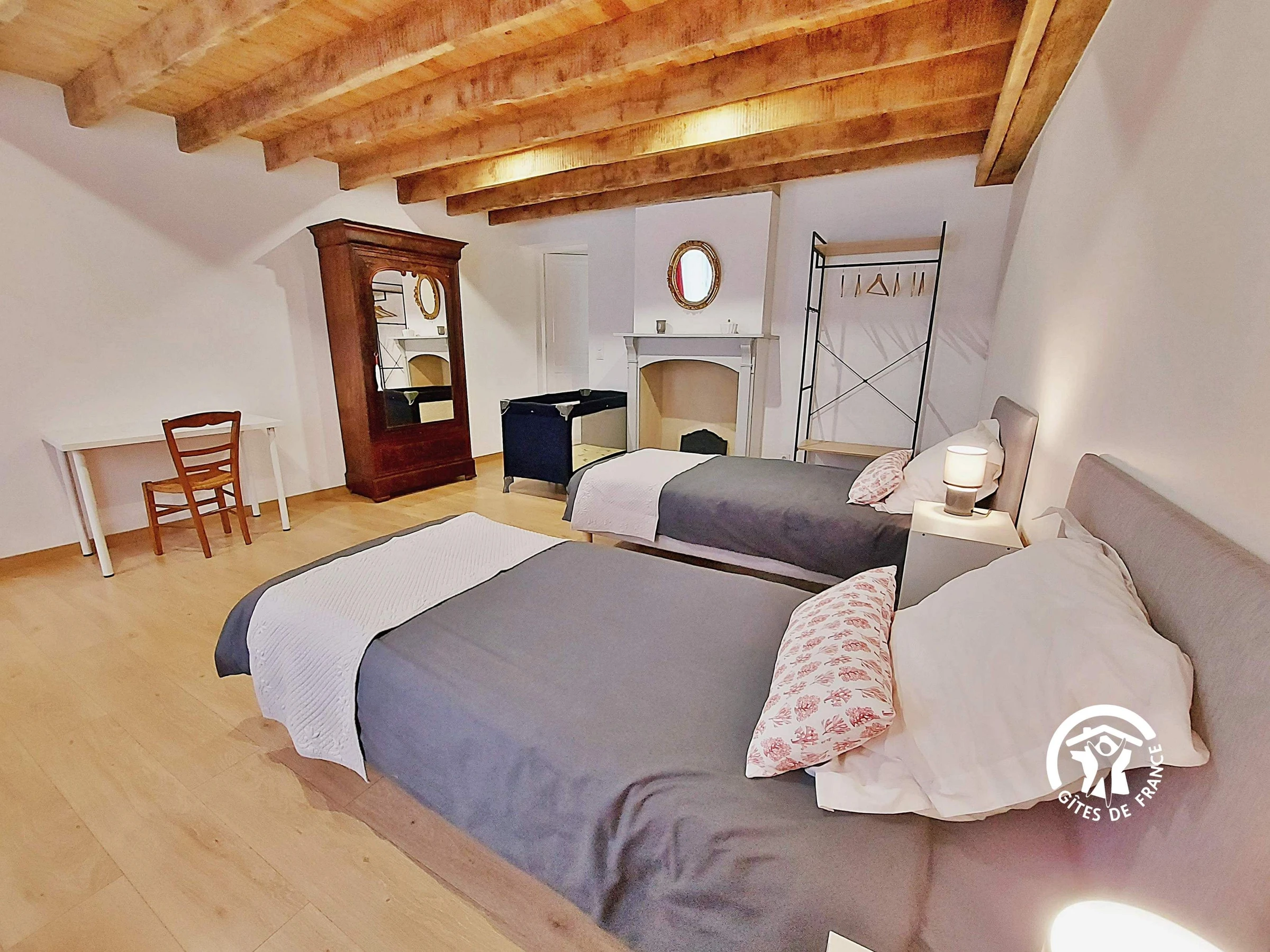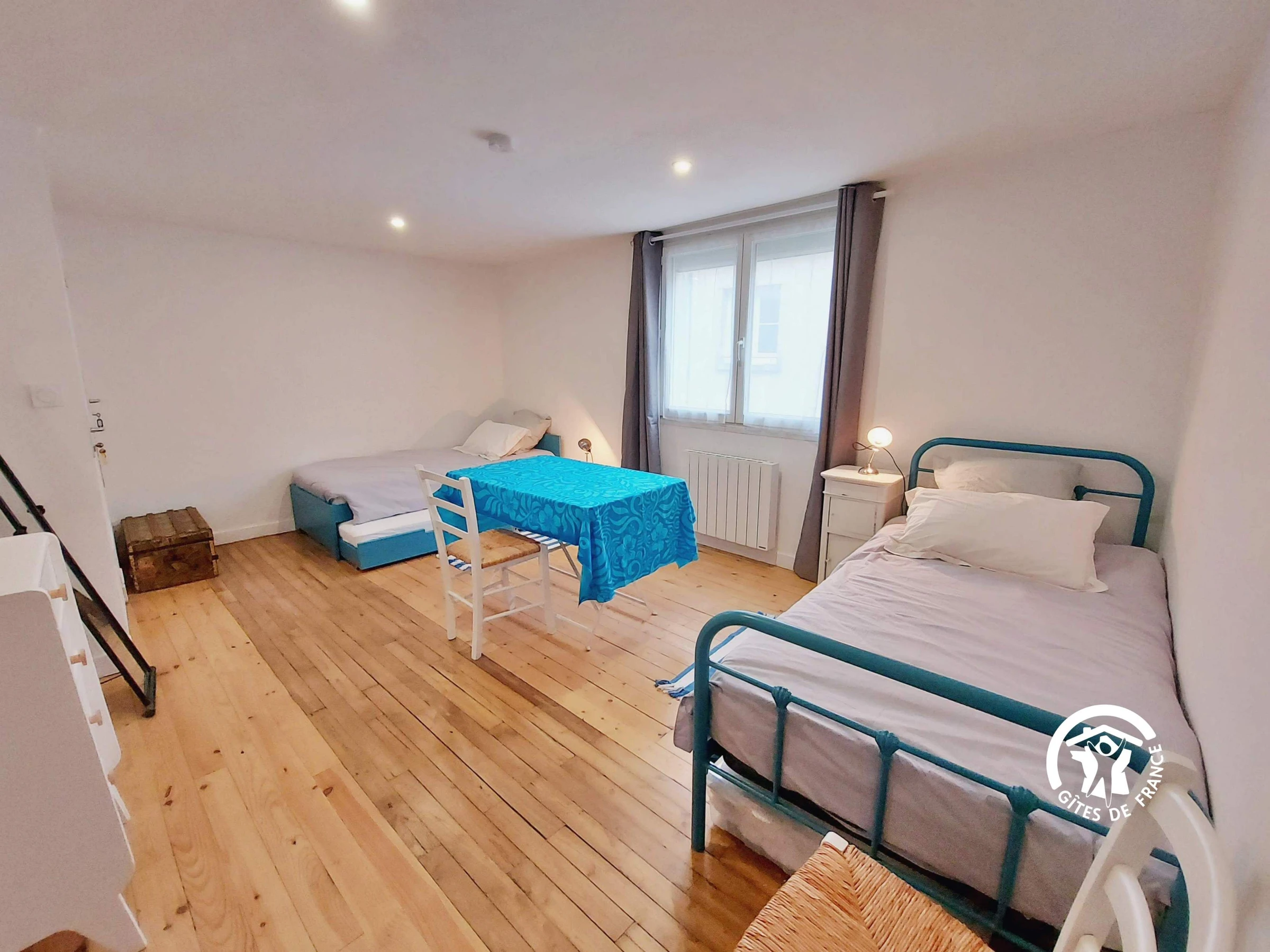 NIVEAU 1 - accès par escalier confortable - Espace palier 16.8m² aménagé en chambre avec 1 lit 90*190 et son lit gigogne 90*190 ainsi qu'un lit 90*190 (ces lits peuvent prendre place dans un autre chambre) - Chambre (3) 17m² avec 2 lits jumeaux 80*200 et un lavabo, étagère-penderie, table ronde et chaises - Chambre (4) 16.9m² avec 1 lit bois 140*190, armoire et bureau - salle d'eau indépendante - wc indépendant.
