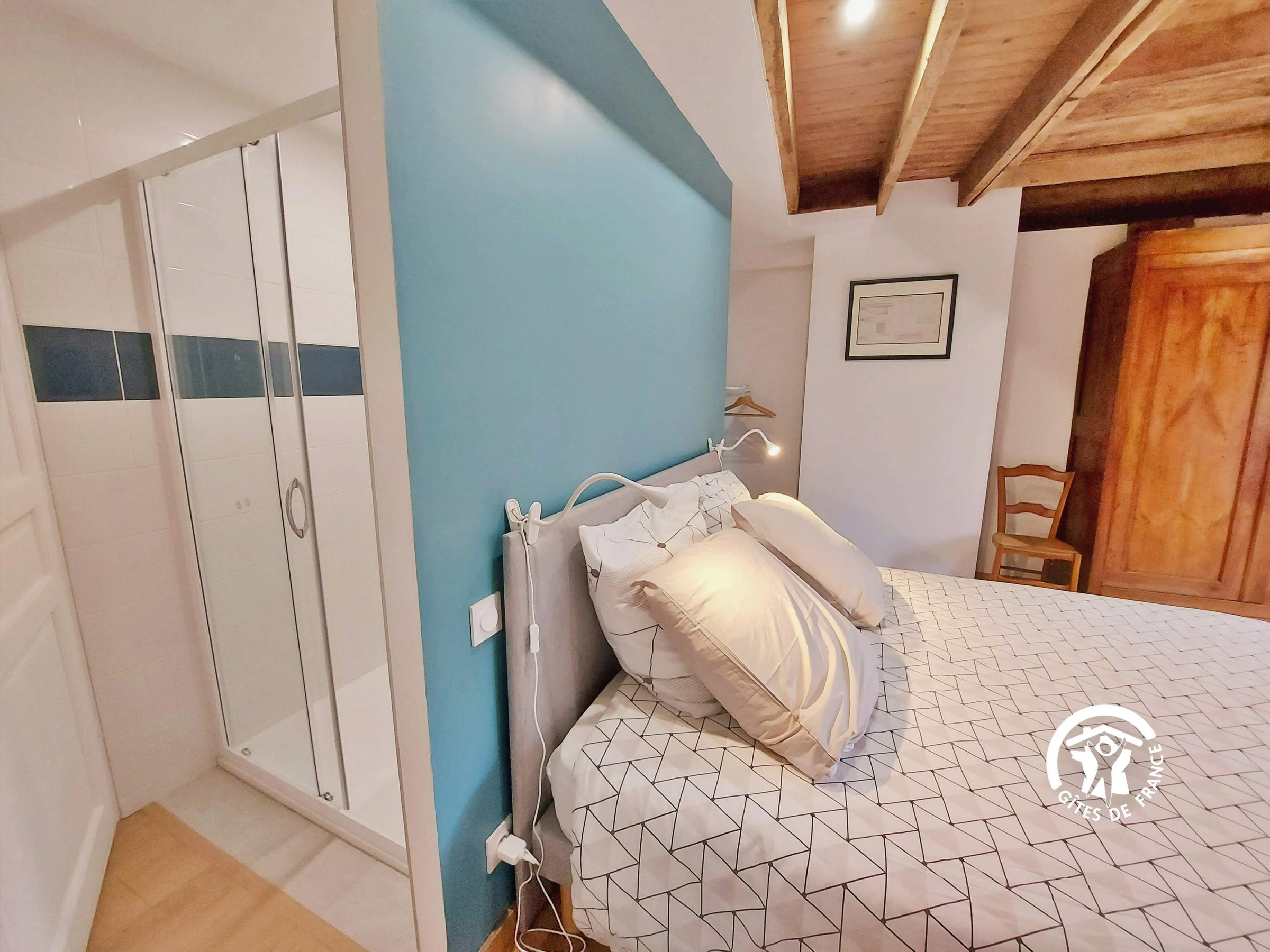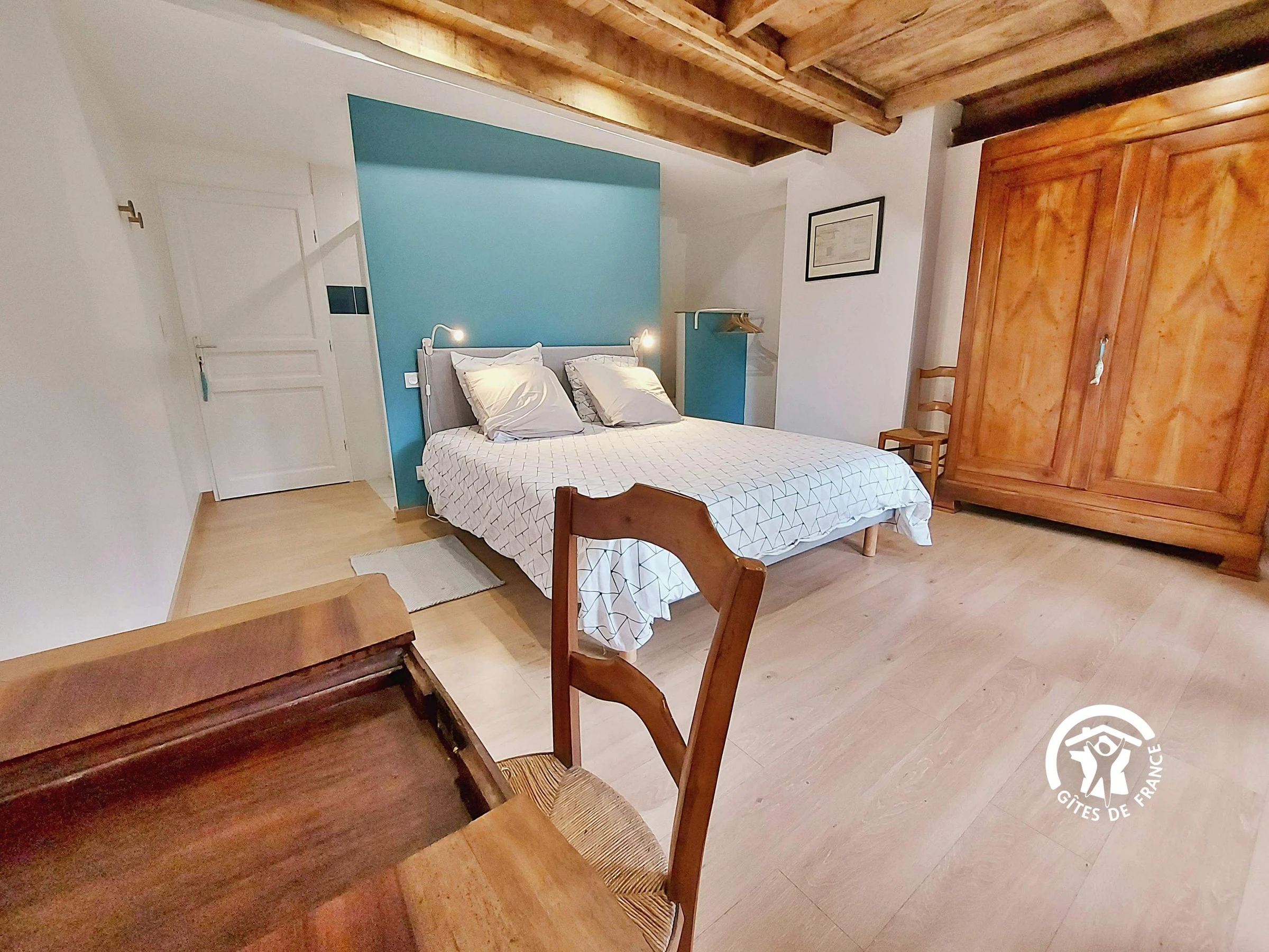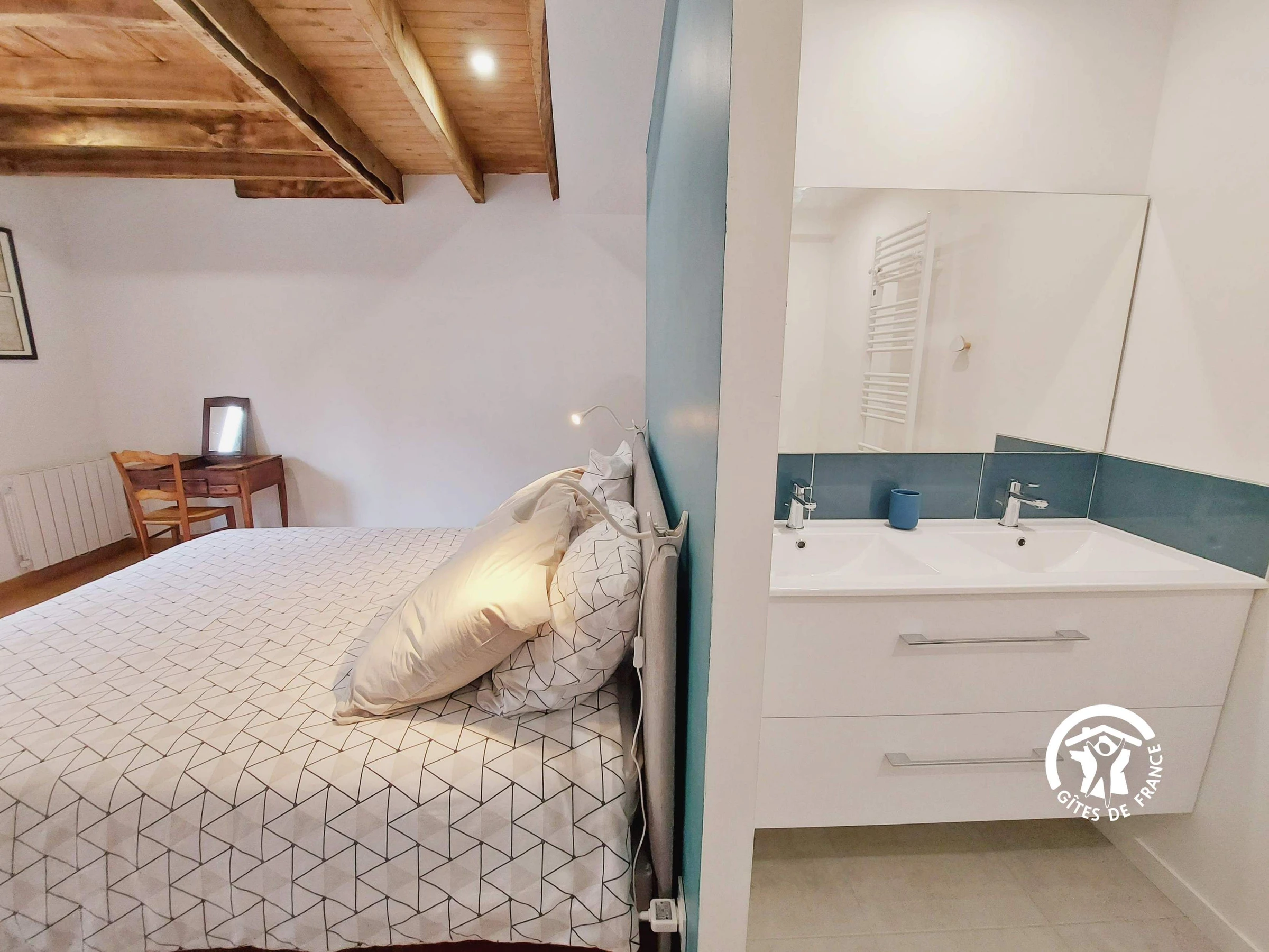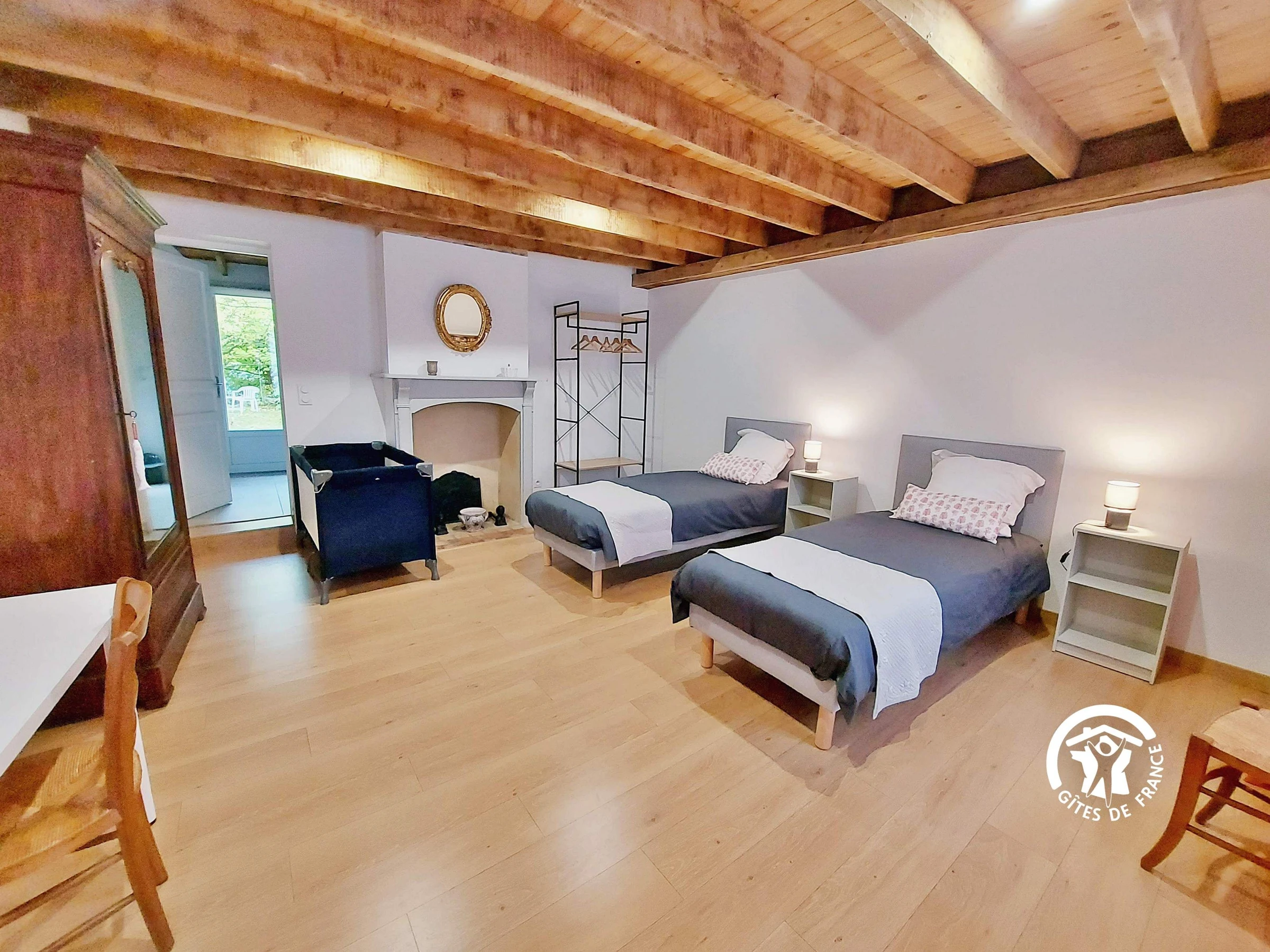 NIVEAU 1 - accès par escalier confortable - Espace palier 16.8m² aménagé en chambre avec 1 lit 90*190 et son lit gigogne 90*190 ainsi qu'un lit 90*190 (ces lits peuvent prendre place dans un autre chambre) - Chambre (3) 17m² avec 2 lits jumeaux 80*200 et un lavabo, étagère-penderie, table ronde et chaises - Chambre (4) 16.9m² avec 1 lit bois 140*190, armoire et bureau - salle d'eau indépendante - wc indépendant.