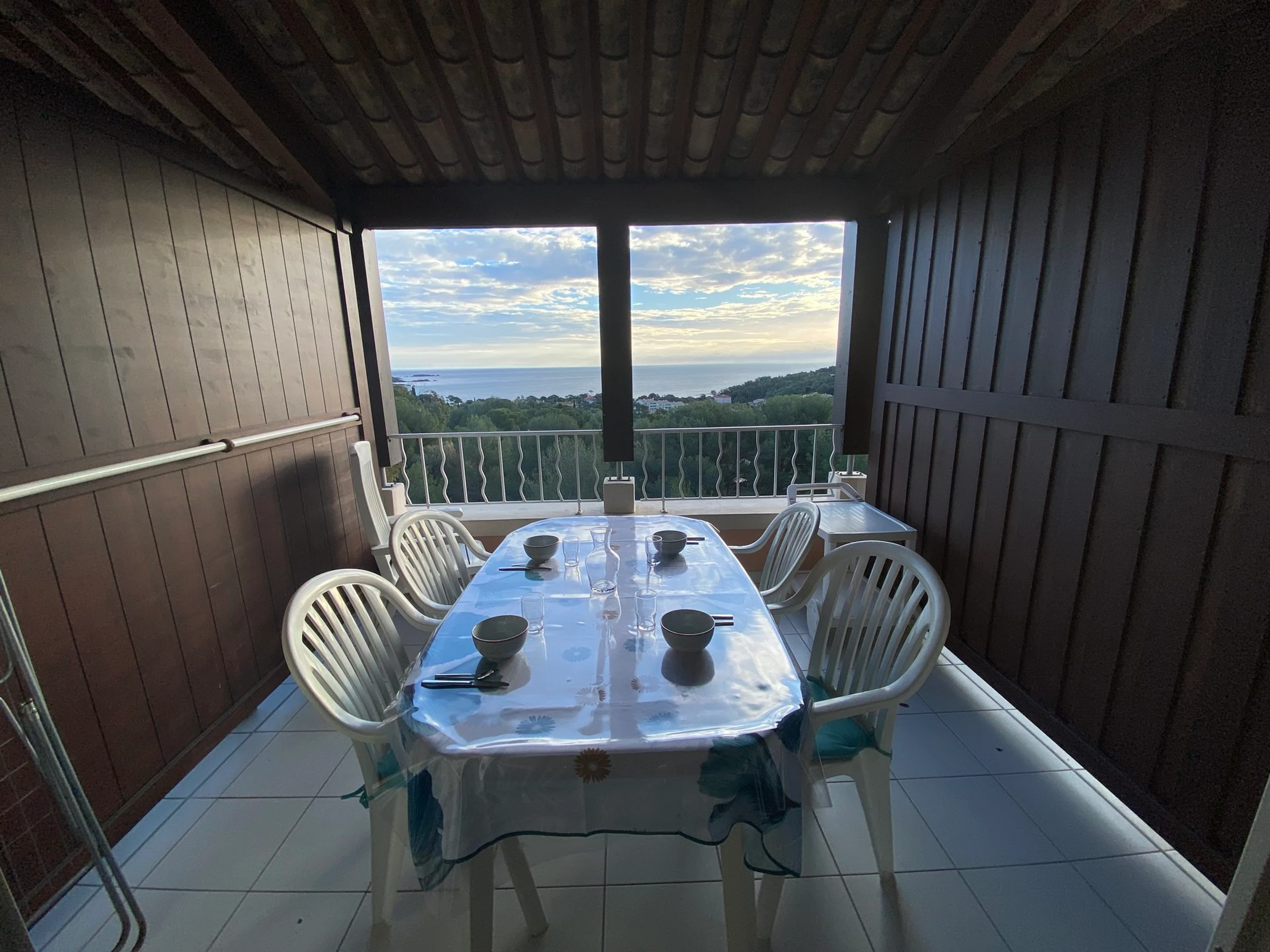 Pièce à vivre avec baie vitrée donnant sur une charmante terrasse couverte vue mer.