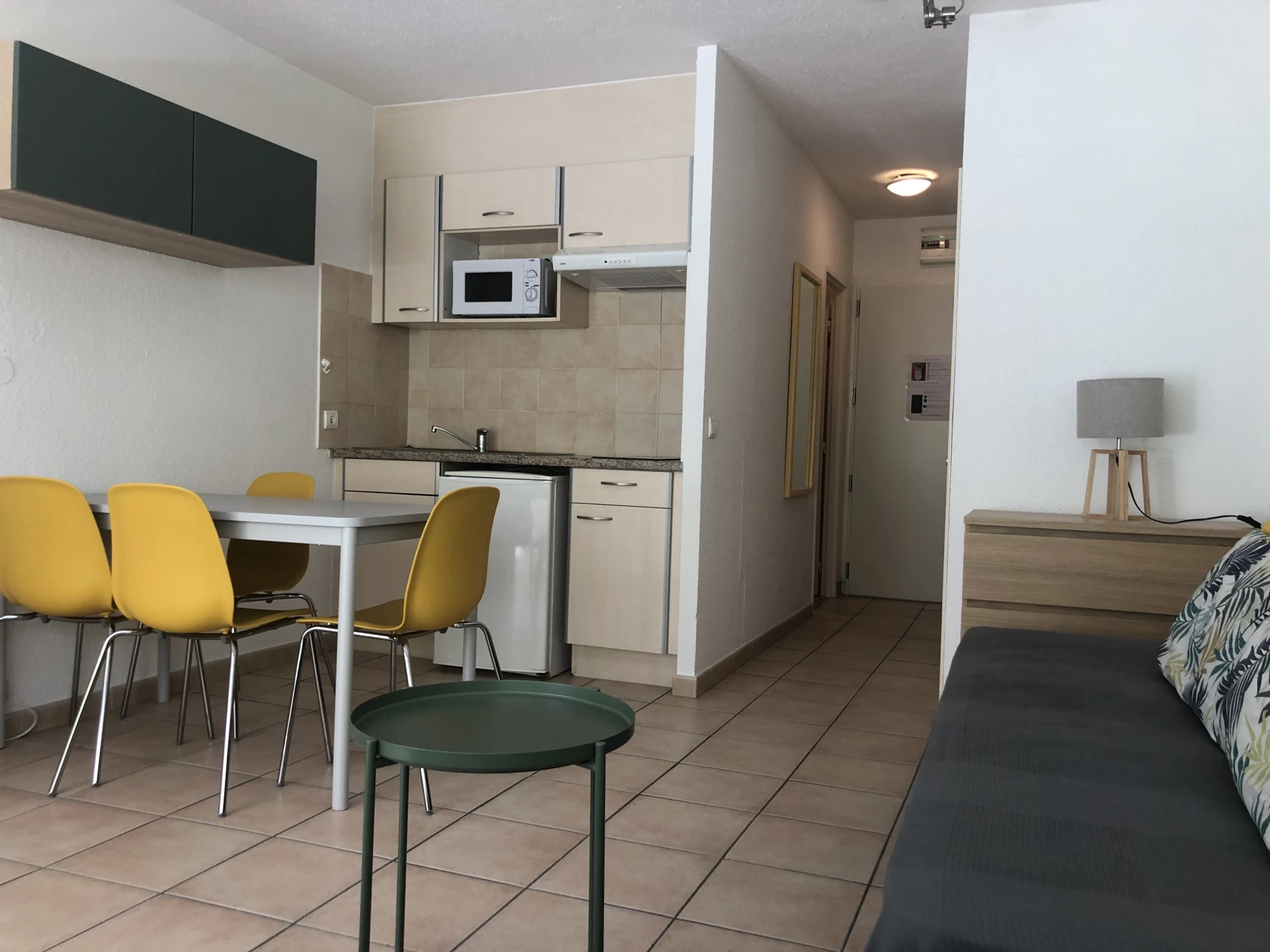 Studio climatisé façade OUEST vue mer du balcon, comprenant une entrée avec un lit individuel, un salon avec 2 lits individuels, un coin kitchenette tout équipé, une salle d'eau avec WC, un balcon avec mobilier de terrasse.