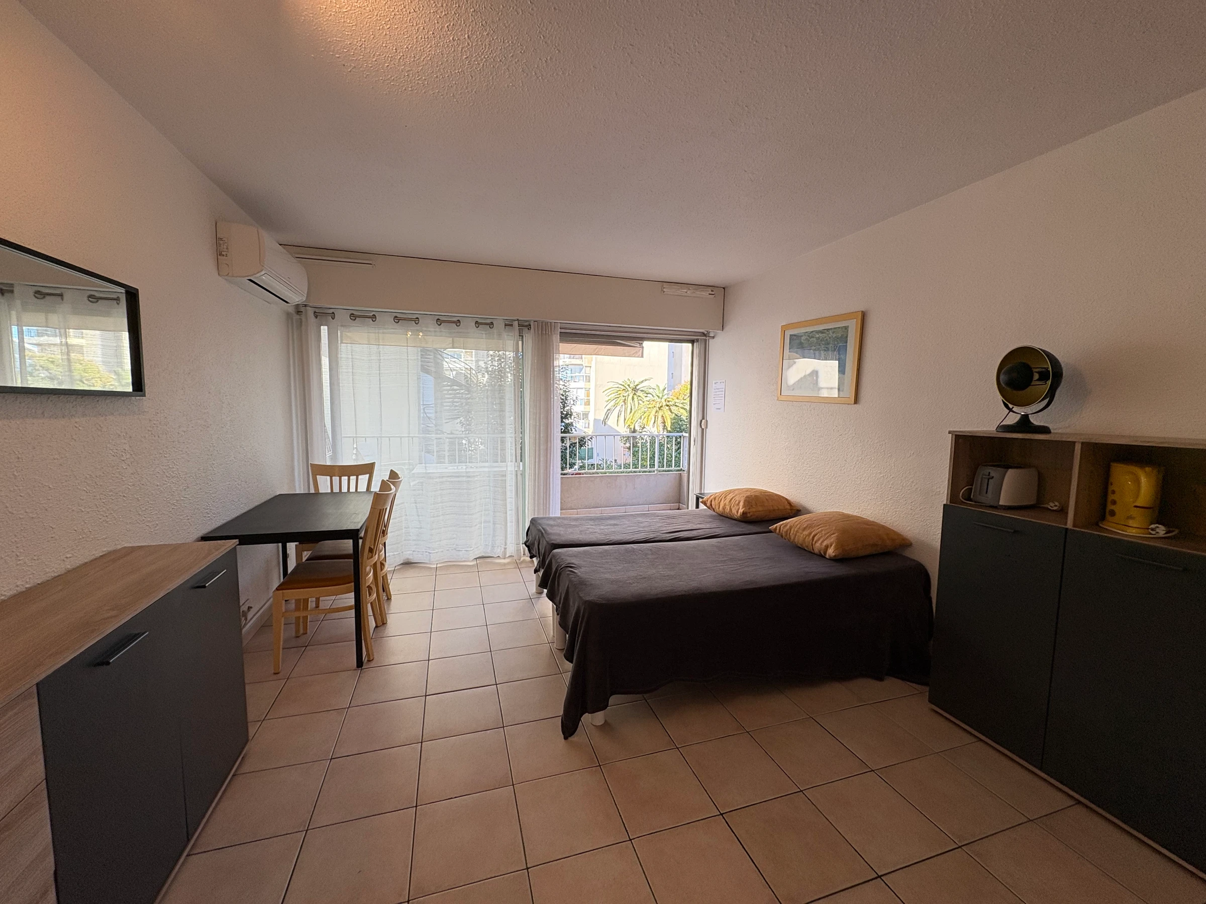 Studio climatisé façade OUEST, vue mer du balcon, comprenant une entrée avec un lit individuel, un salon avec 2 lits individuels, un coin kitchenette tout équipé, une salle d'eau avec WC, un balcon avec mobilier de terrasse.