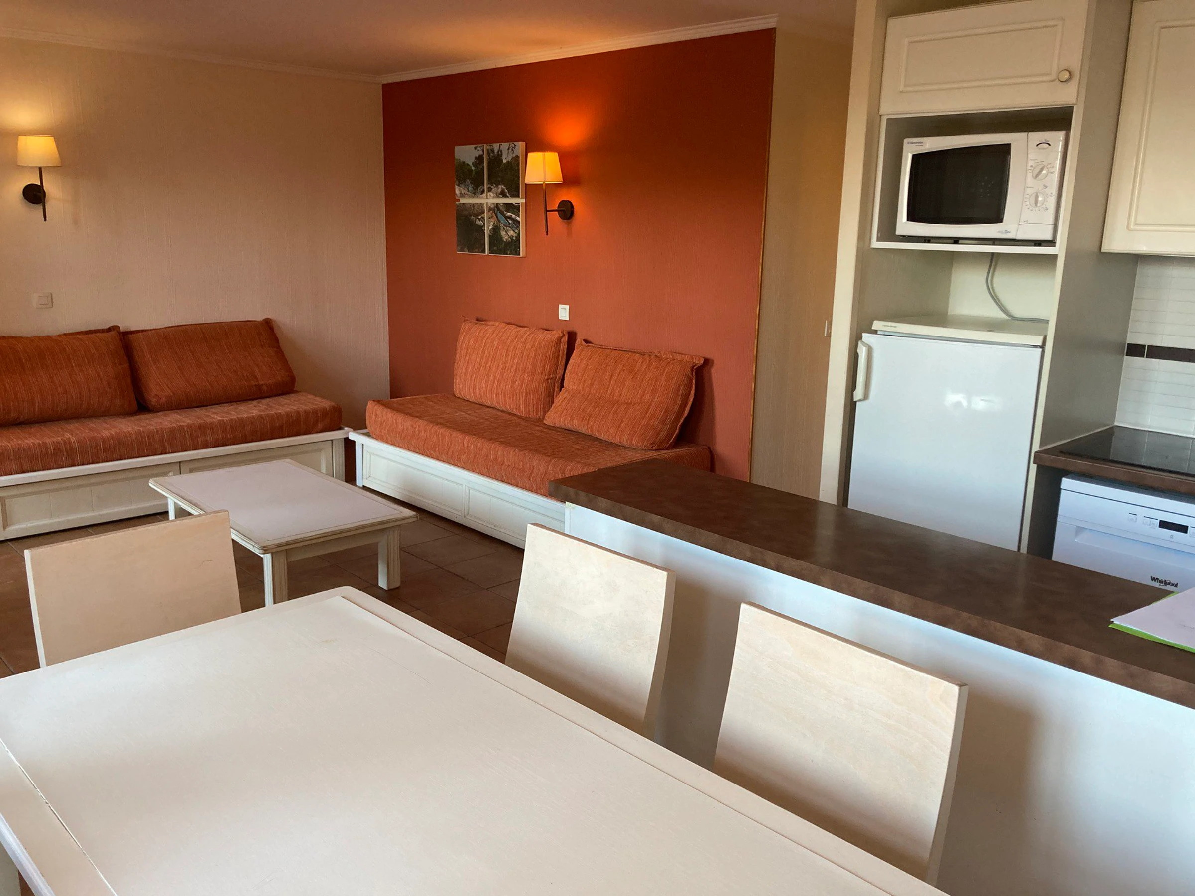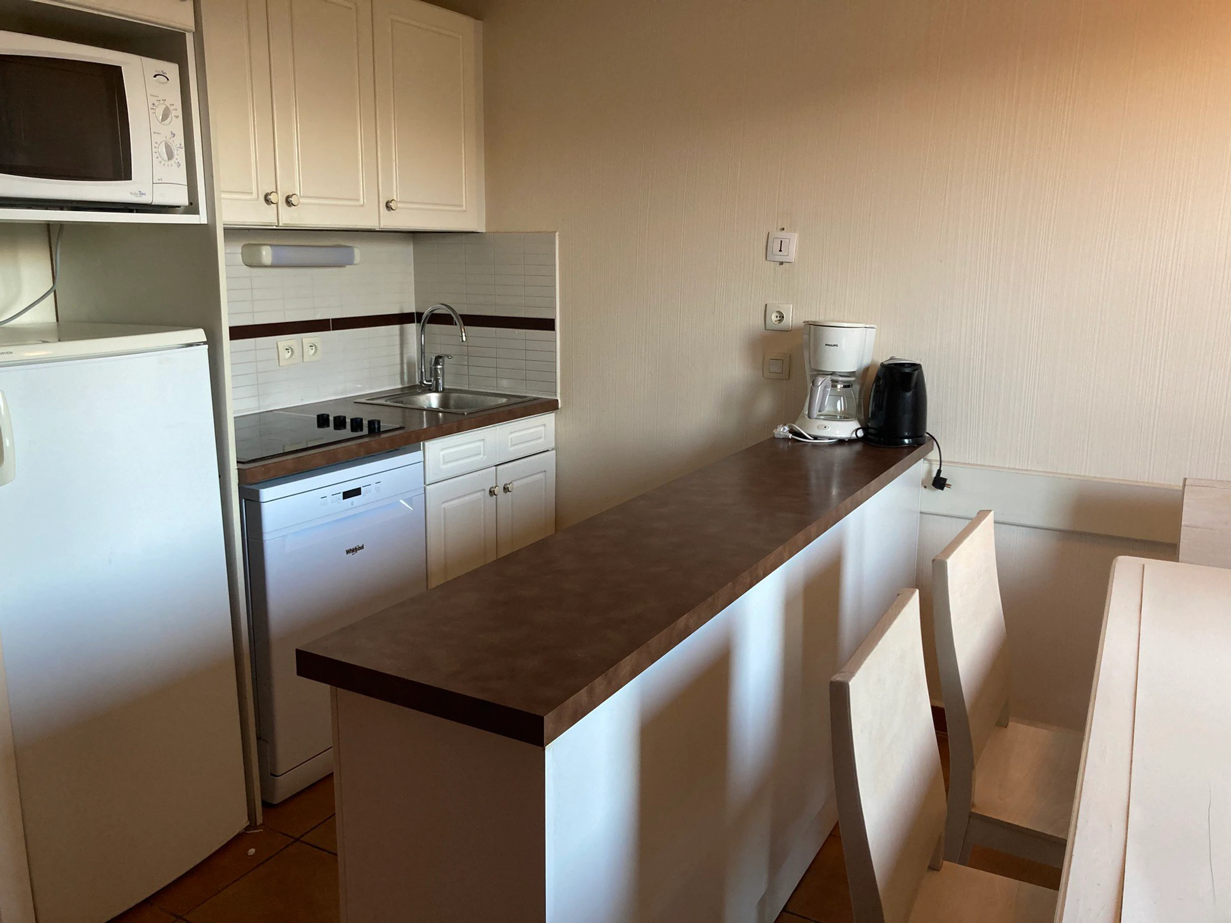 Coin cuisine équipé : réfrigérateur, plaques vitro-céramiques, micro-ondes, cafetière, nécessaire de vaisselle.