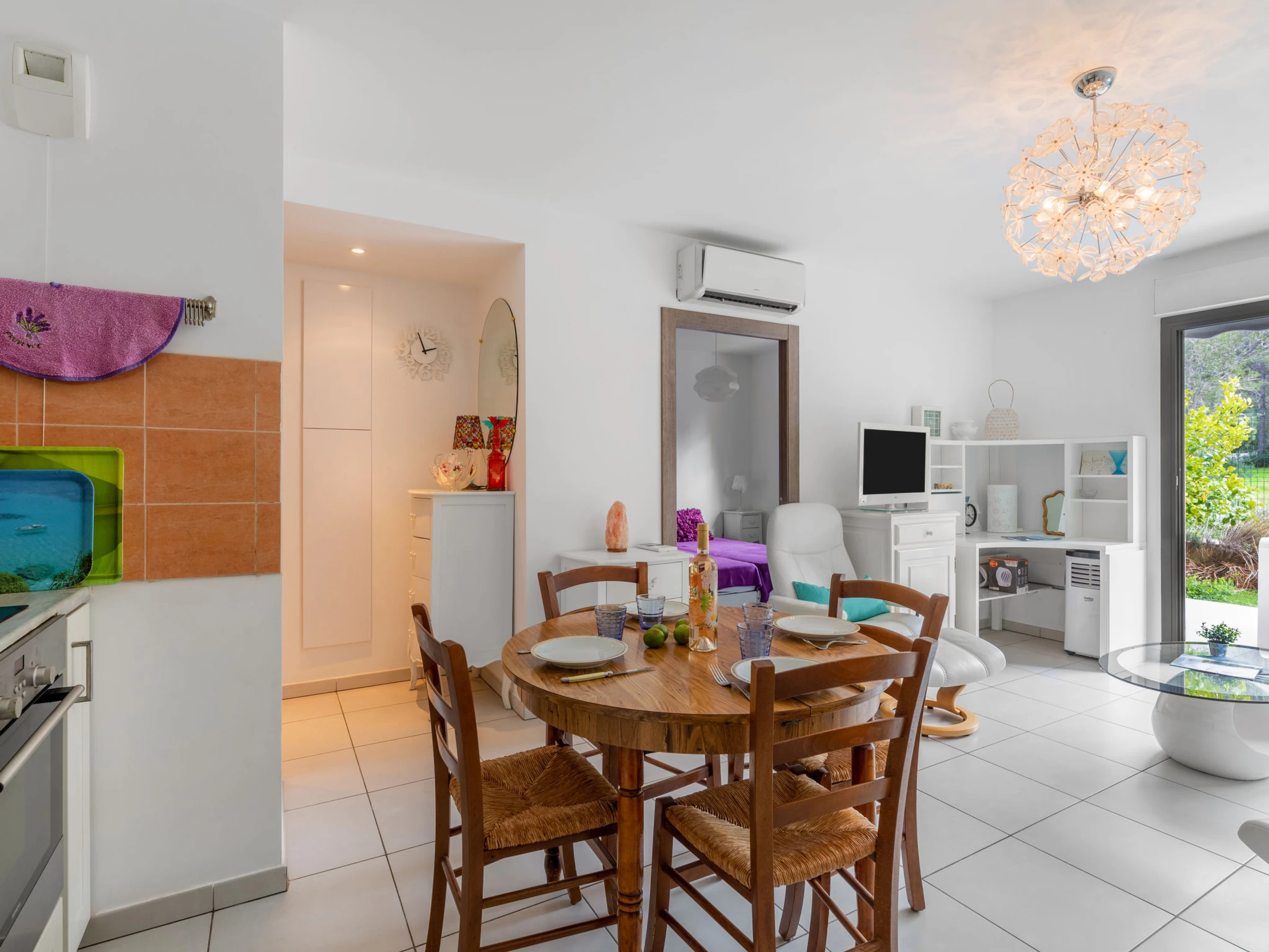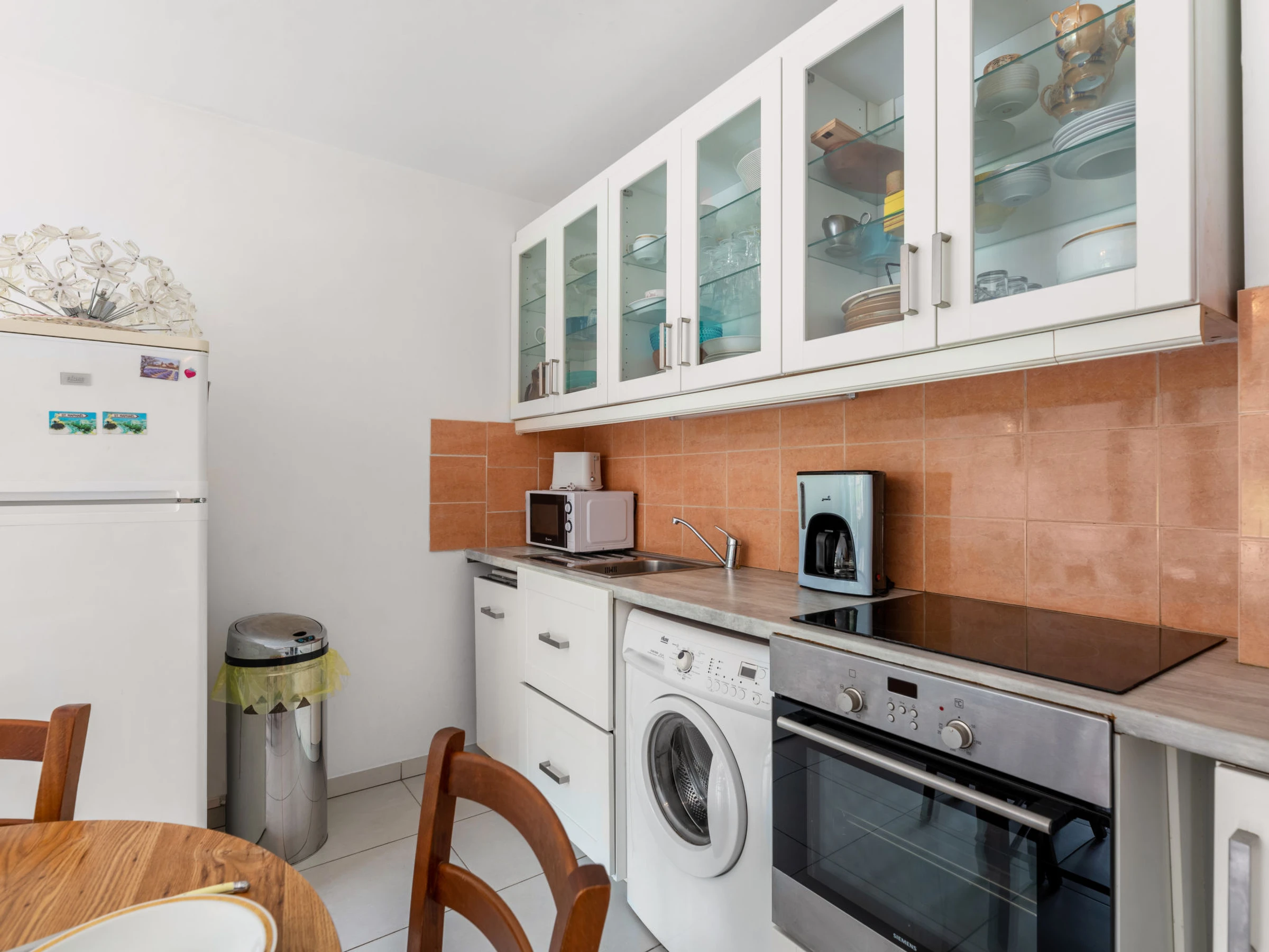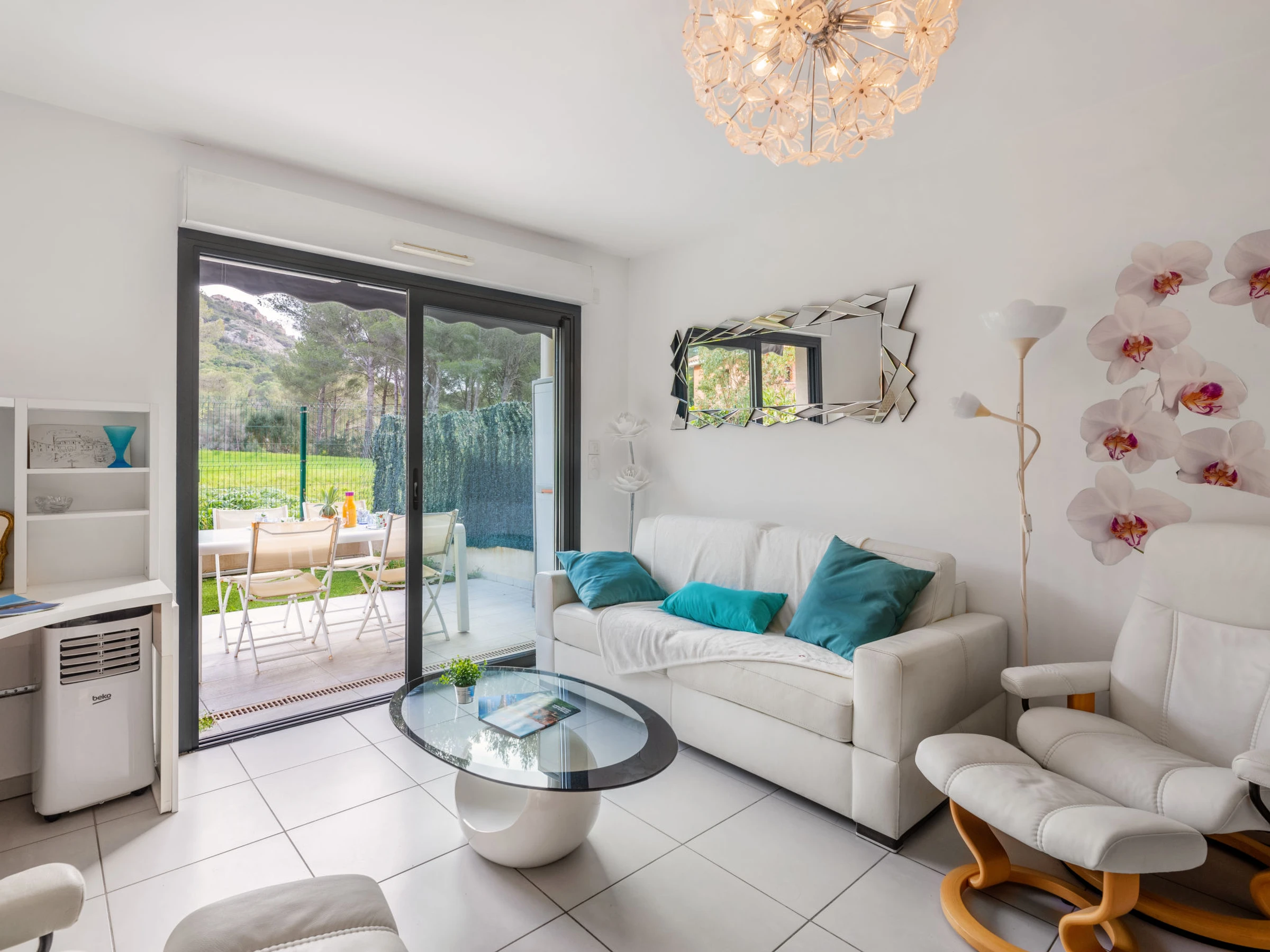 "Estérel Parc", apt 2 pièces 40 m2, rez-de-chaussée surélevé. Séjour/chambre à coucher avec 1 divan-lit (140 cm, longueur 190 cm), TV (écran plat). Sortie sur la terrasse, sur le jardinet. 1 chambre avec 2 lits (80 cm, longueur 190 cm), douche. Cuisine ouverte (4 plaques de cuisson, four, lave-vaisselle, grille-pain, bouilloire électrique, four micro-ondes, congélateur). WC séparé. Terrasse 10 m2, jardinet. Meubles de terrasse. Vue sur le jardin. A disposition: lave-linge. Internet (Connexion WIFI, en sus). Place de parking près de la maison. Veuillez noter: logement non-fumeur. Détecteur de fumée.
