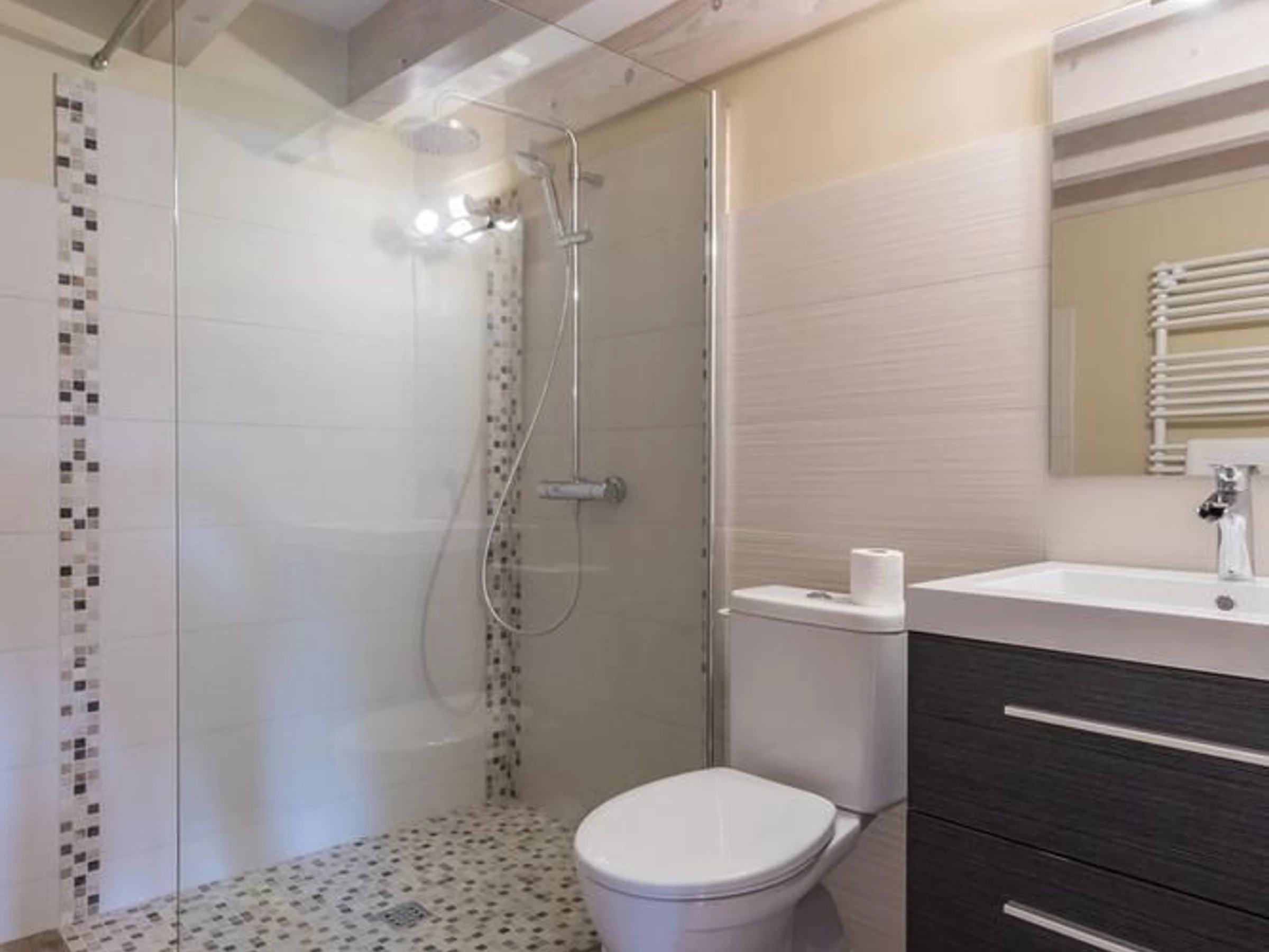 Draps inclus et lits faits à l'arrivée. une chambre et sanitaires privatifs (douche à l'italienne et WC) à la chambre située au rez-de-chaussée - et WC indépendants avec lave-mains dans l'entrée.