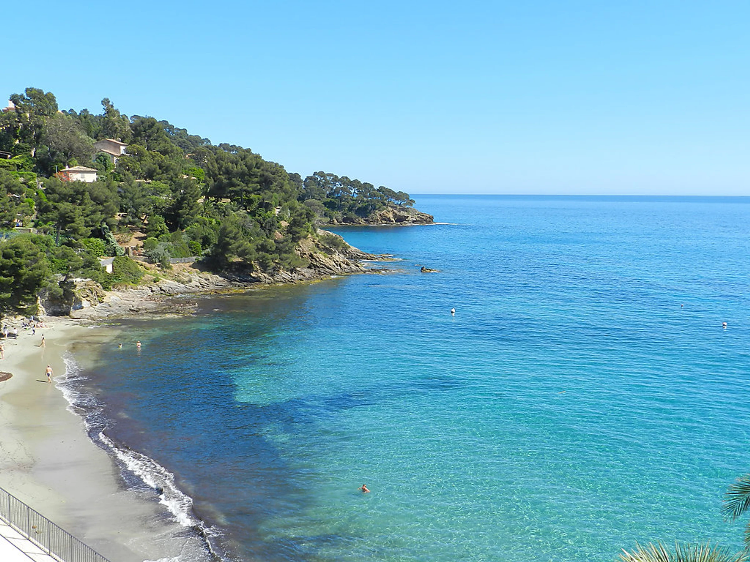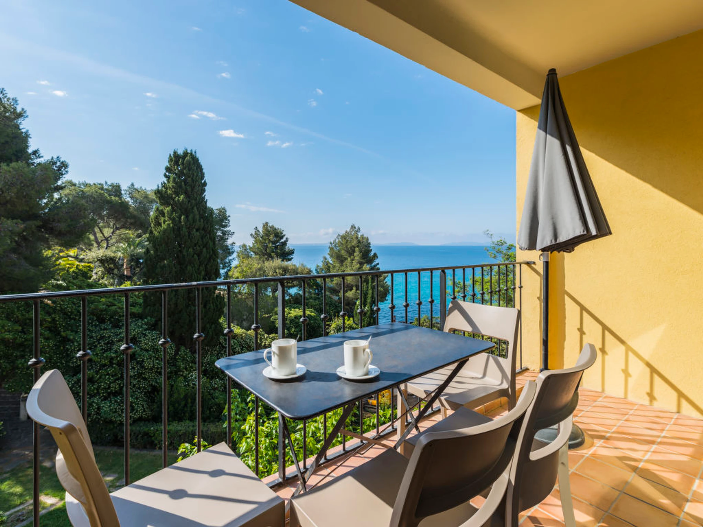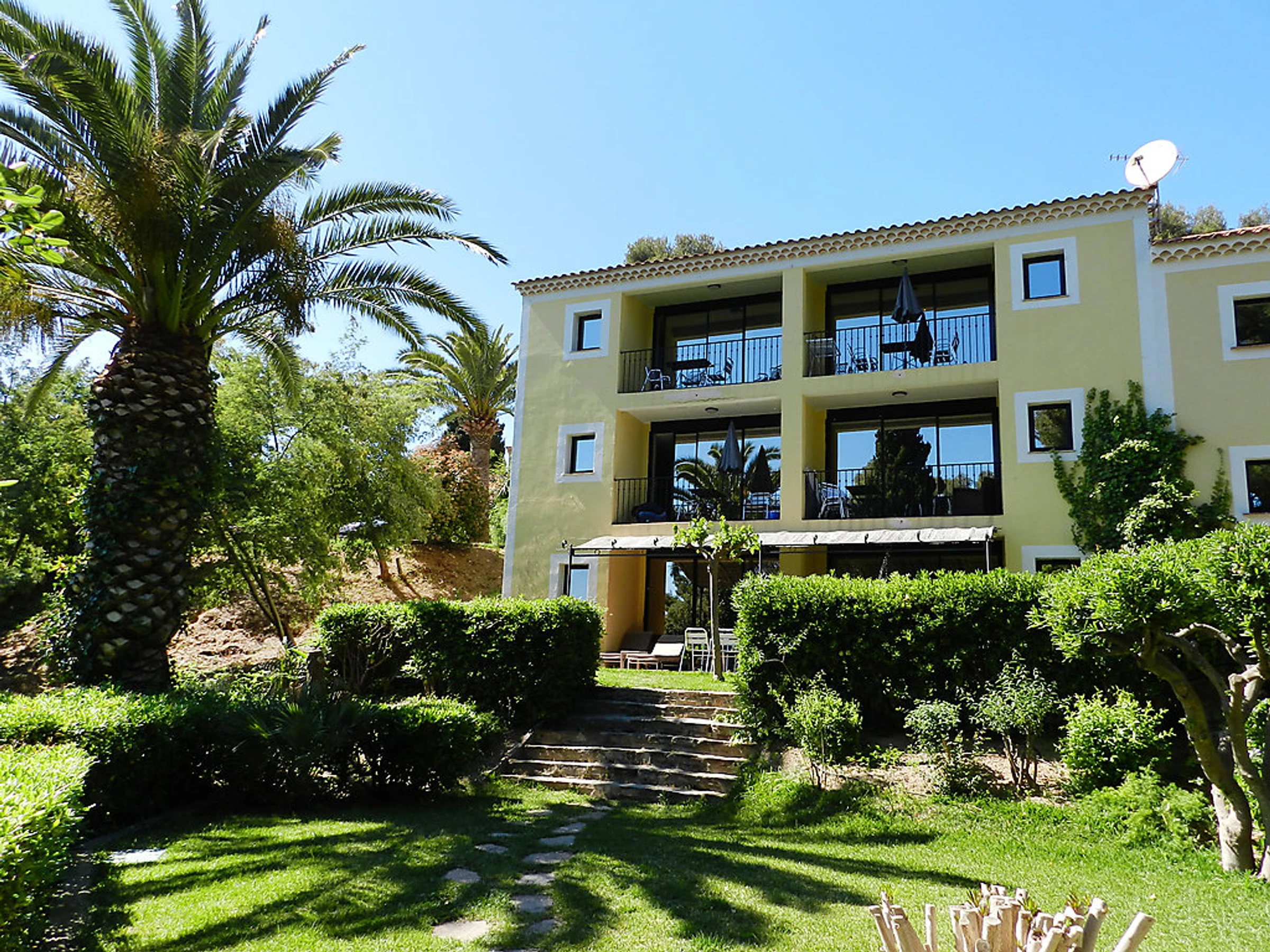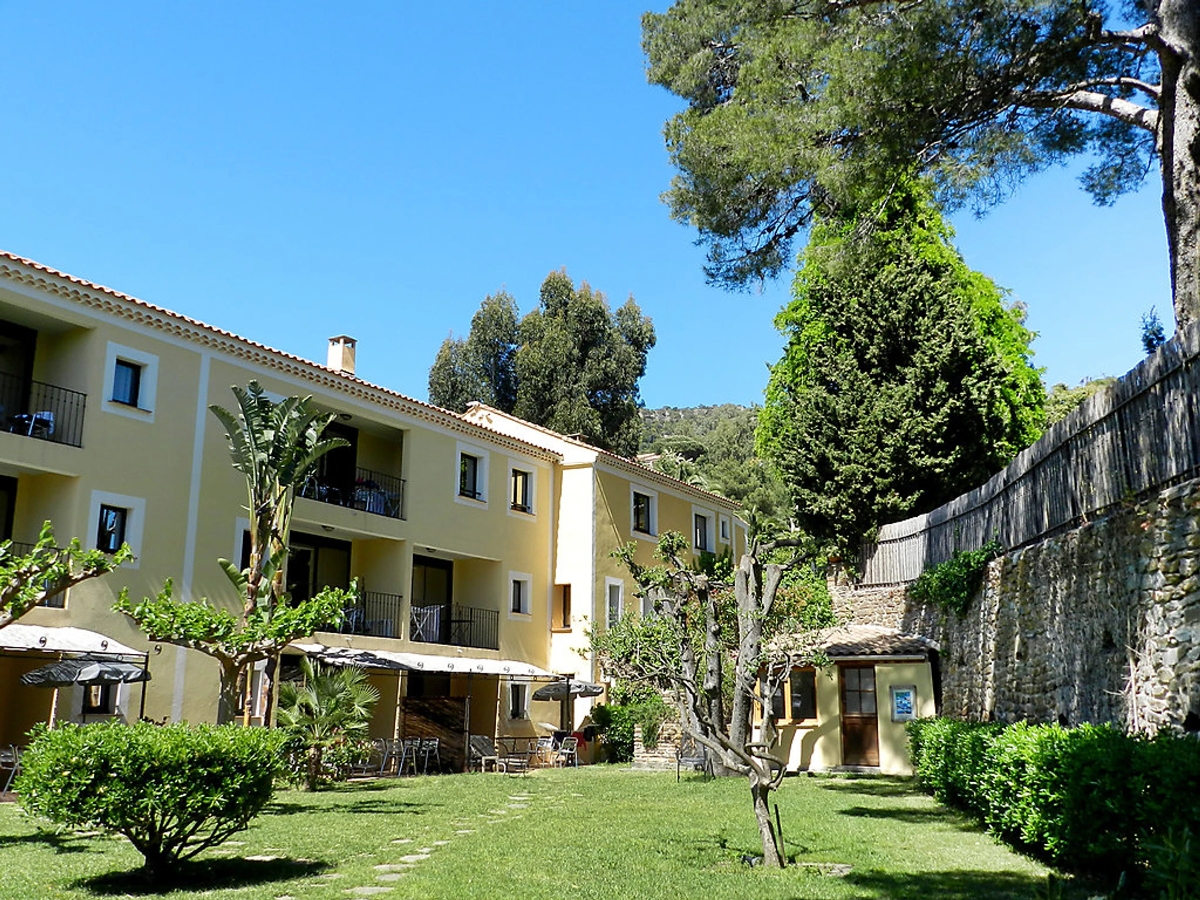 Face à la Mer Méditerranée et aux Iles de Port-Cros et du Levant belle résidence "La Résidence du Bailli", de 2 étages. 19 appartements dans la résidence. En bordure de la localité, situation surélevée dans un quartier résidentiel, à 50 m de la mer, à 50 m de la plage, accès direct à la plage, dans la verdure. En commun: jardin entretenu (clôturé). Infrastructures de la résidence: réception, lave-linge, sèche-linge (en commun, en sus), étendoir à linge. Petit-déjeuner sur demande (en sus). Parking public possible dans la rue. Magasin d'alimentation 300 m, supermarché 12 km, restaurant, plage de sable 50 m. Attractions à proximité: Jardin des Méditerrannées, Cavalaire 9 km, Le Lavandou 10 km, Saint-Tropez 25 km. Veuillez noter: "L´appartement se trouve dans une zone de circulation limitée". La photo ne montre qu’un exemple de location de vacances. D’autres appartements sont également proposés à la location dans cette maison de vacances. Le petit-déjeuner sur demande en sus est servi aux Terrasses du Bailli. En saison (de avril à octobre) sur réservation en sus accès aux restaurants, bars et Spa du Bailli de Suffren.