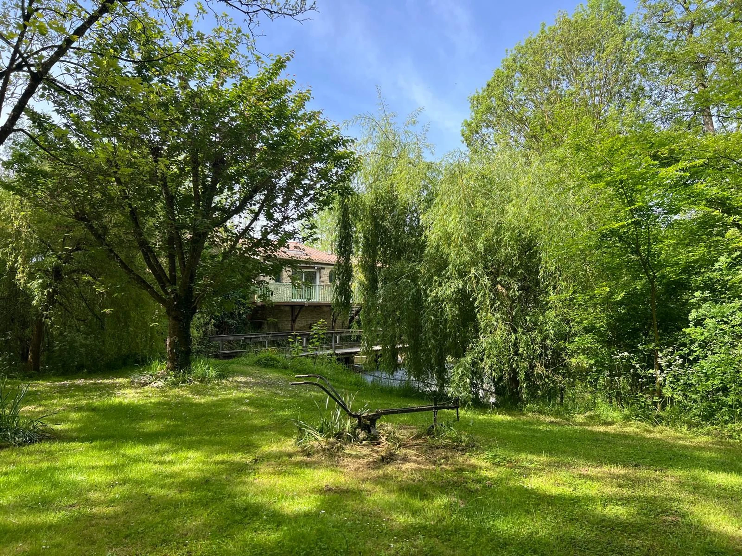 Profitez d'un séjour en campagne, en bordure de rivière, dans cet ancien moulin à eau situé à 8 km du centre de Chantonnay et de ses célèbres 4 Jours de Randonnée le week-end de l'Ascension, 20 km du donjon de Bazoges-en-Pareds et 25 km du célèbre Puy du Fou. Cette maison de plain-pied vous offre un séjour/salon/cuisine avec cheminée à foyer ouvert, une chambre équipée d'un lit 140 et d'un lit bébé, une salle d'eau, un WC séparé, un espace jeux, une chambre équipée d'un lit 140, une chambre équipée d'un lit 120 et de deux lits 90 superposés et une salle d'eau/WC. Par l'extérieur, vous accèderez également à un cellier avec lave-linge et congélateur. Vous bénéficierez d'un vaste espace extérieur. Au nord, une terrasse surplombant la rivière (salon de jardin, barbecue électrique) donnant accès par un escalier aux terrains situé en contrebas, longeant la rivière, dont une île accessible par une passerelle, au bout de laquelle un espace est aménagé pour la pêche (carte de pêche nécessaire). Des barrières permettent de fermer l'accès aux escaliers de la terrasse. Au sud, face à la maison, vous disposerez d'une terrasse avec une cuisine d'été couverte (tables, chaises, barbecue, gazinière, transats, jeu de fléchettes...), au-dessus de laquelle vous trouverez un verger entièrement clos. Un abri pour voiture est à votre disposition.