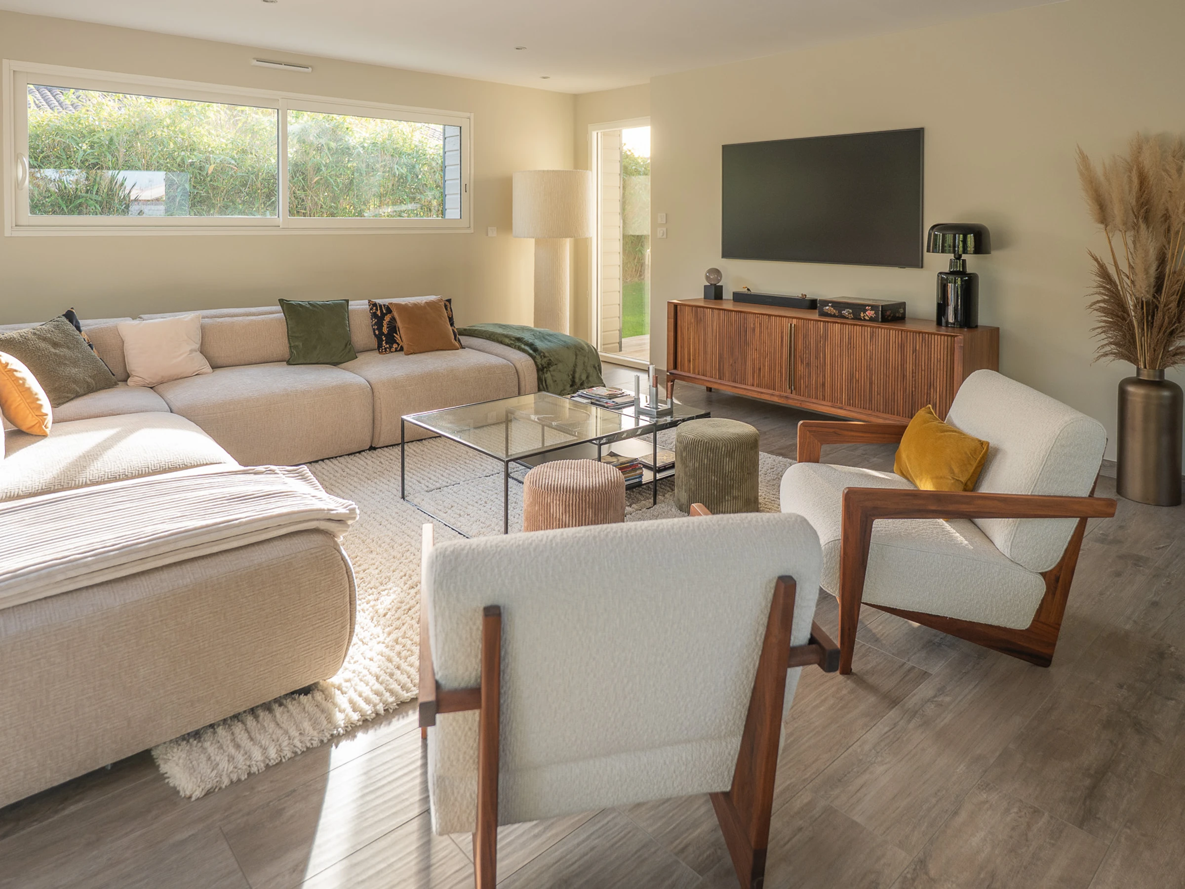 en rez de chaussée , un vaste séjour , salle à manger avec canapé et grande télévision, table et chaise , une cuisine moderne avec plaque induction , lave-vaisselle , réfrigérateur congélateur, micro-ondes. Une arrière cuisine avec lave linge et sèche-linge. Vous trouverez une suite parentale avec lit king-size 180x200 avec sa propre salle d'eau douche et wc. Une deuxième chambre avec un lit de 160x200 , une troisième chambre avec deux lit 80x200 rapprochable , une salle de bain avec douche et baignoire et un wc séparé .