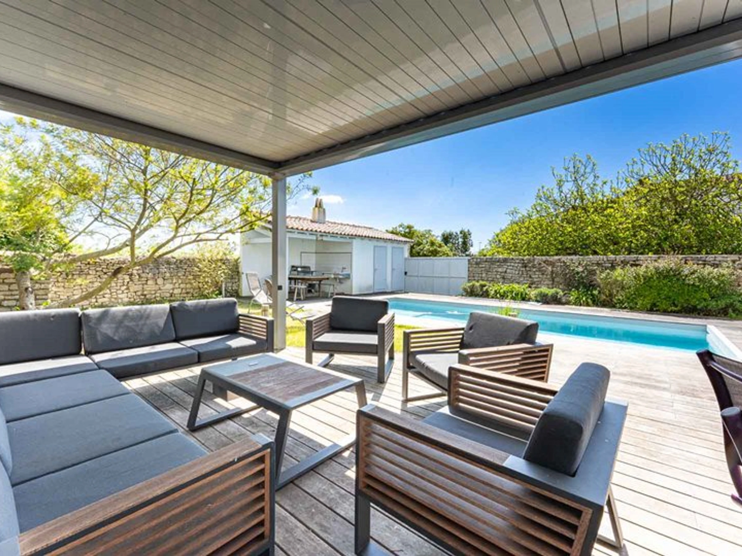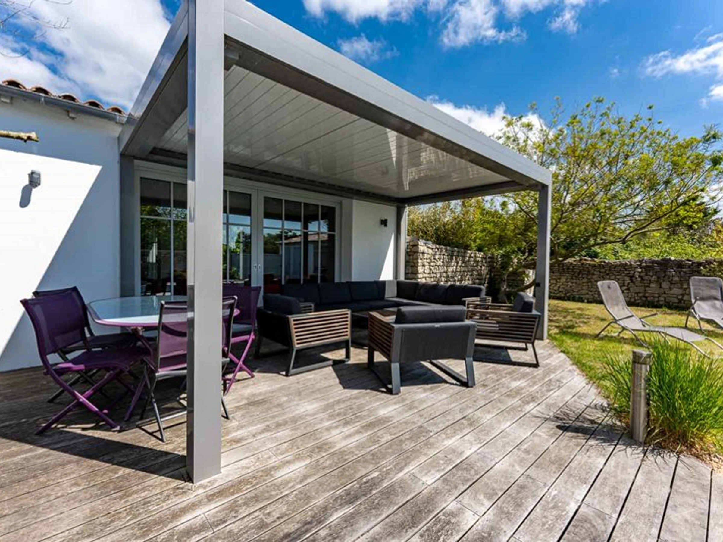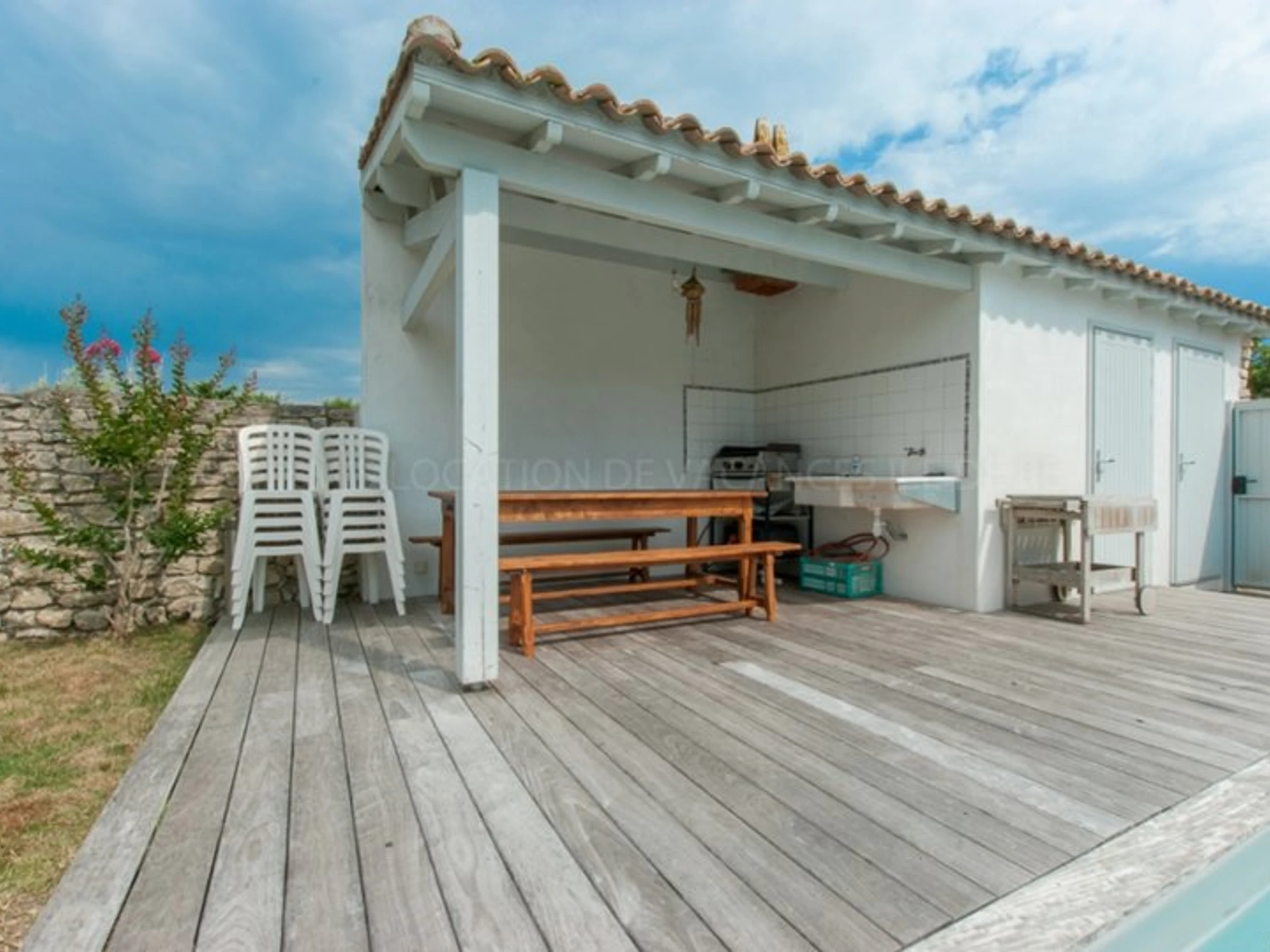 L’extérieur de la maison, orienté au sud, dispose d’une entrée pour les vélos, d’une terrasse bois avec meuble de jardin, préau / cuisine d’été avec table, banc, évier et plancha.