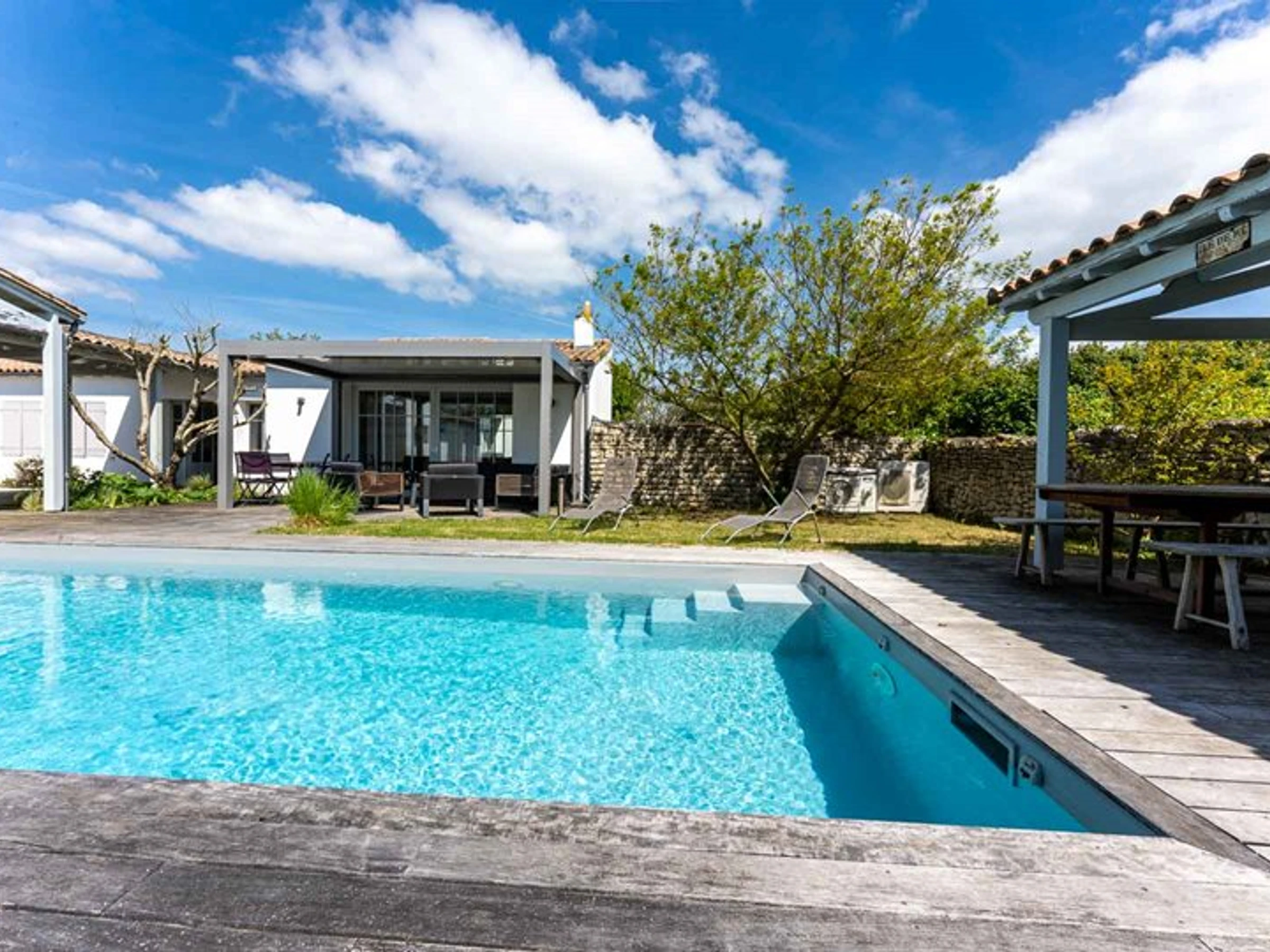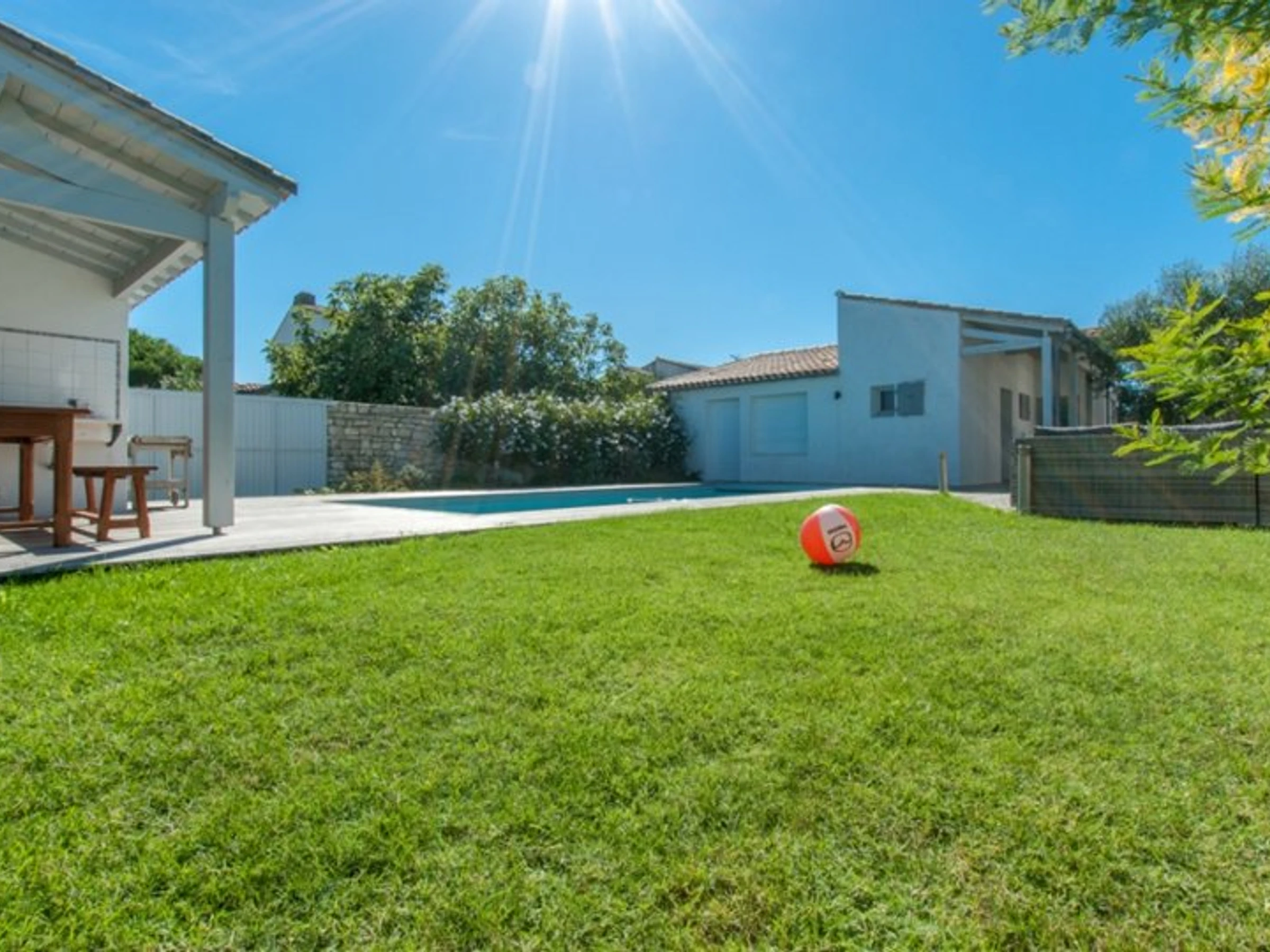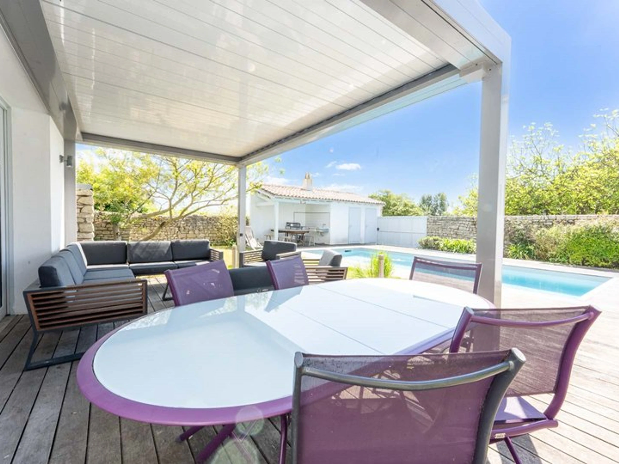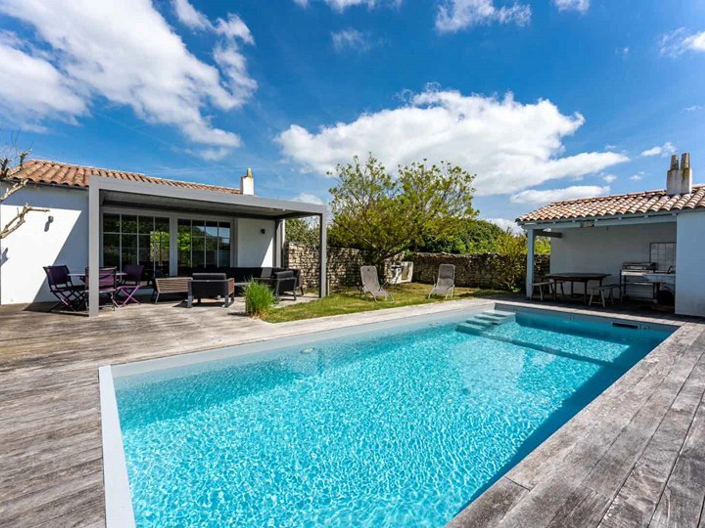 L’extérieur de la maison, orienté au sud, dispose d’une entrée pour les vélos, d’une terrasse bois avec meuble de jardin, préau / cuisine d’été avec table, banc, évier et plancha.
