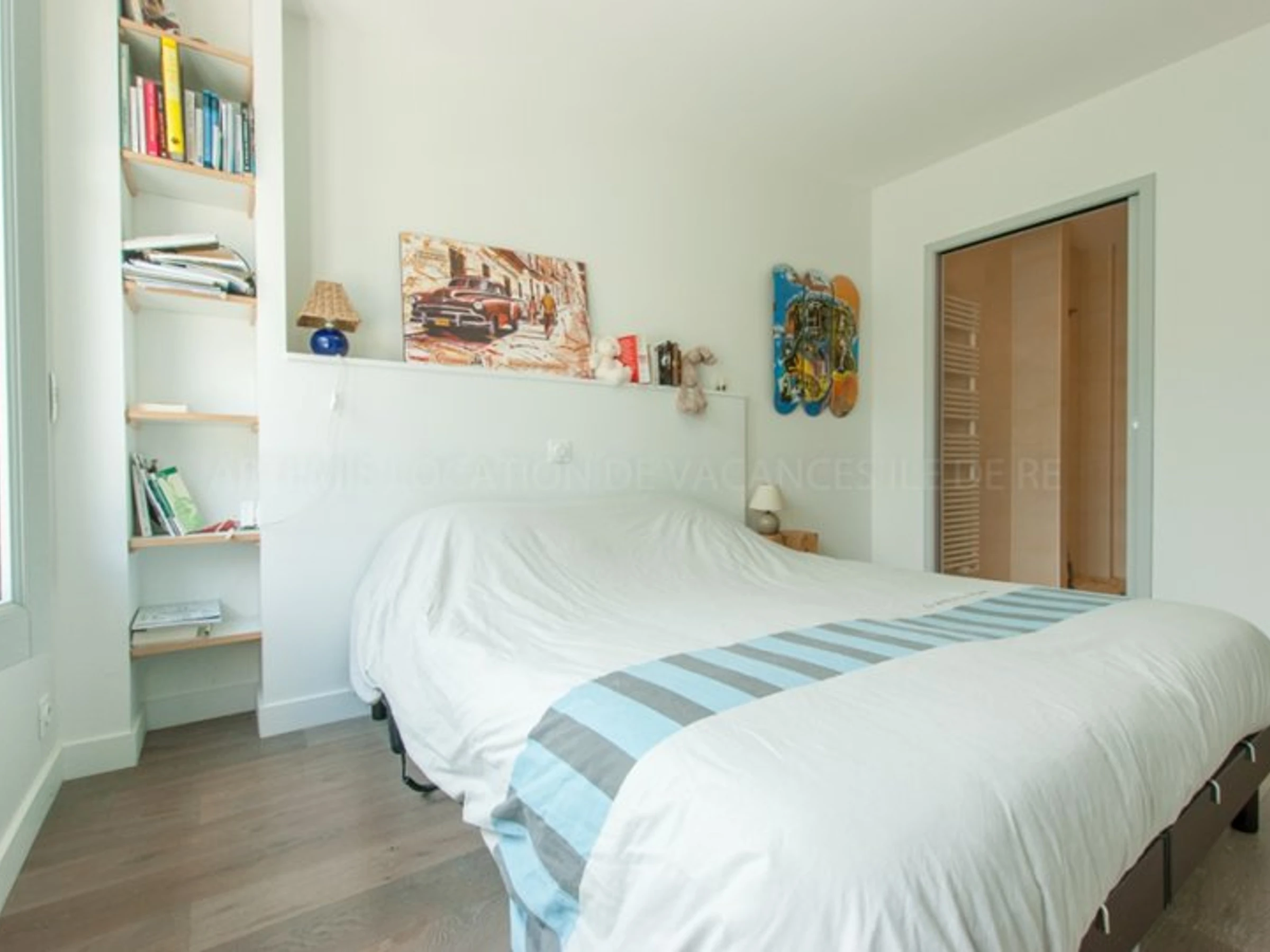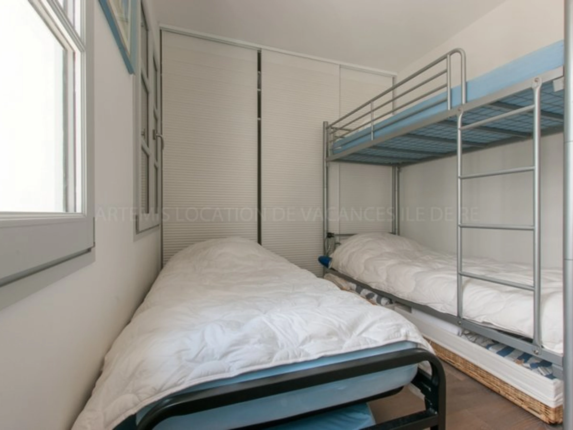 Dans le couloir, un wc, la buanderie et une deuxième chambre de 9m², celle-ci pour enfant ou ados avec 2 lits superposés en 90 cm.
