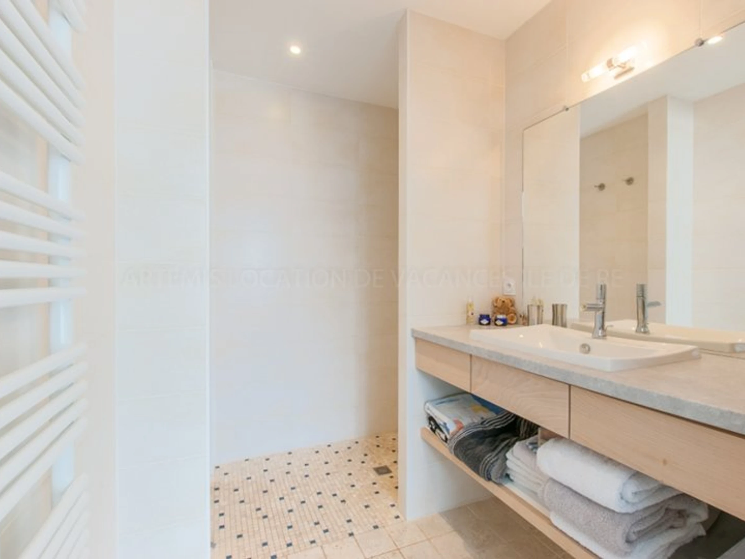 En annexe, de l’autre coté du préau, se trouve la troisième chambre. Elle se compose d’une salle d’eau avec vasque, douche, et wc.