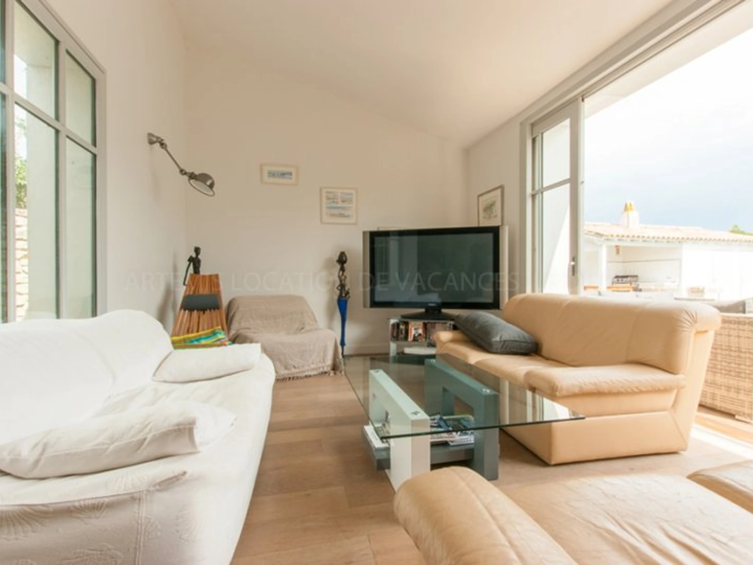 Le séjour de 20m² avec télévision, table basse et canapé, donne accès sur la terrasse avec sa baie vitrée.