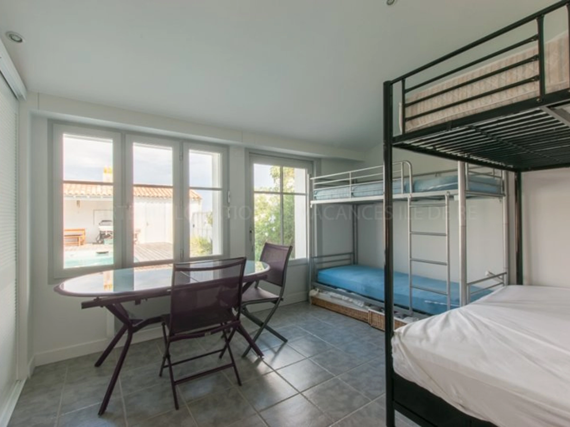 La literie est de 2 lits superposés de 90 cm et 2 lits superposés de 140/160cm. Cette chambre s’ouvre sur la piscine.