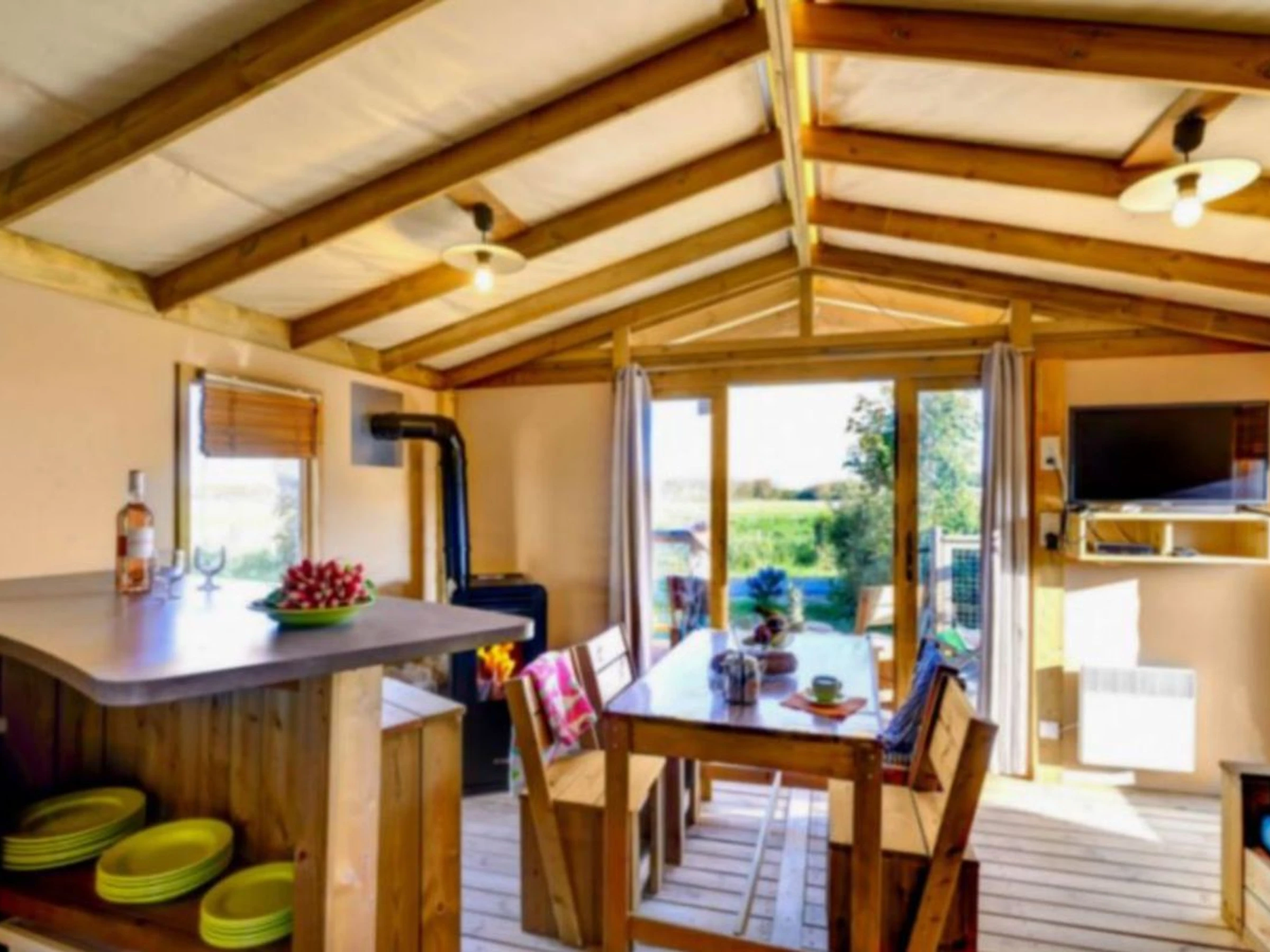 Tente en toile et bois avec terrasse pour 4 personnes