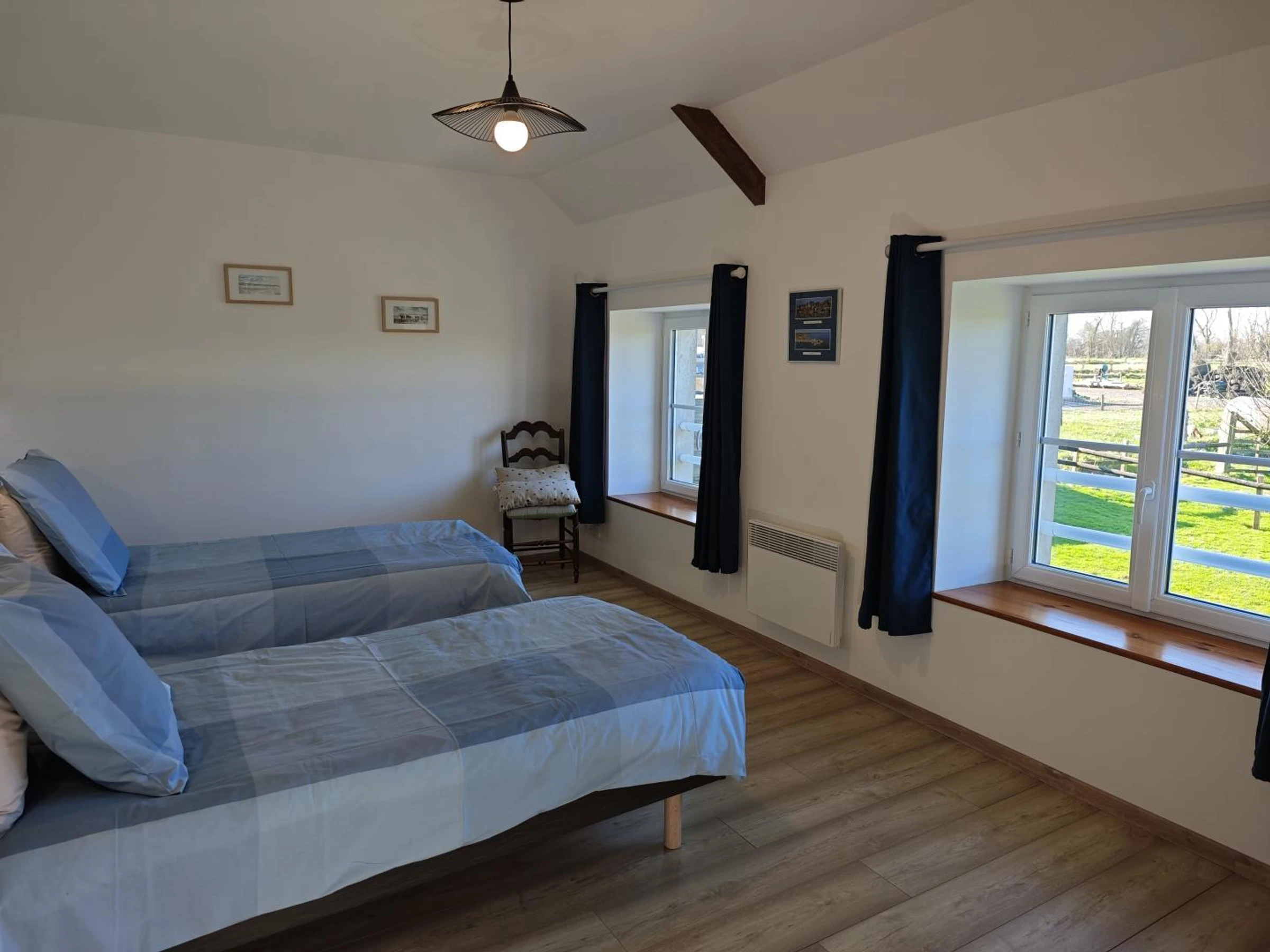 Maison mitoyenne au propriétaire. Au rez-de-chaussée : Séjour avec poêle à bois (TV, Internet Wifi). Coin cuisine toute équipée (plaque induction, four, machine expresso, cafetière à filtre, micro-ondes, lave-vaisselle, compartiment congélateur). Au 1er étage : Chambre 1 (1 lit de 160x200). Chambre 2 (2 lits de 90x190). Salle d'eau avec WC (douche). Lave-linge. Chauffage central fuel et convecteurs électriques. Bois fourni sur demande. Toutes charges comprises excepté la recharge de véhicule électrique. Jardin non clos privé. Cour gravillonnée à l'arrière de la maison. Salon de jardin. Barbecue. Abri couvert. Parking. Draps et linge de toilette fournis. Service ménage en option. Équipement bébé sur demande (lit parapluie, chaise haute et baignoire). C'est dans le cadre de cette magnifique ferme du Cotentin (ferme laitière en activité) que vous séjournerez. La pierre blanche locale confère à ces édifices un charme certain. L'endroit est paisible et parfaitement positionné à proximité des plages et des sites connus du Débarquement.