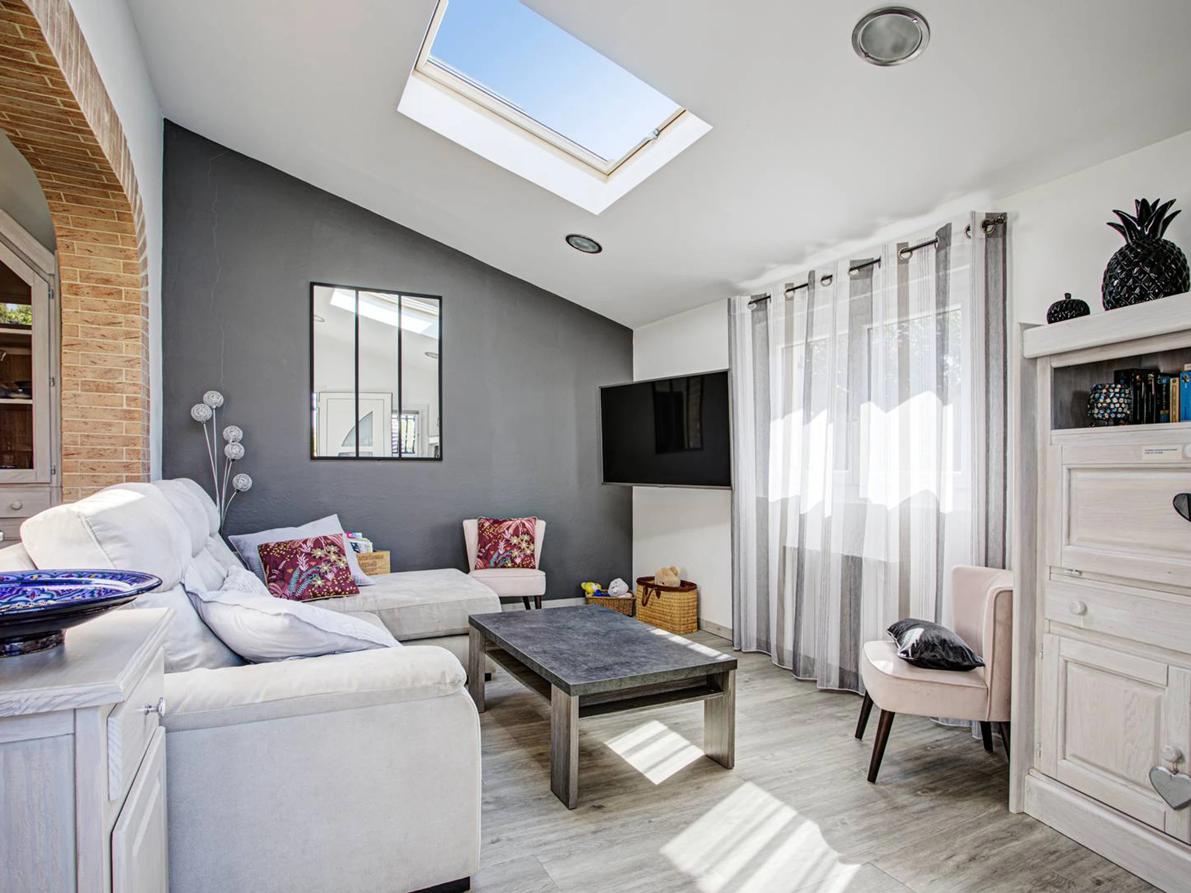 Le salon dispose d'un canapé d'angle, d'une télévision et d'un accès wifi.