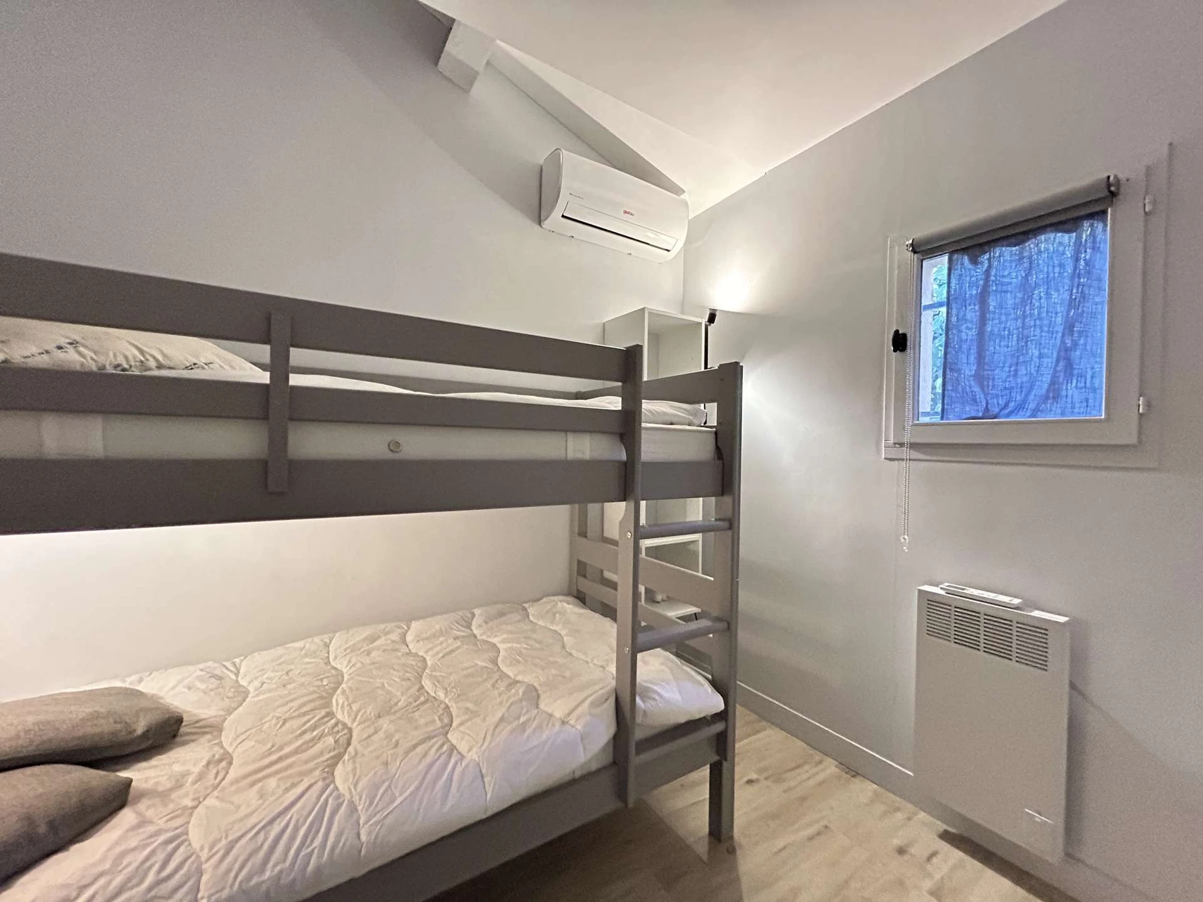 Coté nuit au rez-de-chaussée une petite chambre avec lits superposés avec dressing ainsi qu'une salle d’eau équipée d'une cabine de douche et un WC indépendant.