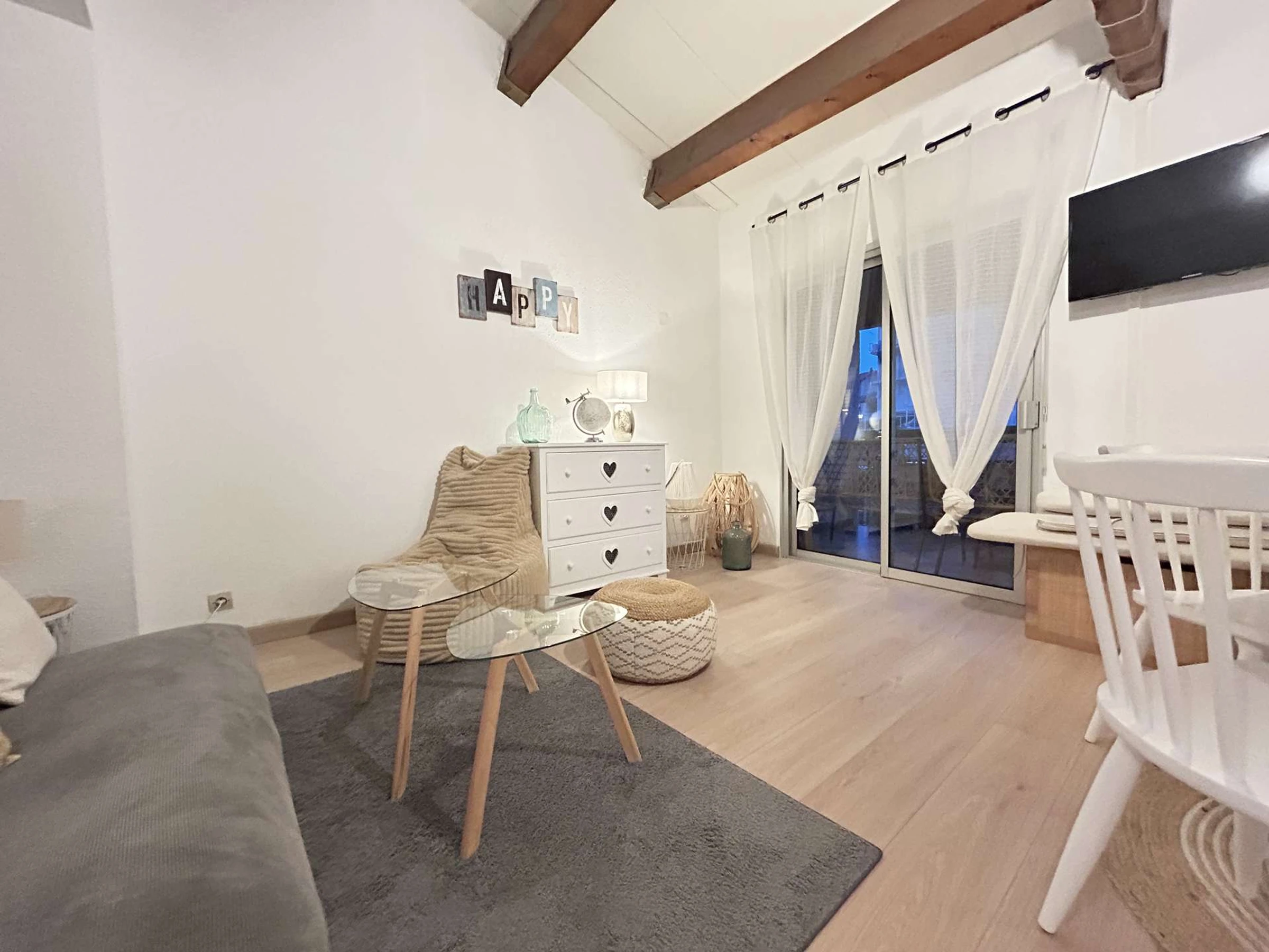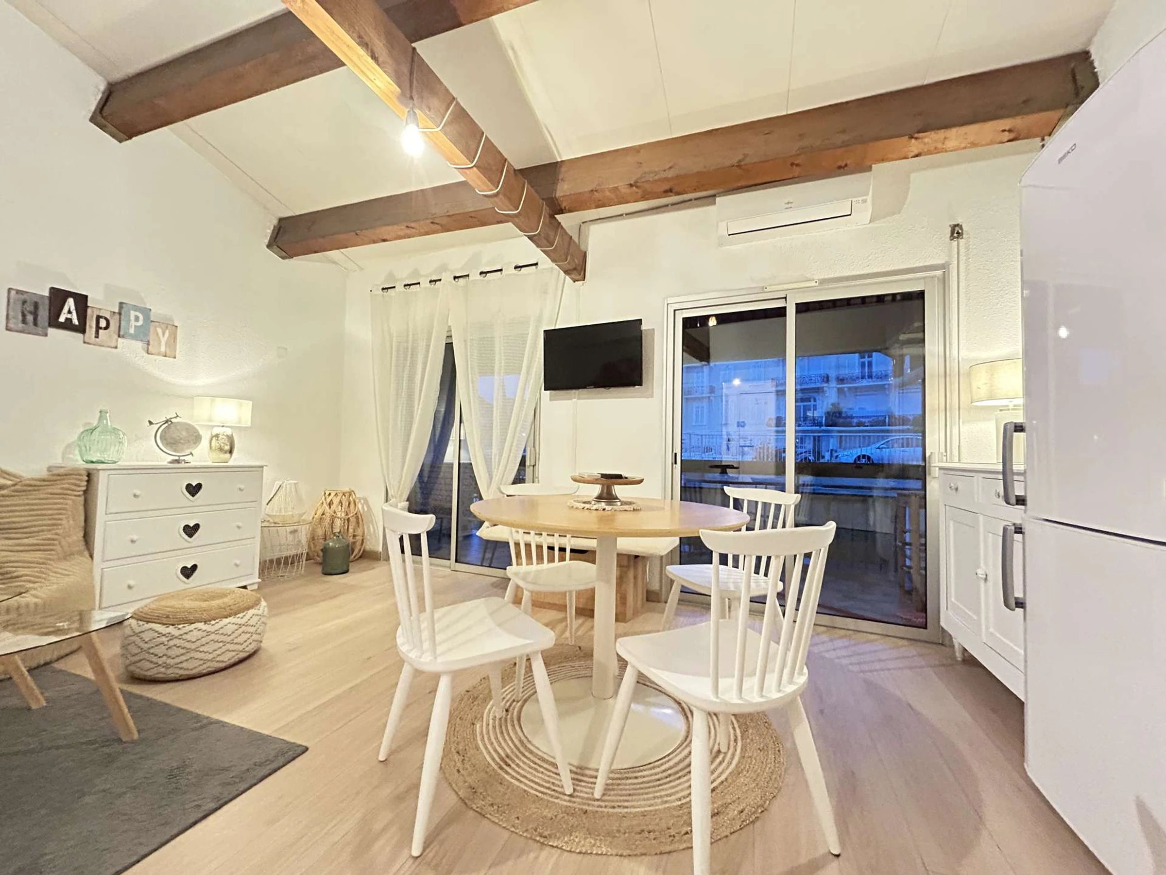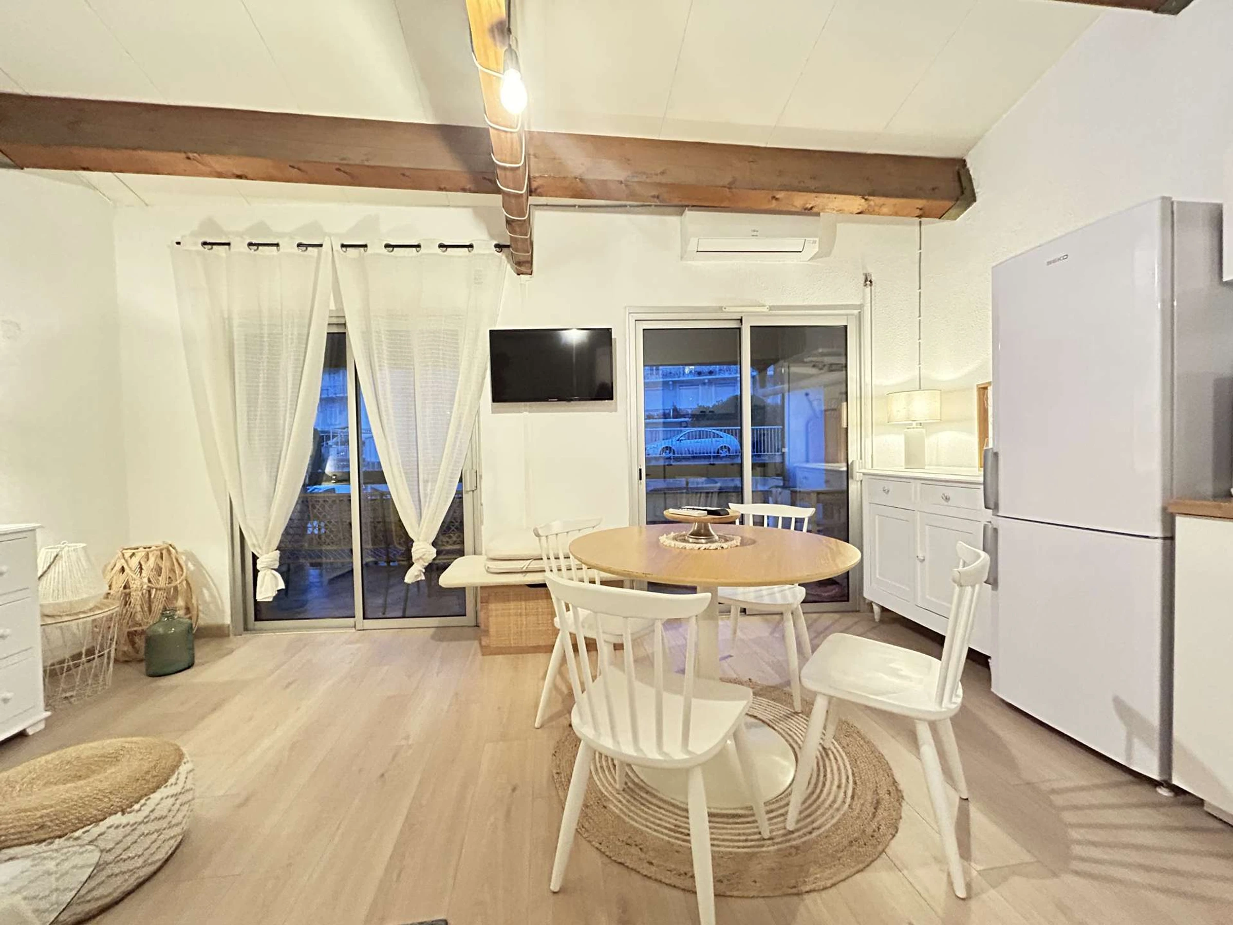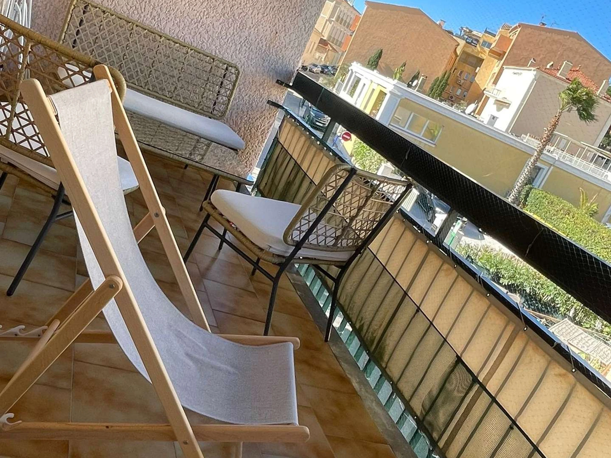 Cet appartement de vacances climatisé comprend une entrée, d'un séjour lumineux avec un canapé, une cuisine équipée aménagé, une chambre en mezzanine avec un lit double, une salle d'eau avec wc, une jolie petite terrasse 11M2 avec salon de jardin et des chilienne dans une rue calme à la vue dégagée.