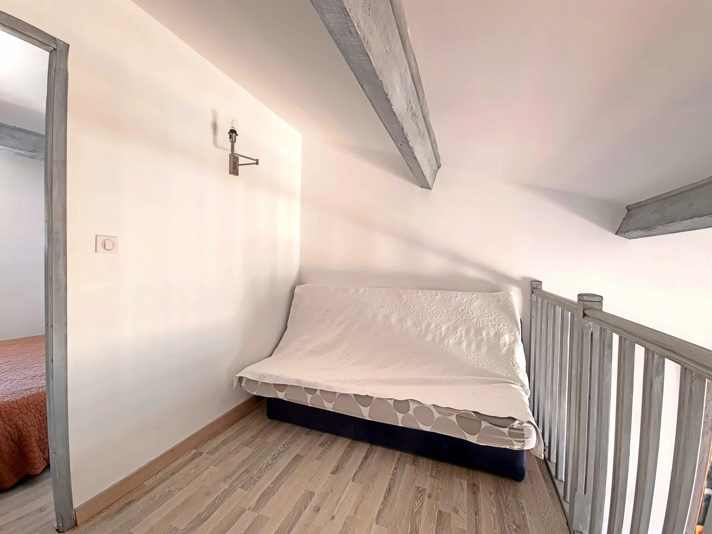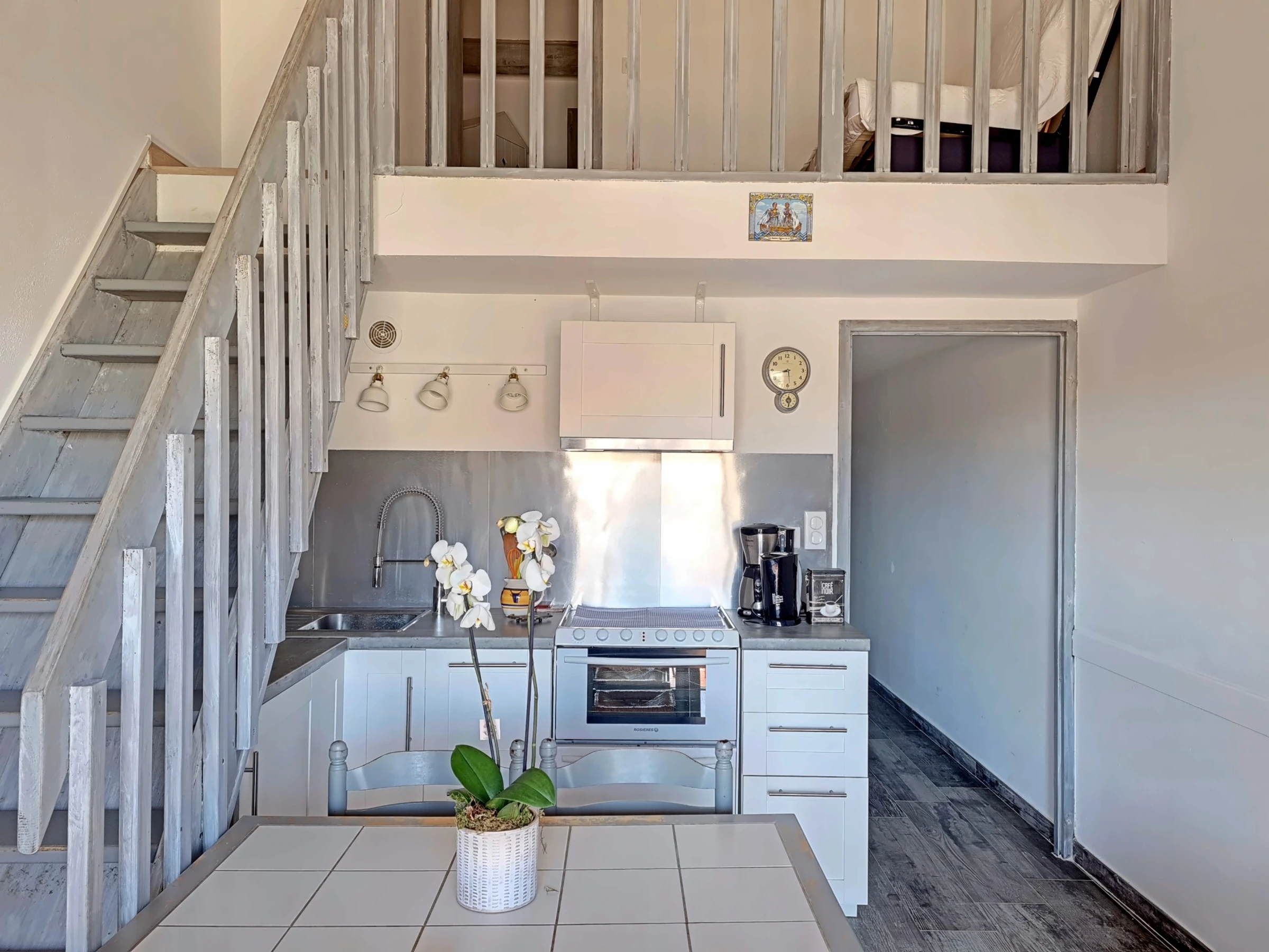 Résidence les Salins.Située à deux pas de la mer, appartement de type duplexe au 1er étage comprenant hall d'entrée avec cellier, une salle d'eau, wc, séjour avec coin cuisine équipée donnant sur un balcon ou l'on voit la mer. A l'étage vous y trouverez une chambre fermée avec un lit en 140cm et un couchage sur la mezzanine pour 2 personnes.