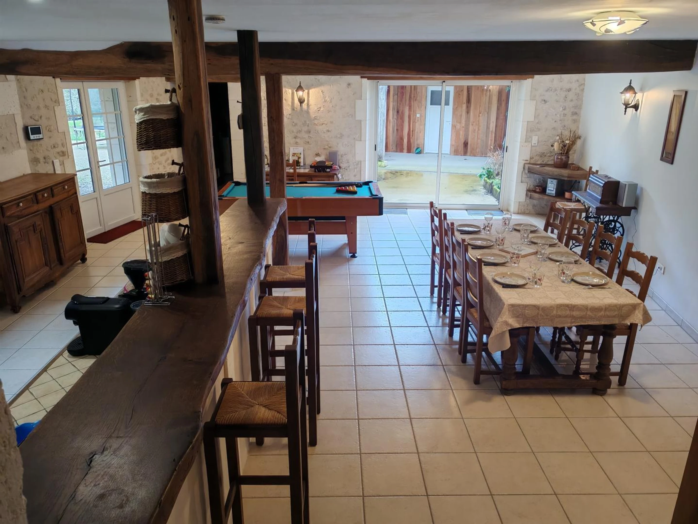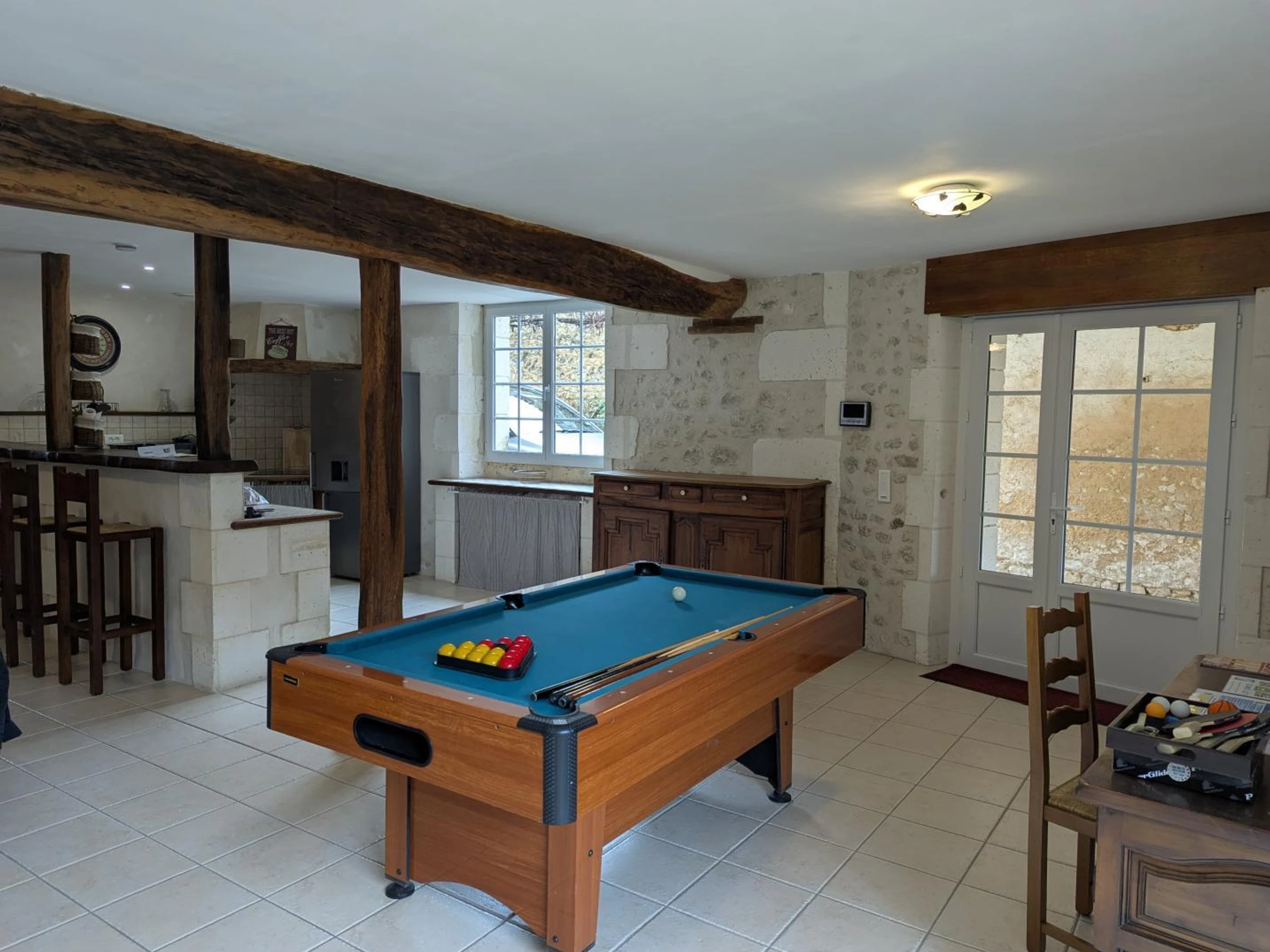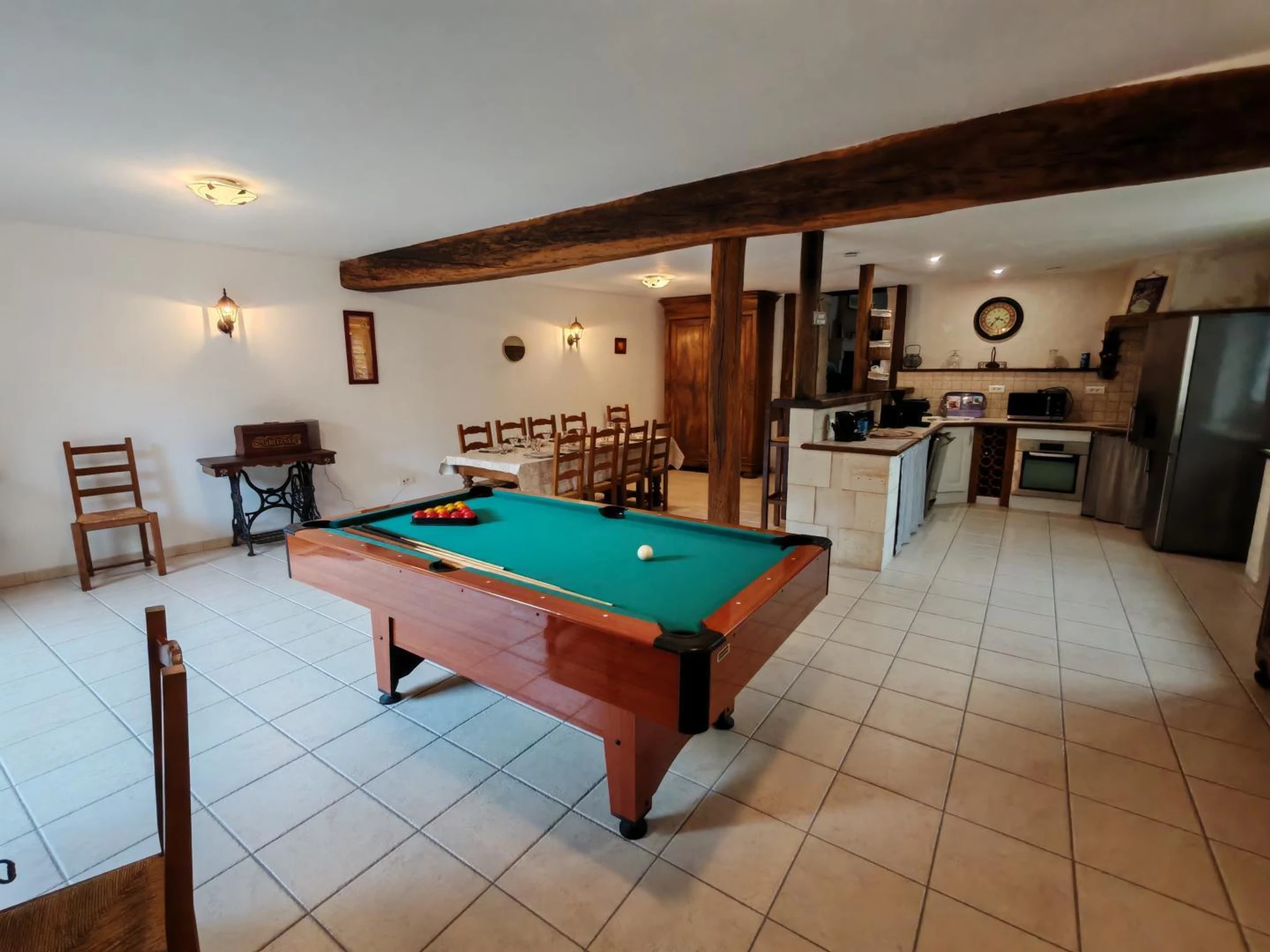 Salon avec poêle à granulés (1er sac offert, puis 10€/sac), accès par 4 marches descendantes au vaste séjour (billard) avec cuisine et espace repas donnant sur la terrasse, wc indépendants, salle d'eau.