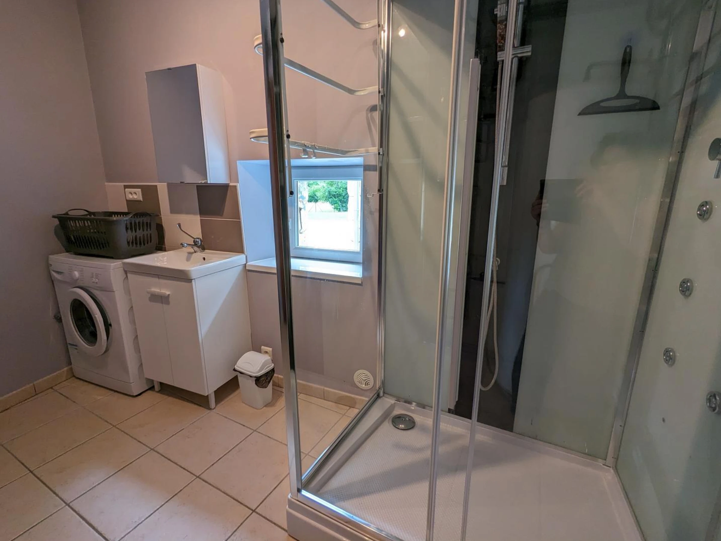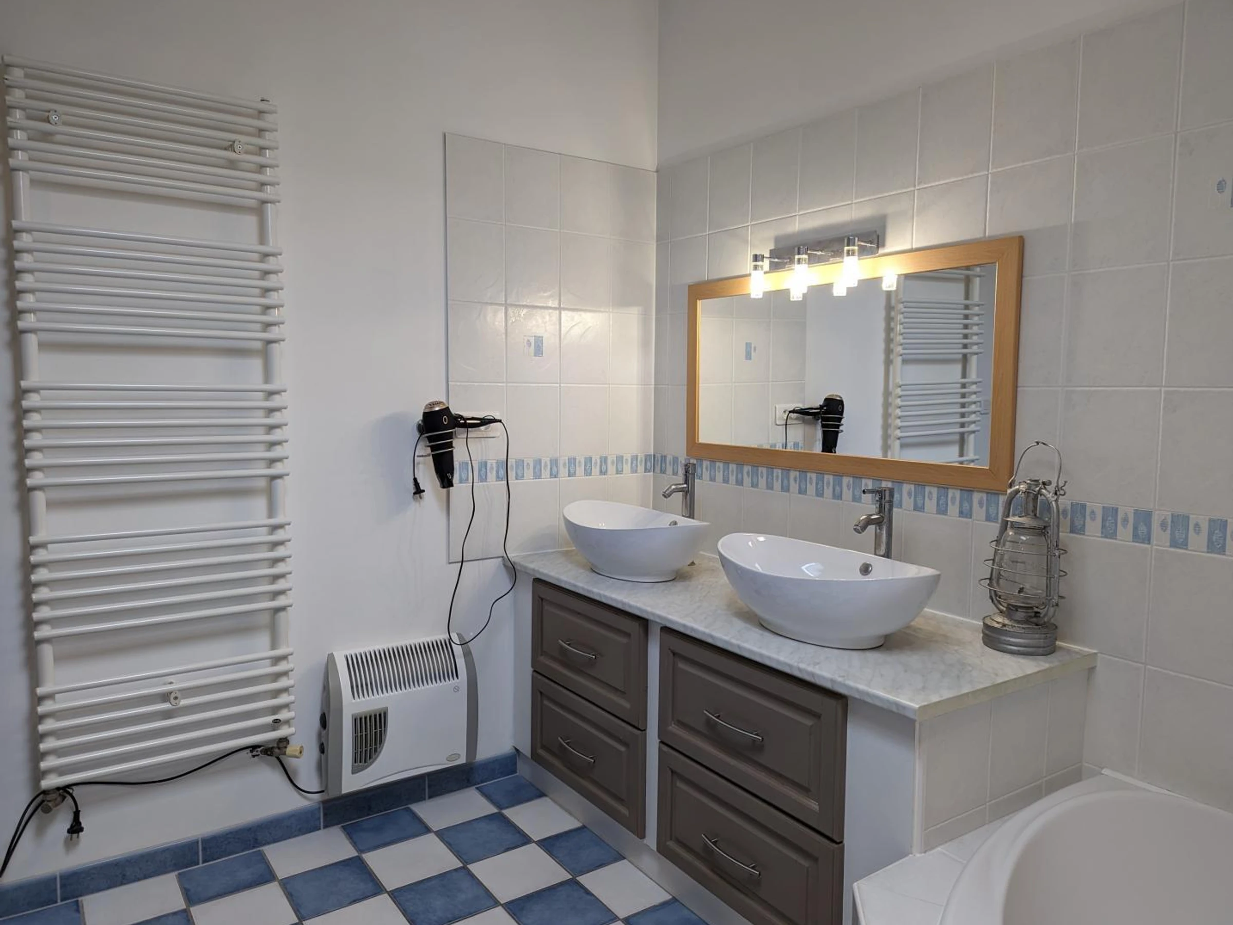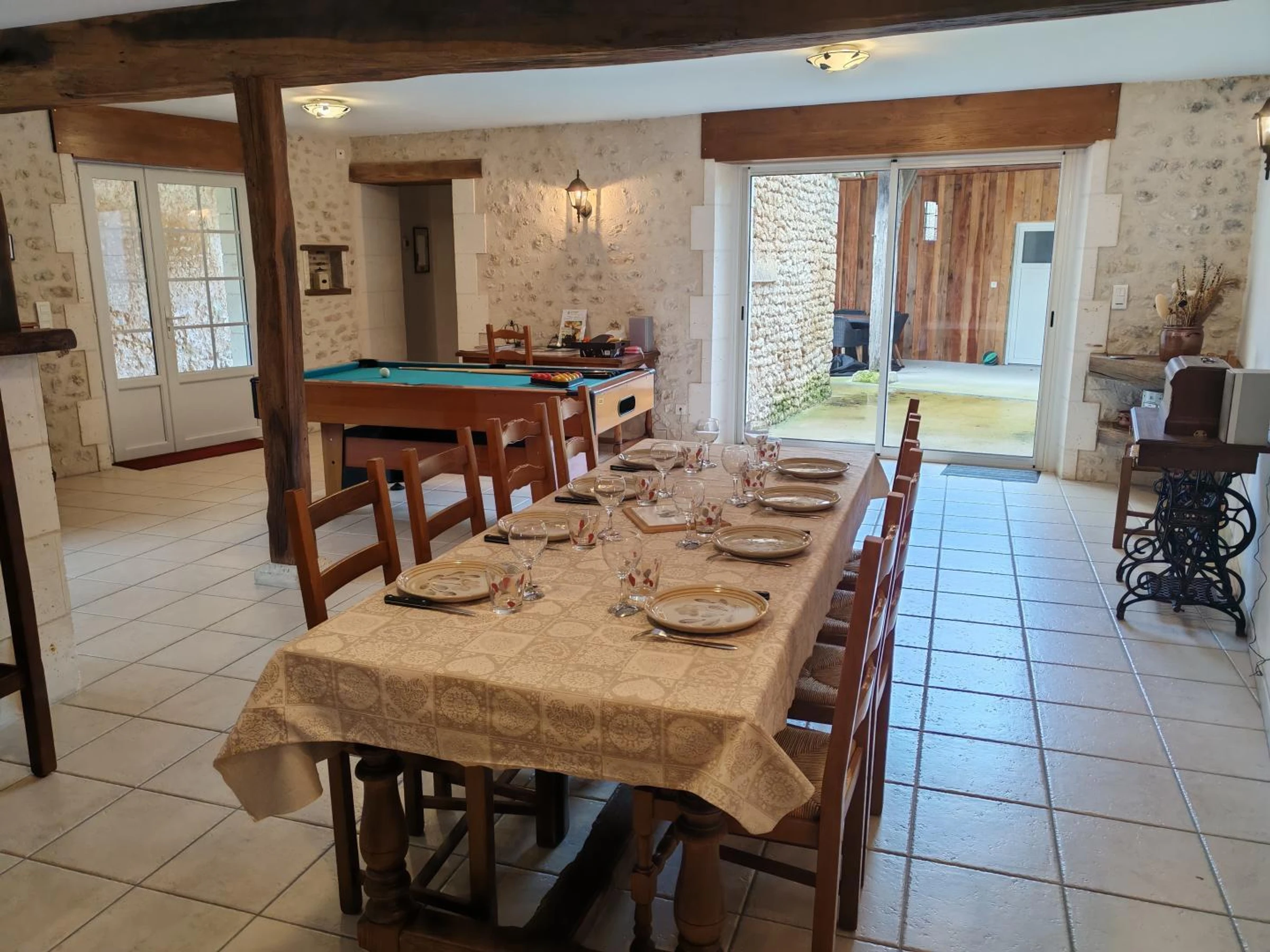 Salon avec poêle à granulés (1er sac offert, puis 10€/sac), accès par 4 marches descendantes au vaste séjour (billard) avec cuisine et espace repas donnant sur la terrasse, wc indépendants, salle d'eau.