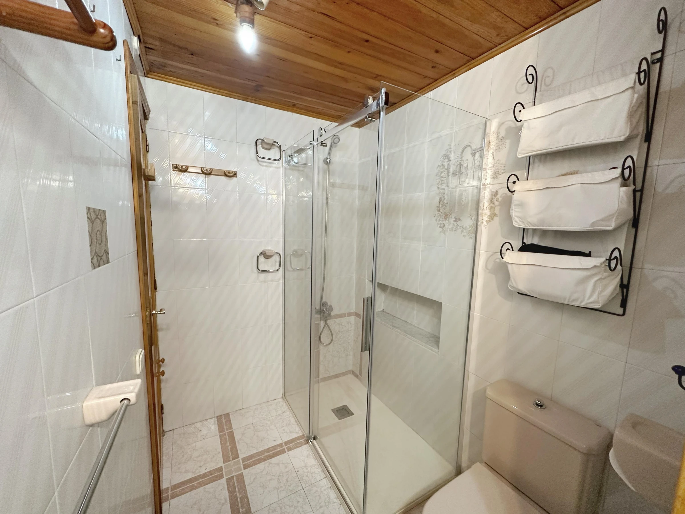 comprend une salle de bain avec douche, 2 chambres avec un lit double et dans