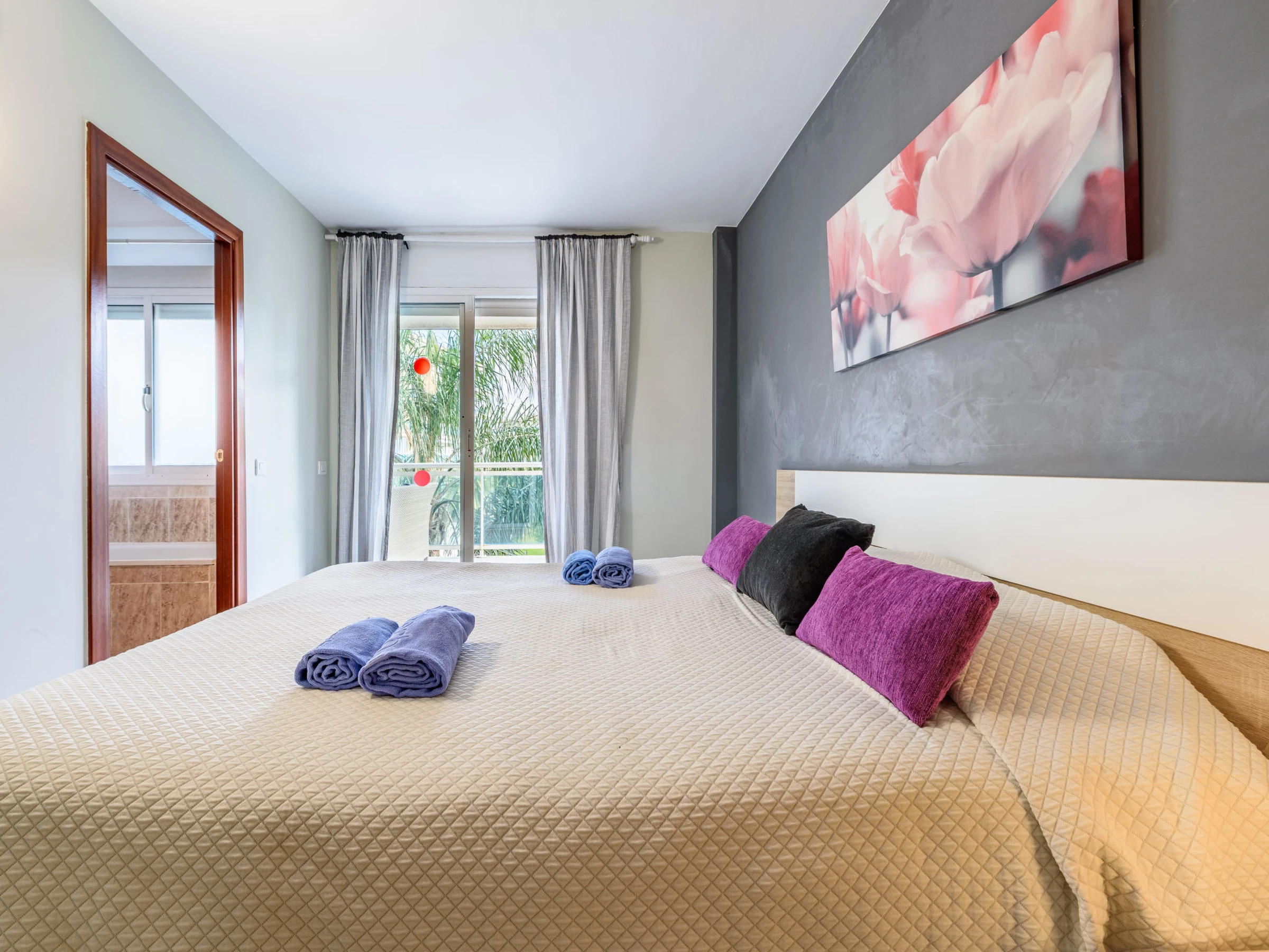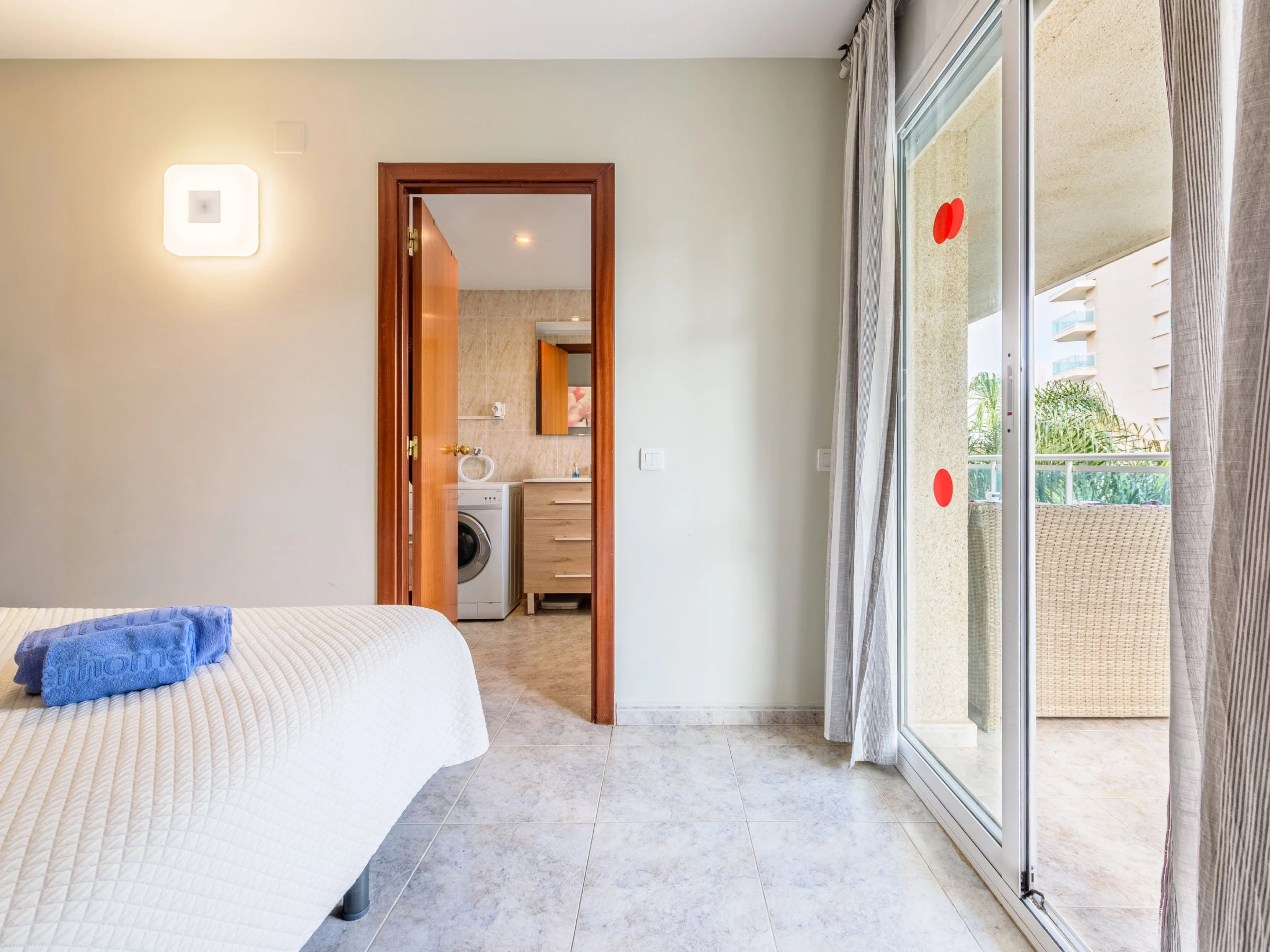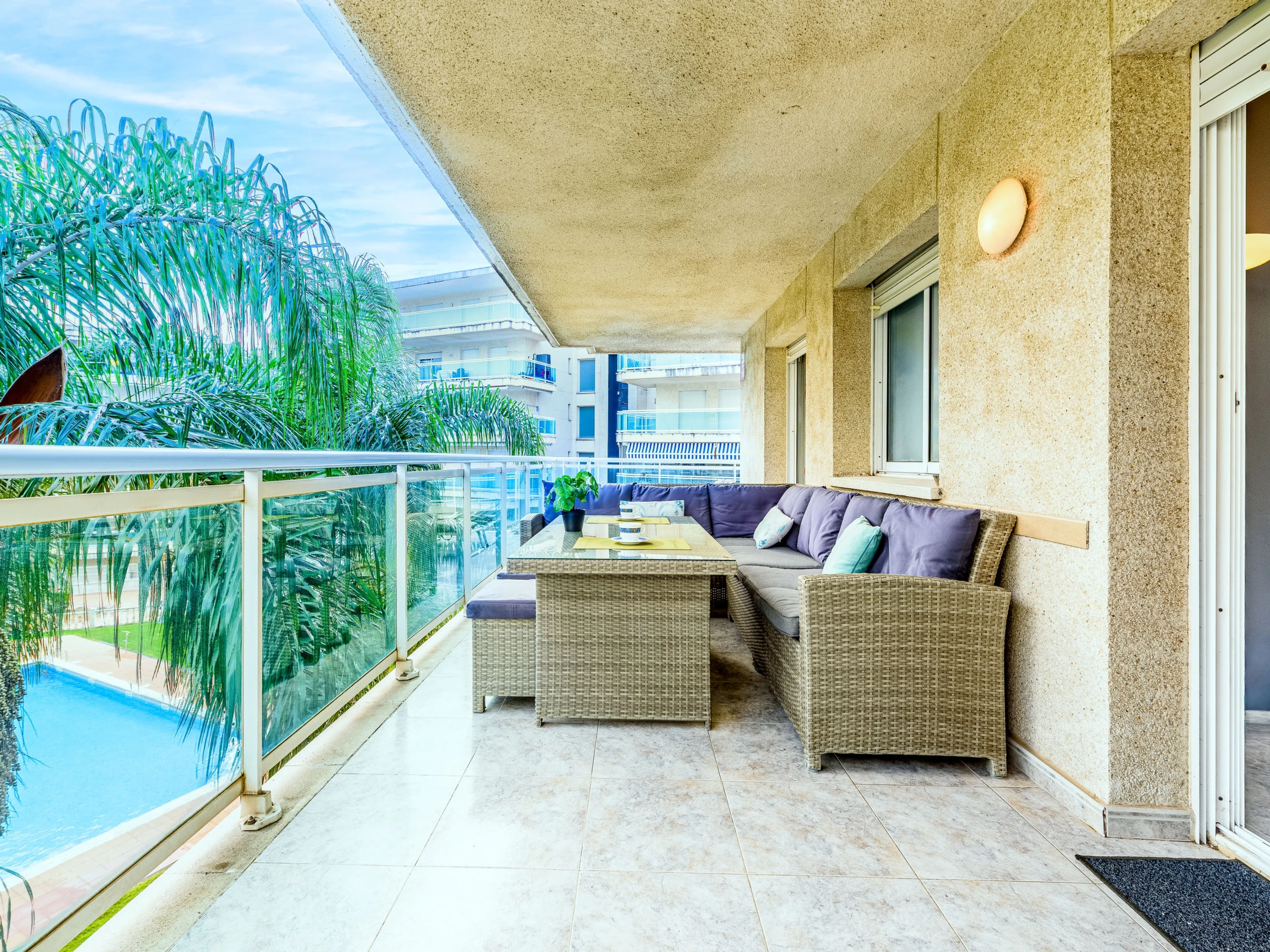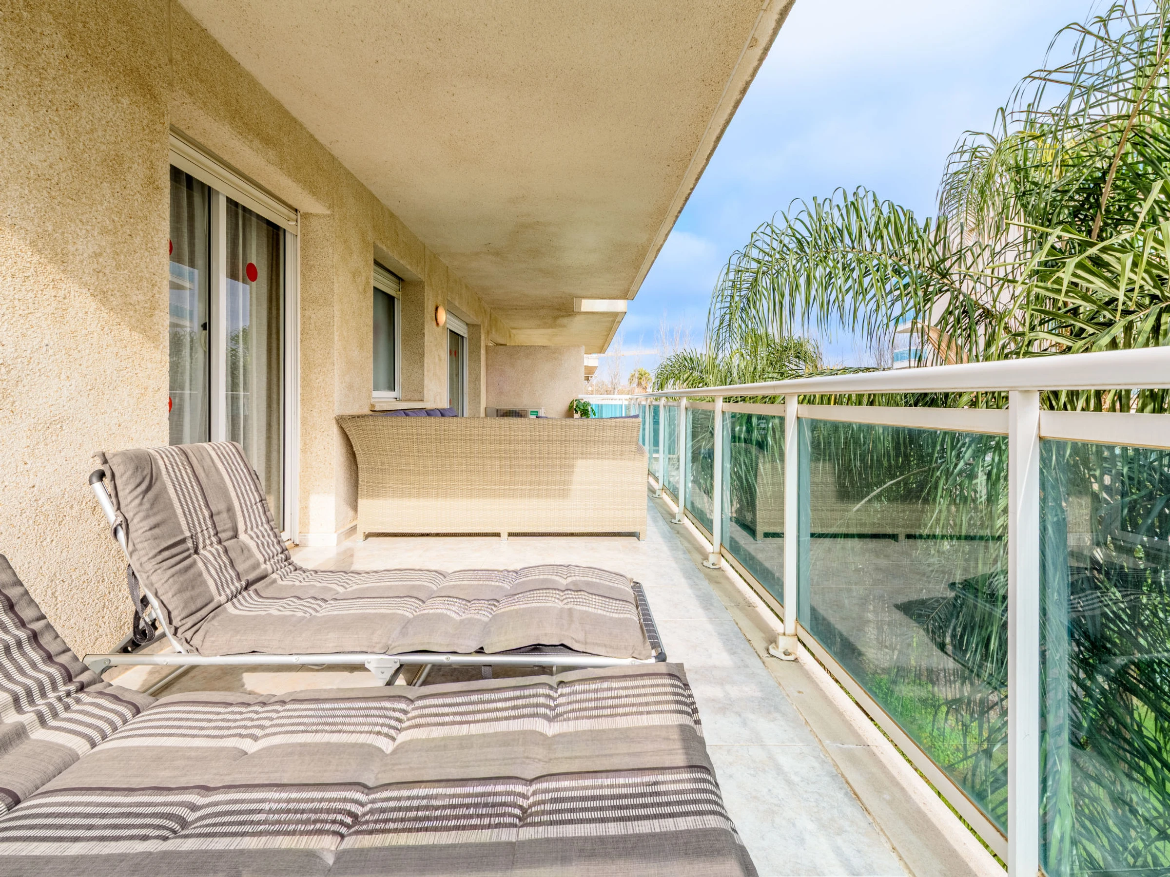 "Villa Park", apt 3 pièces 60 m2 au 3ème étage. Aménagement fonctionnel et plaisant: séjour/salle à manger avec TV et Télévision numérique (écran plat). Sortie sur la terrasse. 1 chambre avec 1 grand-lit (150 cm, longueur 190 cm). Sortie sur la terrasse. 1 chambre avec 2 lits (90 cm, longueur 190 cm). Cuisine (four, lave-vaisselle, 4 plaques vitrocéramiques, micro-ondes, cafetière électrique, Capsules pour machine à café (Dolce Gusto) (NON INCLUSES)) avec chauffe eau (50 litres). Bain/WC, douche/WC. Air-conditionné, chauffage à air chaud. Grande terrasse 24 m2. Mobilier de balcon, chaises longues (2). Vue sur la piscine. A disposition: lave-linge, fer à repasser, sèche-cheveux. Internet (Connexion WIFI, gratuit). Veuillez noter: logement non-fumeur. Maximum 1 animal/ chien de petite taille autorisé. [hidden] // Reg. Nr.: ESFCTU00004302400064847000000000000000[hidden]-721