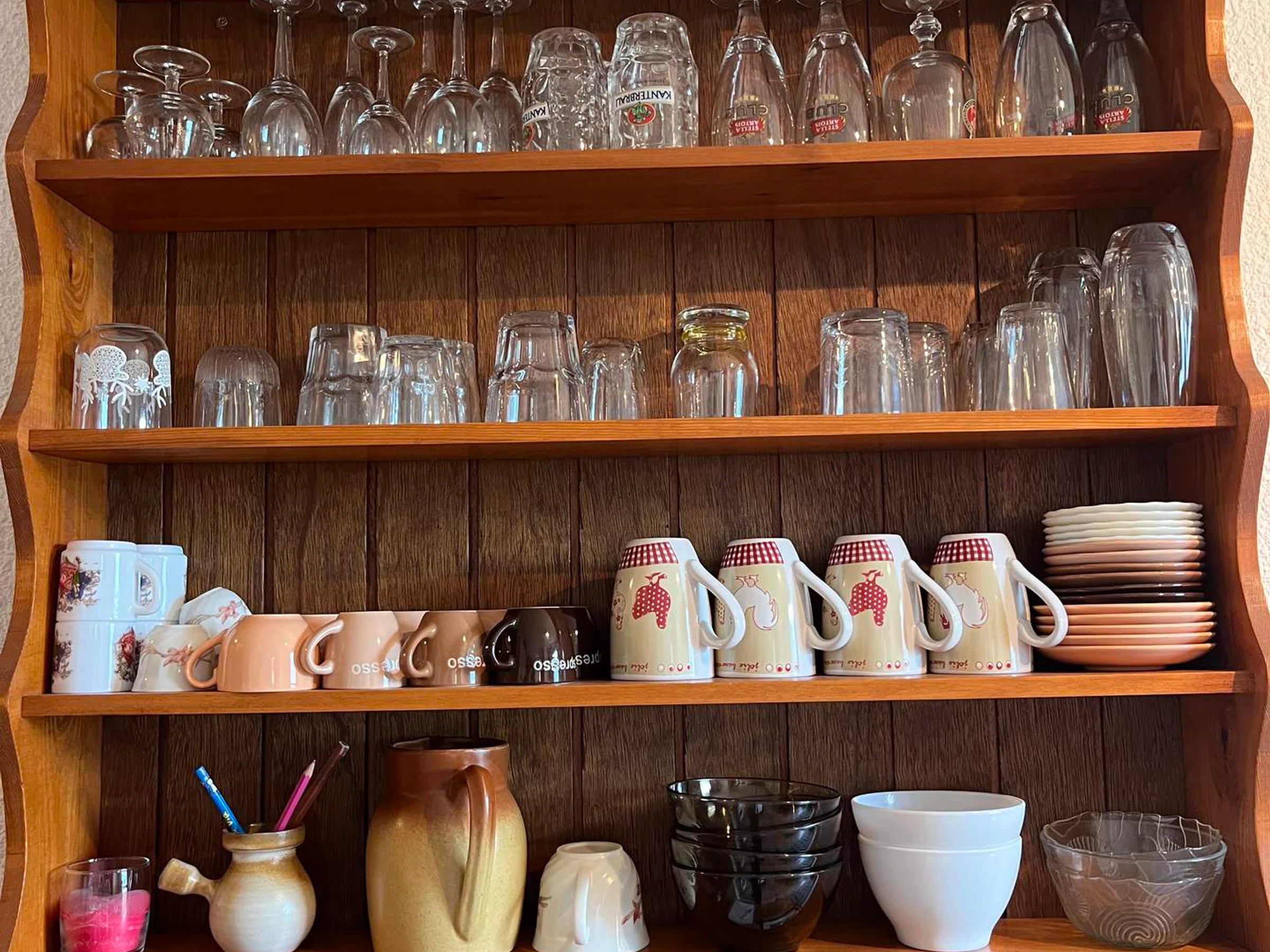 Cuisine équipée avec plaques électriques 2 feux, réfrigérateur, four, micro-ondes, cafetière filtre, bouilloire.