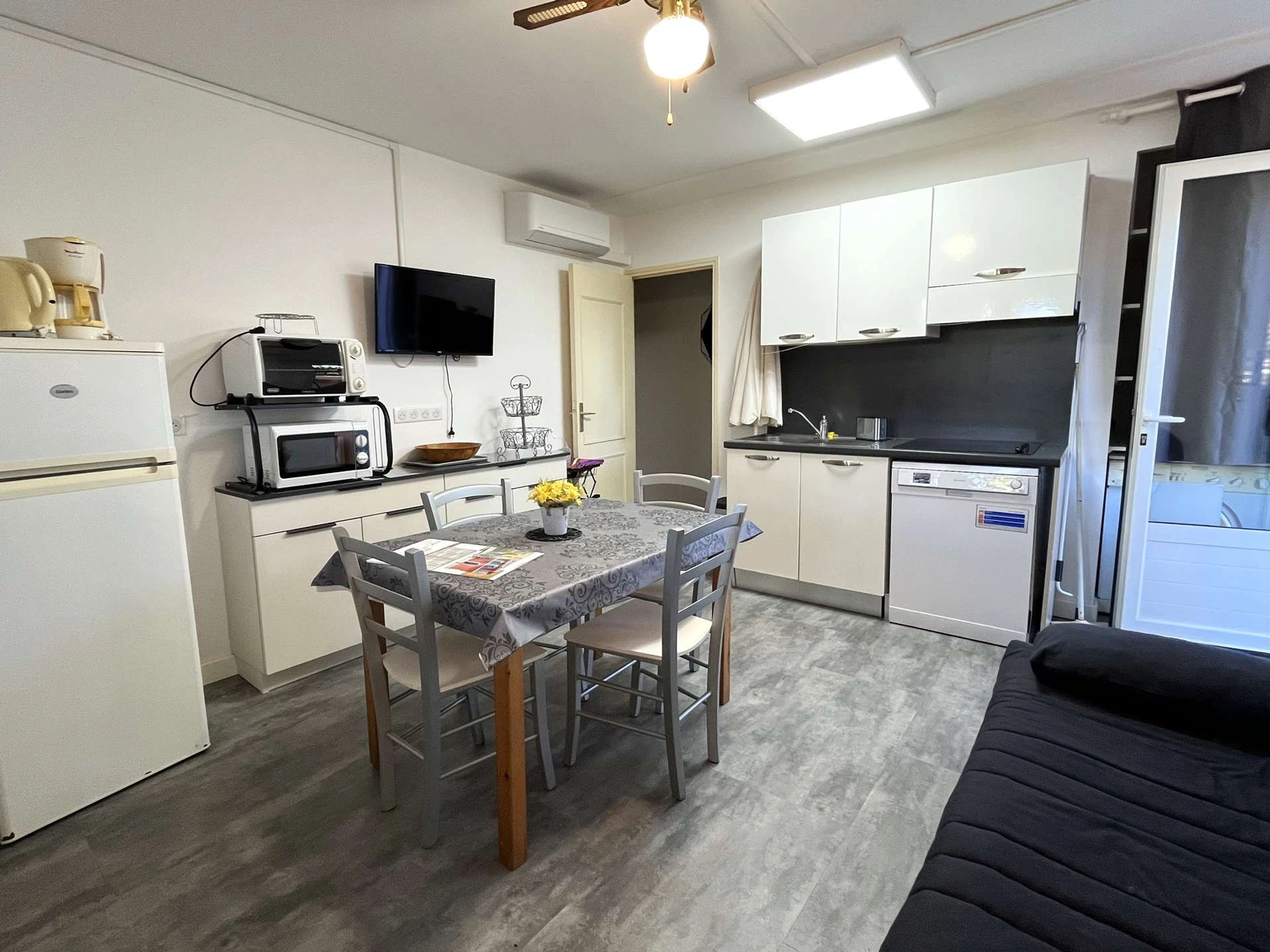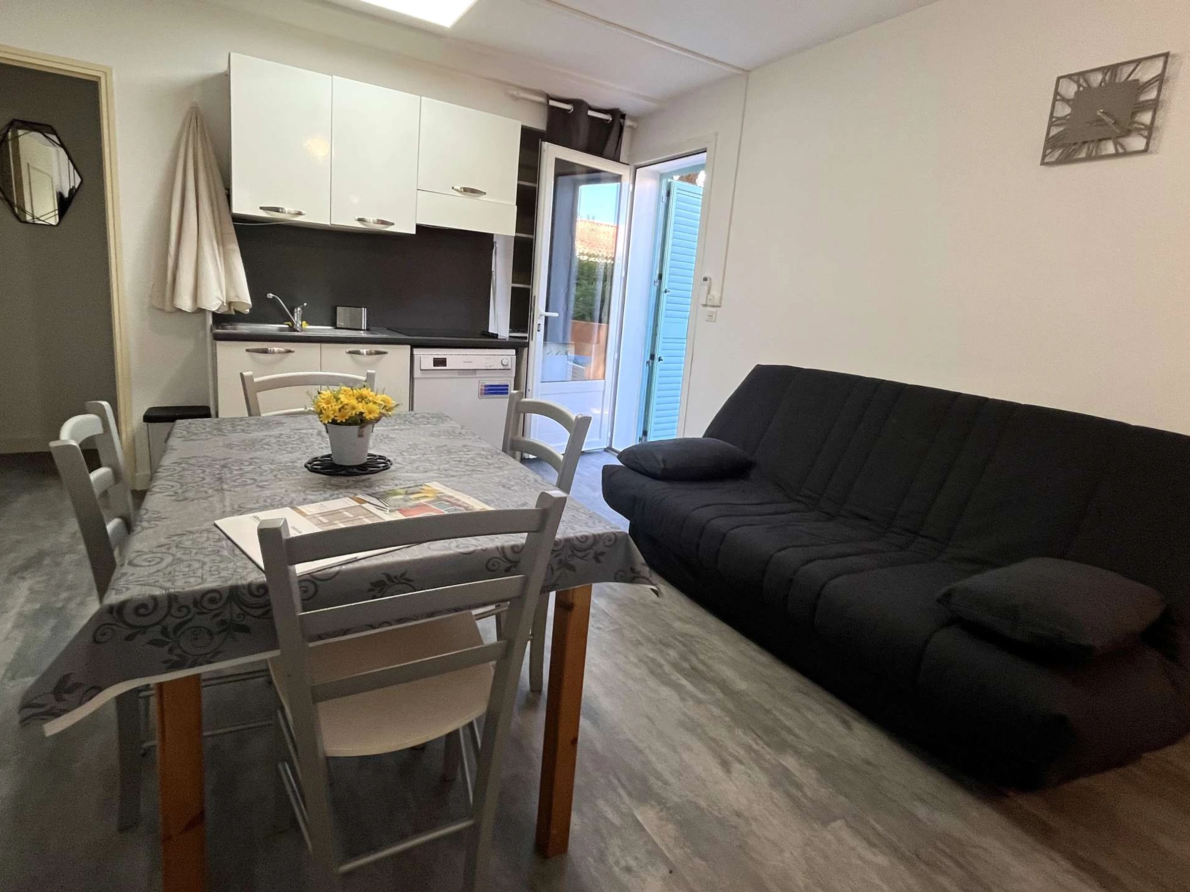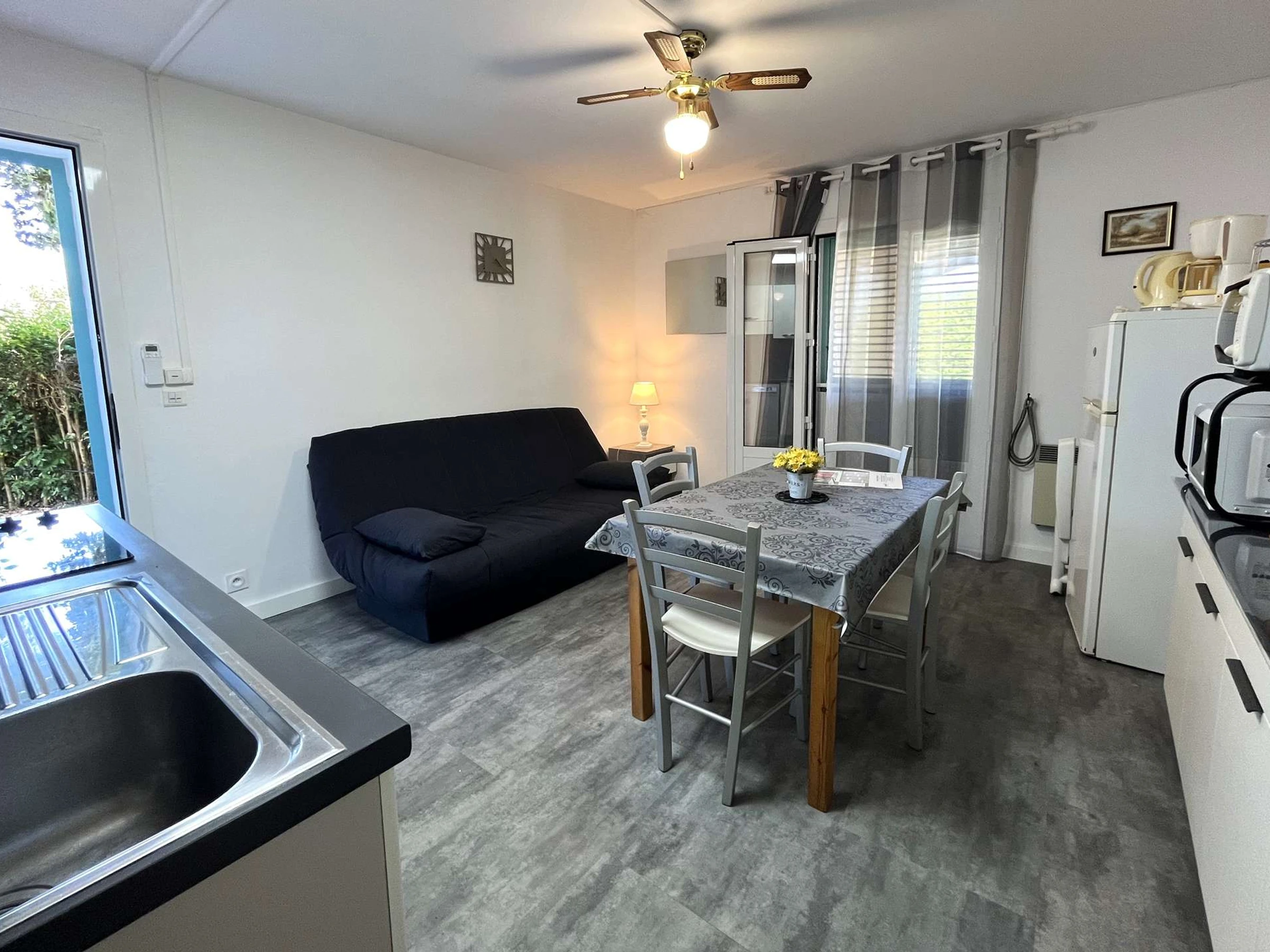 Nous vous proposons un séjour avec coin cuisine équipé ( lave-linge, lave-vaisselle, frigo, micro-ondes) TV et canapé clic-clac, une chambre familiale avec 2 lits superposés ( 4 couchages), une salle d'eau avec douche et WC, une terrasse à l'abri des regards avec barbecue pour des moments à partager!