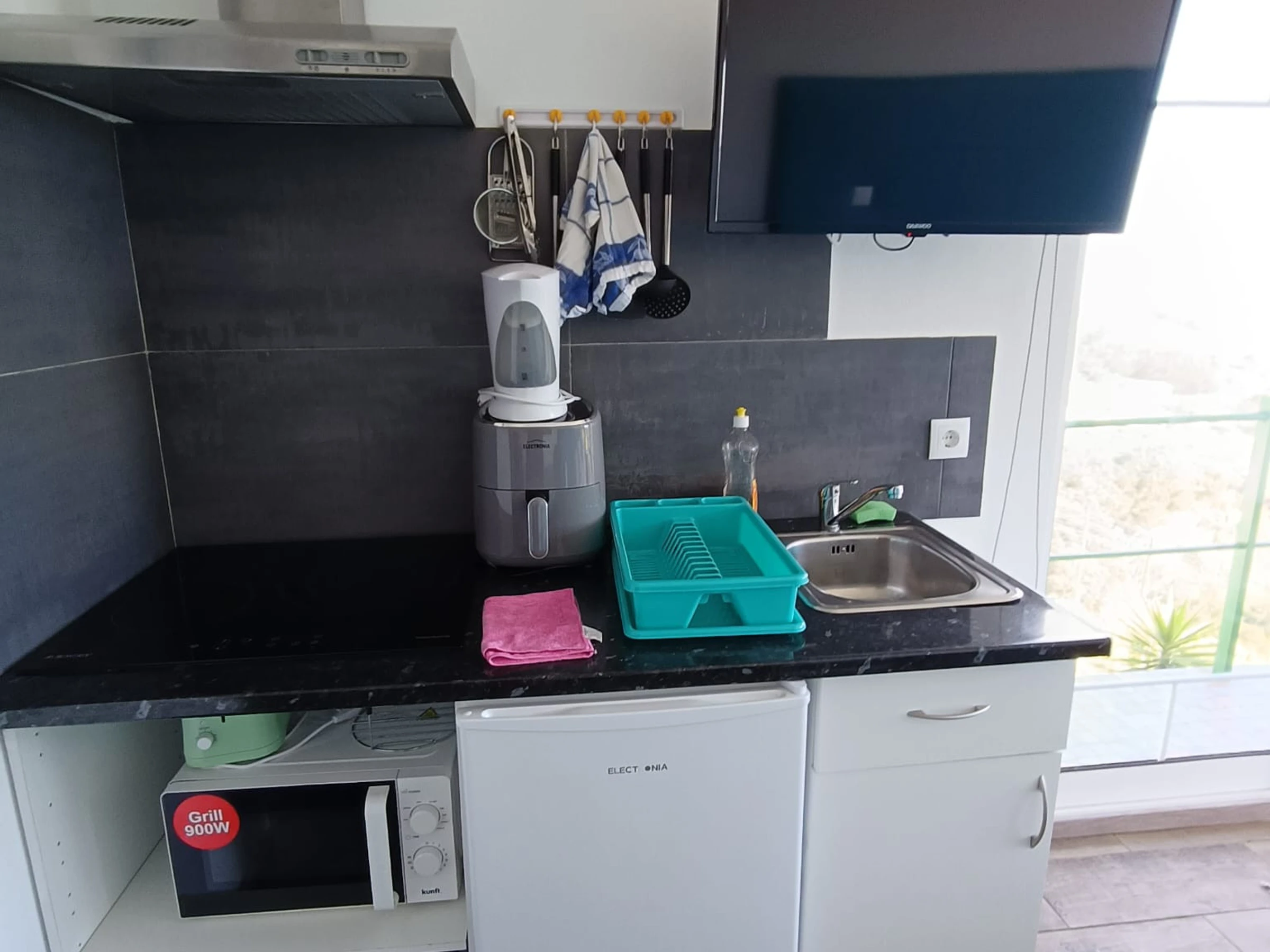 La cuisine américaine, à induction, est équipée avec réfrigérateur, micro-ondes, congélateur, vaisselle/couverts, ustensiles/cuisine, grille pain et bouilloire.