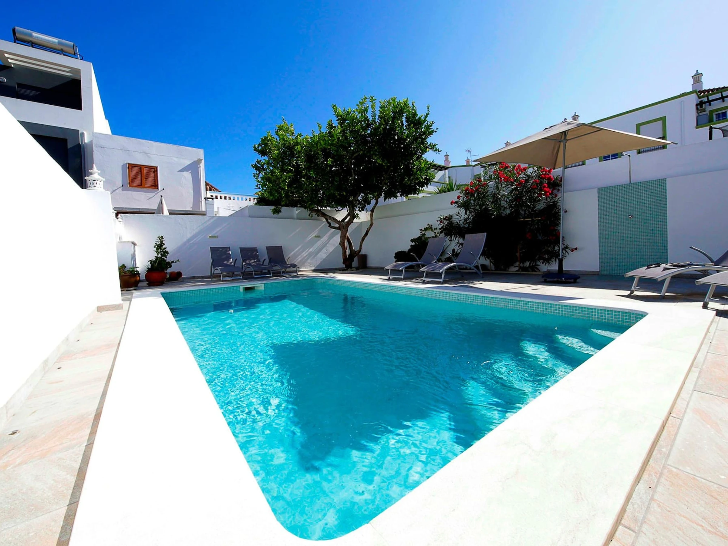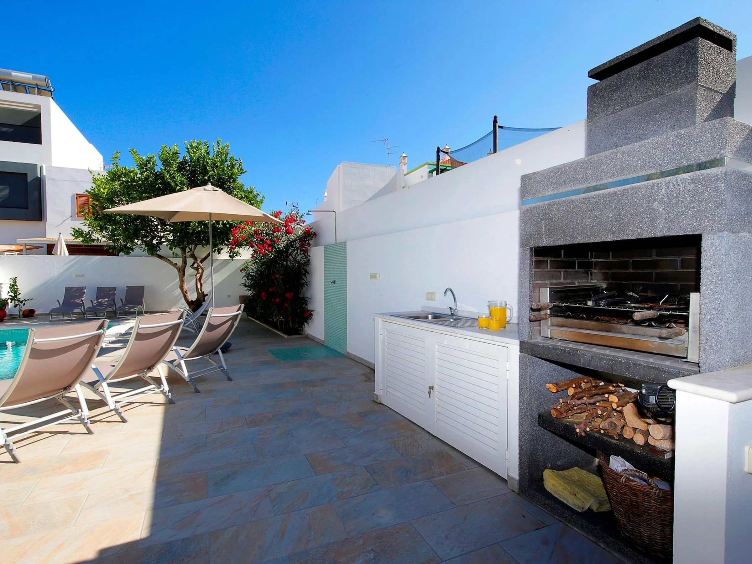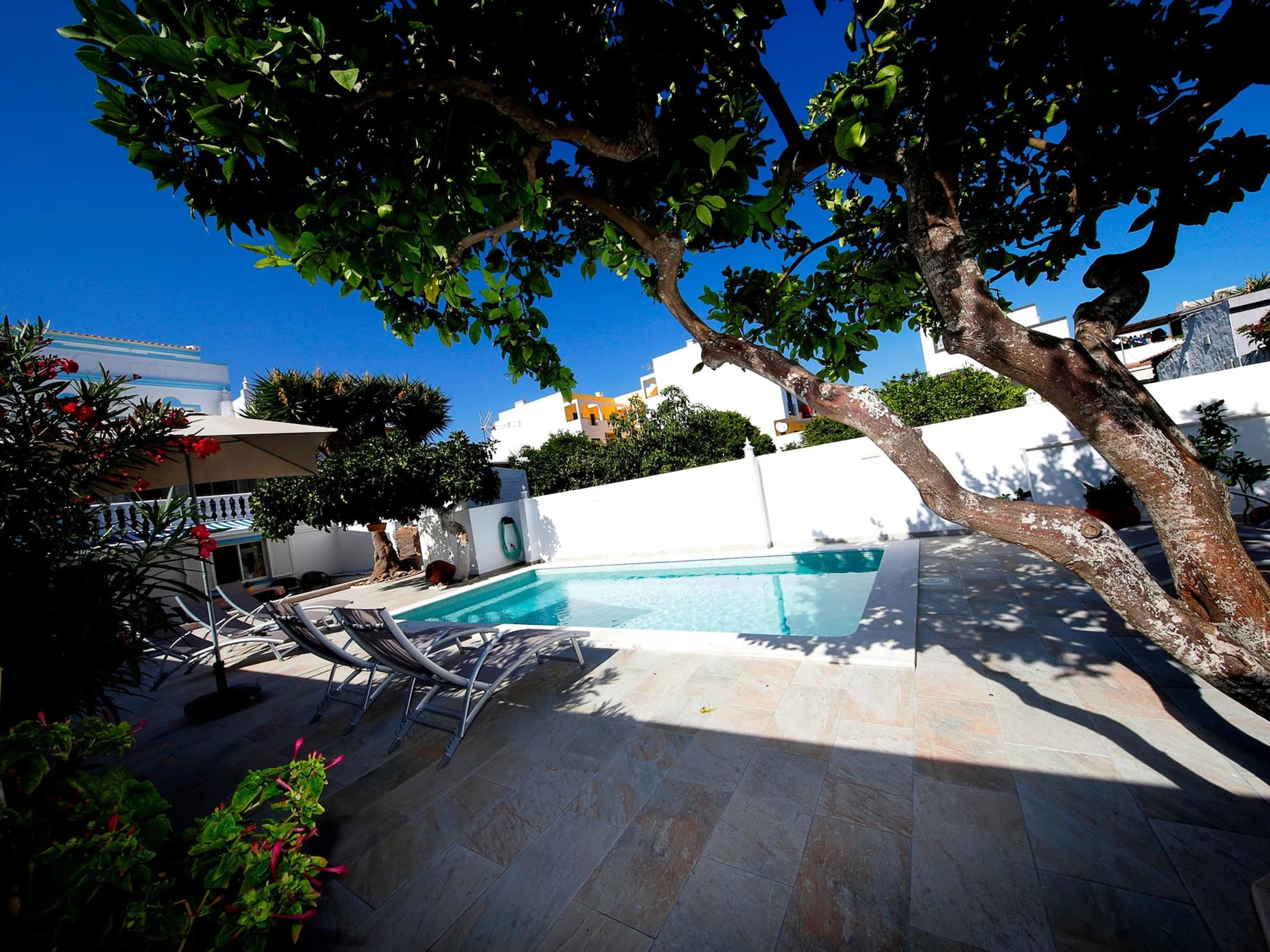 ESPACE EXTÉRIEUR L'espace du jardin arrière est un trésor rempli de surprises ! Un cadre parfait pour les familles qui souhaitent profiter du plaisir et du soleil. Les activités comprennent la magnifique piscine, bordée de jolies pierres de calçada, d'arbustes et d'arbres matures offrant une zone super relaxante ! Et après une matinée bien remplie, il est temps de faire un barbecue - l'endroit idéal pour déjeuner sous le célèbre citronnier qui a donné son nom à la maison. Ici, vous pouvez dîner à toute heure de la journée, à l'abri du soleil grâce à la tonnelle colorée. Plus tard, si vous recherchez votre propre espace, il y a de nombreux endroits pour vous reposer. 2 terrasses ensoleillées, la terrasse ombragée de la cuisine, une terrasse inférieure, mais bien sûr, vous pourriez aussi paresser toute la journée près de la piscine ?