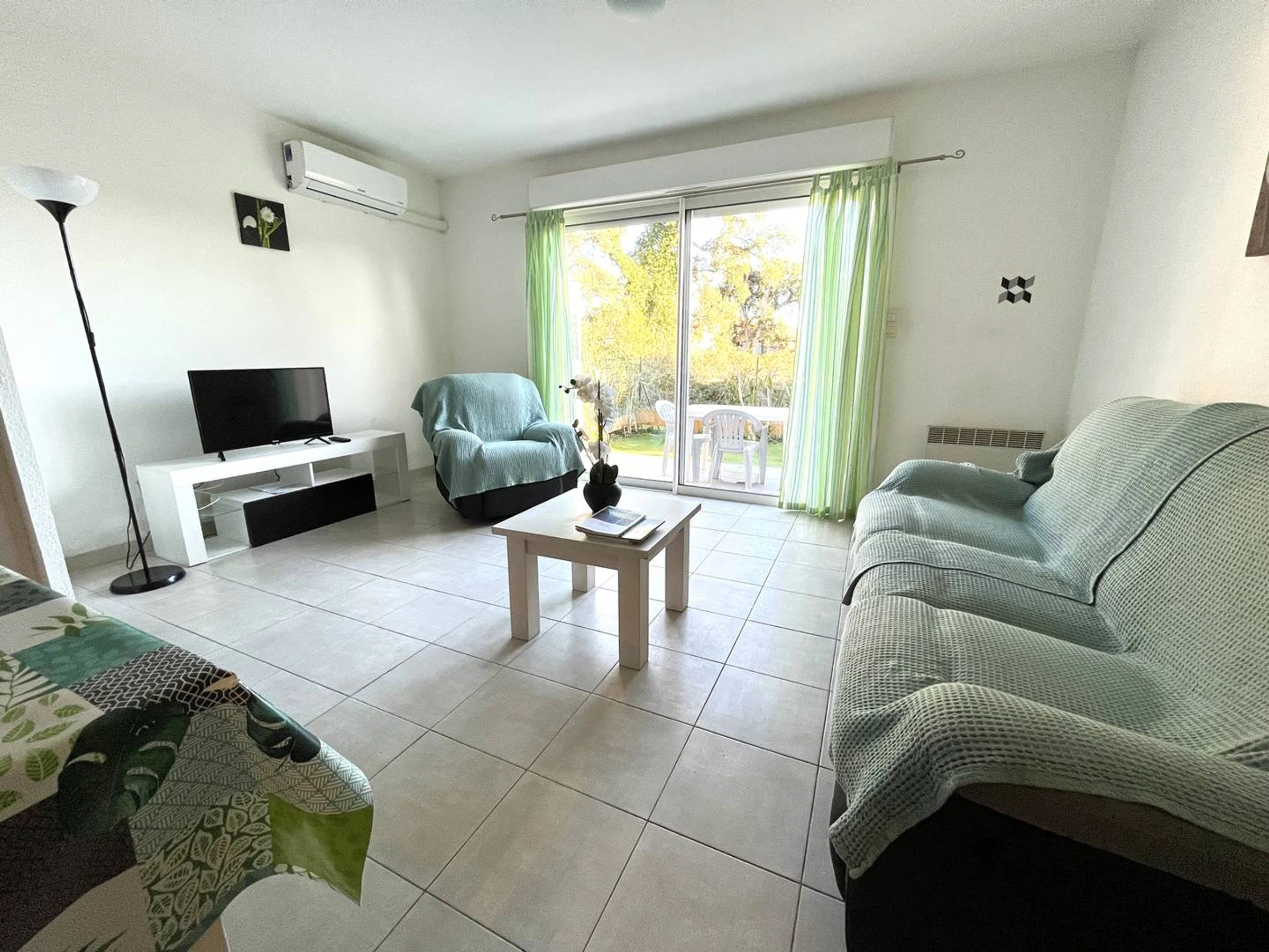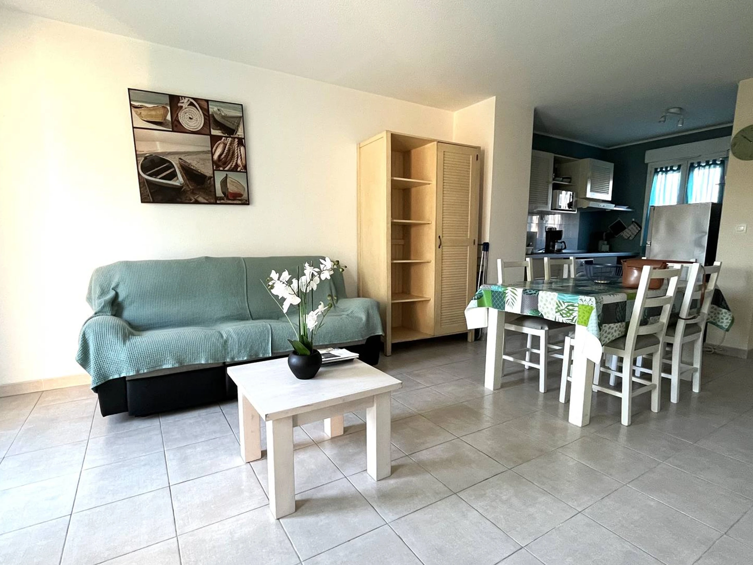 Confortable et lumineuse, sur deux niveaux, la mini villa de 65m² environ est composée en bas d'un séjour-salle à manger avec télévision, d'une cuisine ouverte sur le séjour, d'un wc indépendant et d'une terrasse avec petit jardinet;