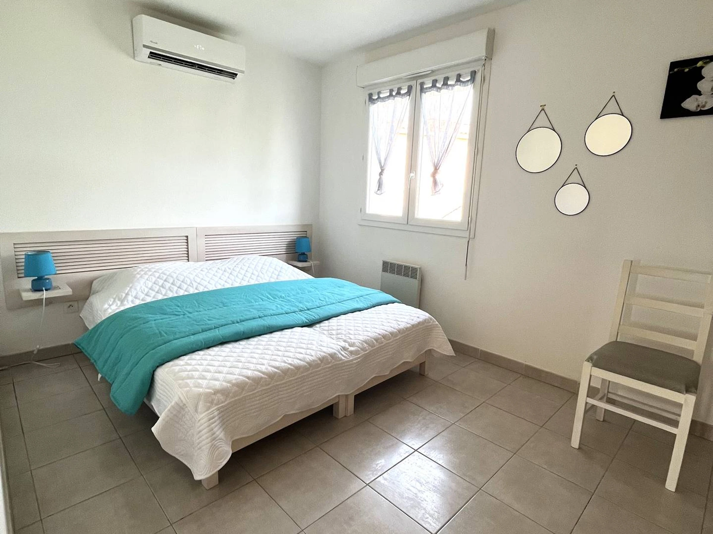 A l'étage deux chambres avec placards, lits en 80 pouvant être réunis pour former un couchage double en 160 et une salle de bain avec wc. Toutes les chambres sont climatisées.
