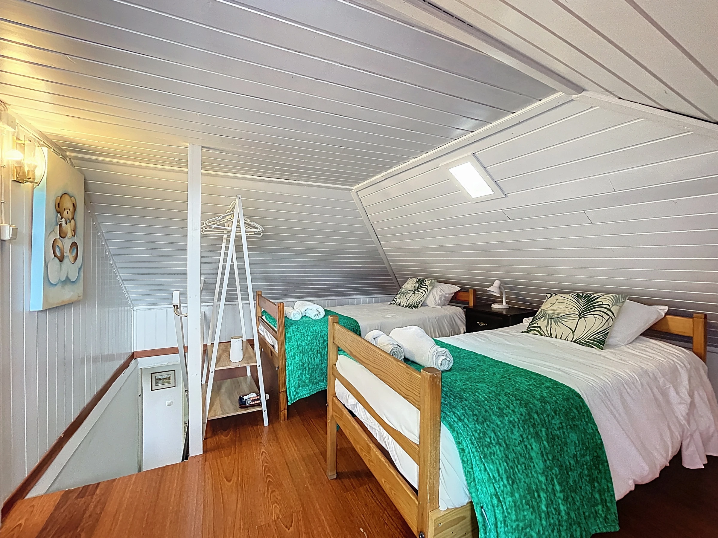 La maison accueille jusqu'à cinq clients répartis dans trois chambres : une avec un lit queen-size, une avec un lit simple et une chambre mansardée avec deux lits simples. Il y a une salle de bain équipée d'une douche. Le linge de lit et les serviettes de bain sont fournis pour votre séjour.