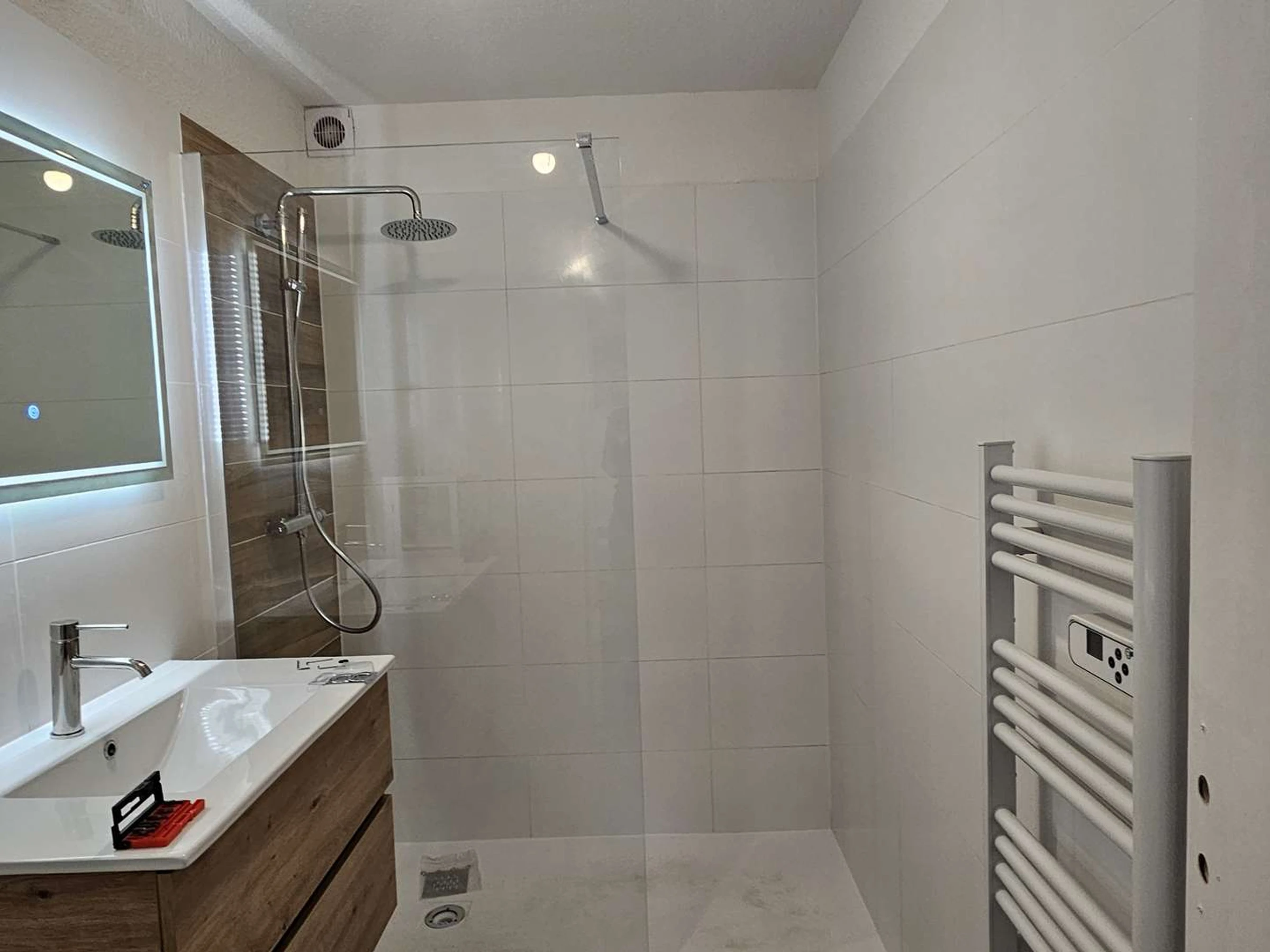 Salle d'eau : douche à l'italienne, vasque, WC, sèche-serviettes