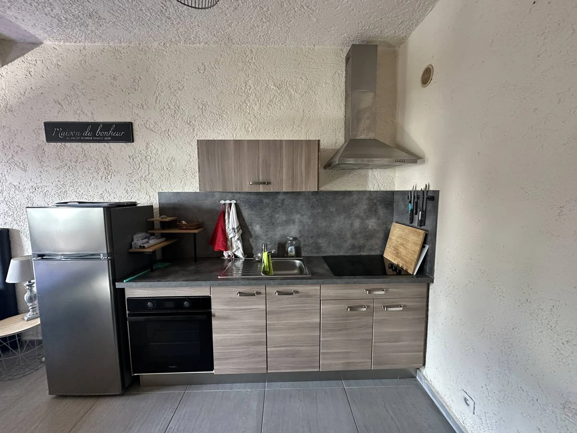 Séjour / Cuisine : Table +4 chaises, combiné réfrigérateur congélateur, plaques de cuisson électrique, micro-ondes/four , grille-pain, machine à café, lave-linge, rangements, canapé lit convertible (140), 1 lit 2 places en 160, Télévision.