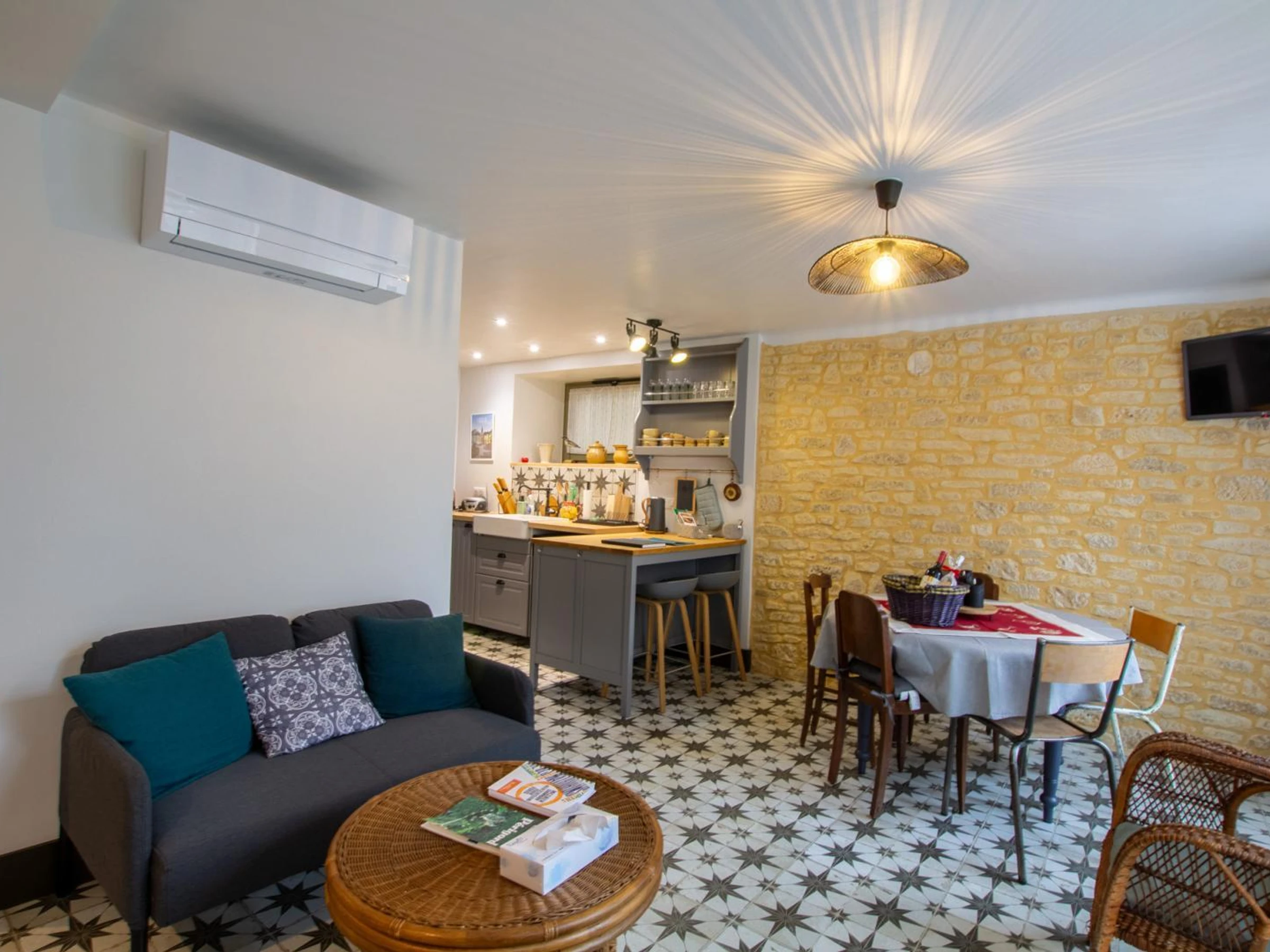 Maison à étage dans le centre ville de Sarlat entièrement climatisée. Vous entrez par la pièce à vivre, salon (tv, wifi), salle à manger, cuisine (four, vitrocéramique, combiné congélateur...), WC indépendant.
