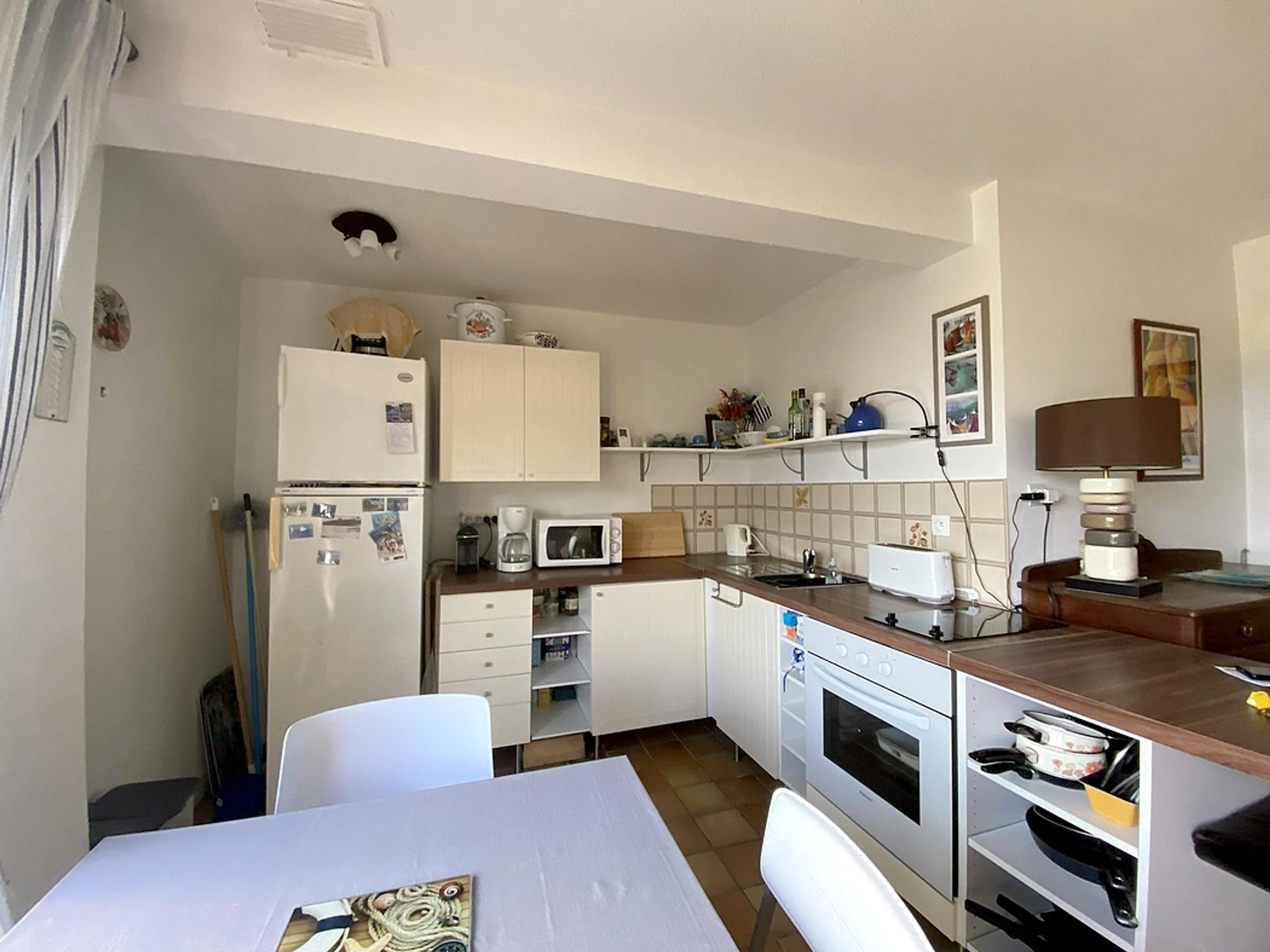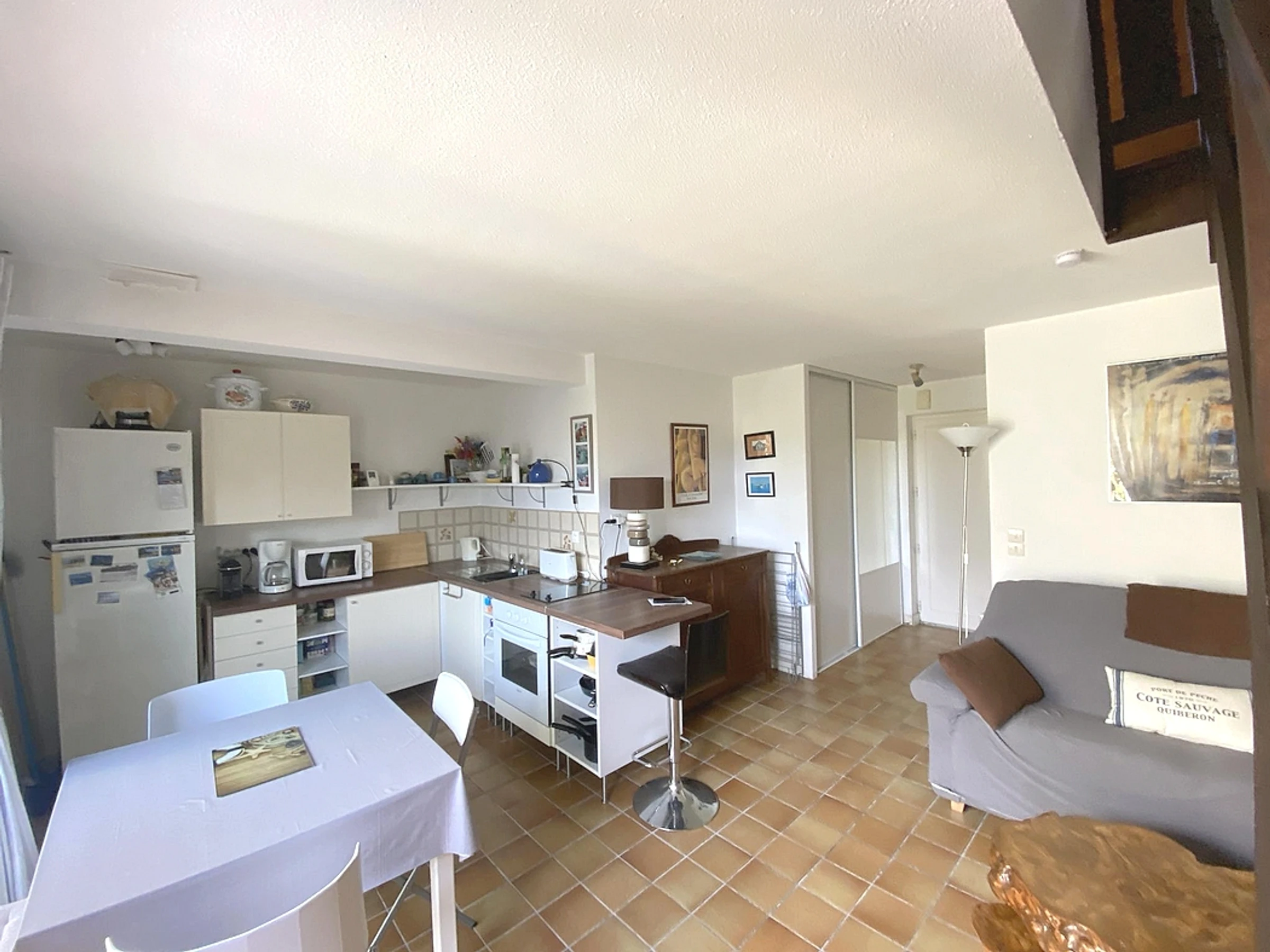 Salon/salle à manger lumineux avec cuisine équipée et aménagée