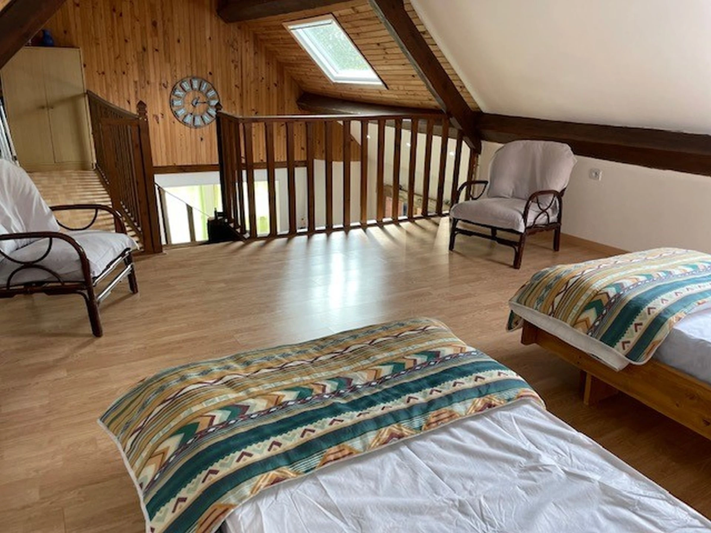 A l'étage (escalier en colimaçon) : mezzanine (2 lits 90) avec armoire (penderie et étagères). Le velux au-dessus de l'escalier menant à la mezzanine n'a pas de store occultant.