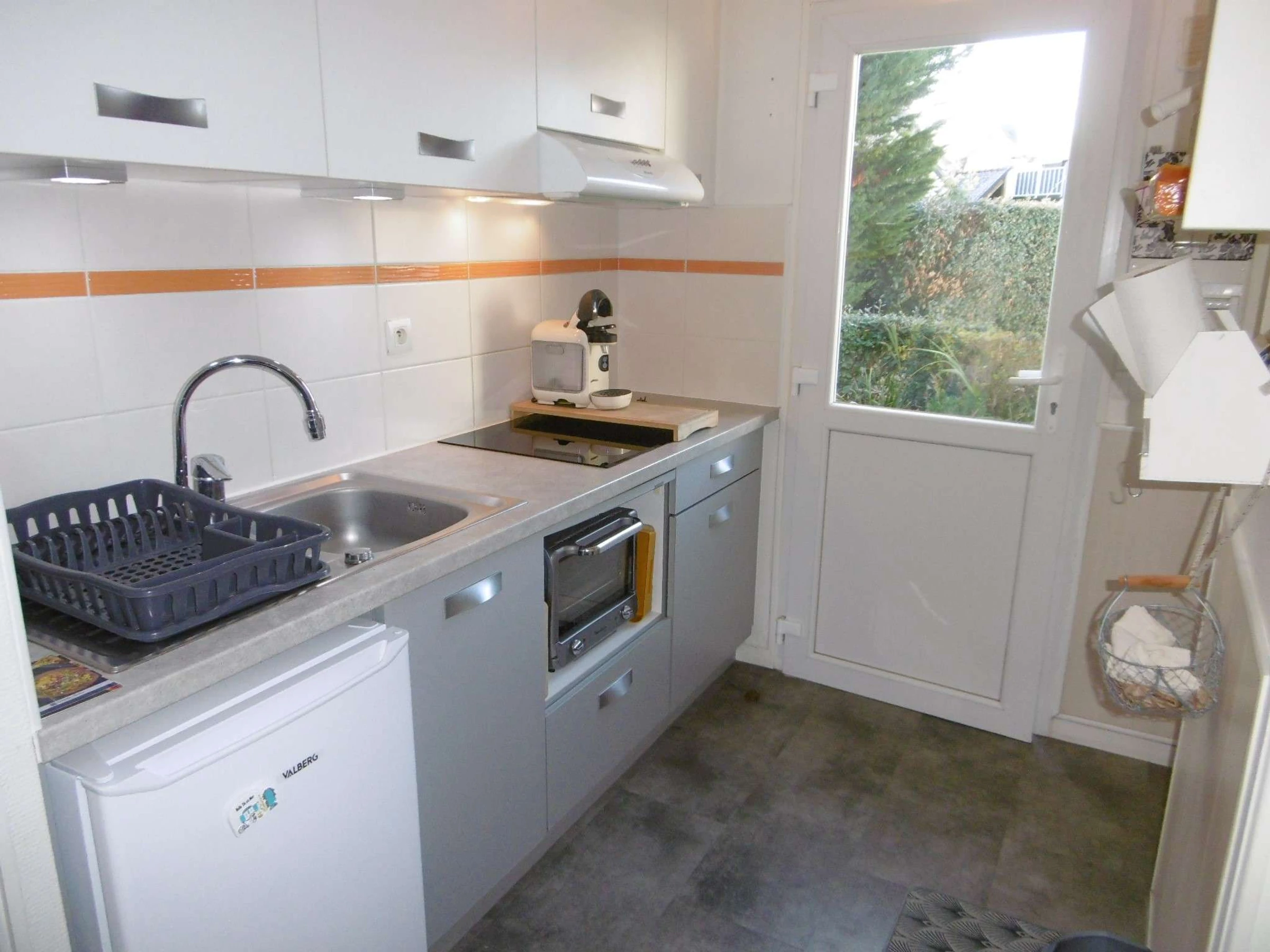Equipement : réfrigérateur, four électrique, 3 plaques à induction, lave-linge, cafetière, grille-pain, TV.